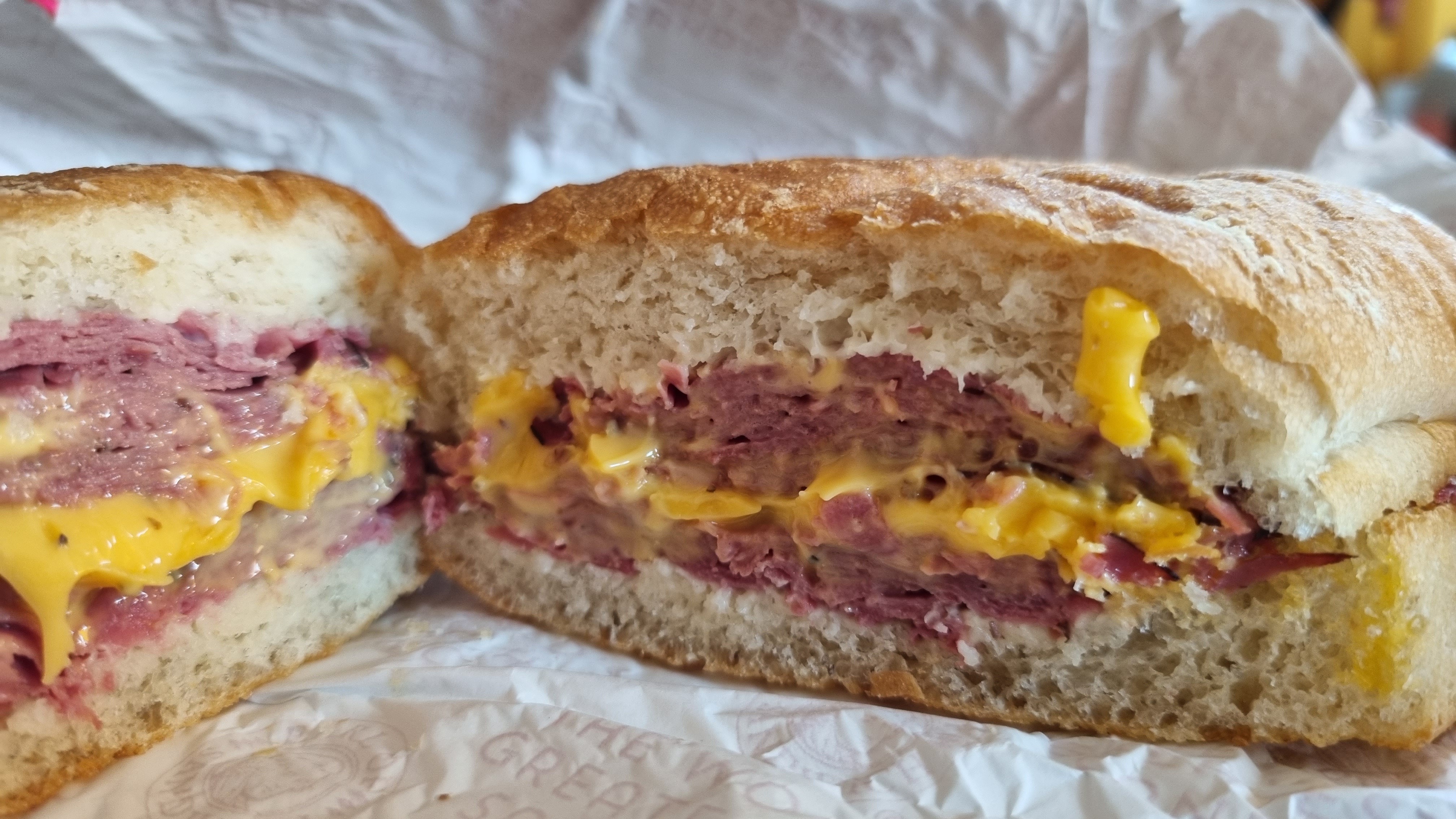 로스트 비프, 체다, 홀스레디쉬 소스 조합임.