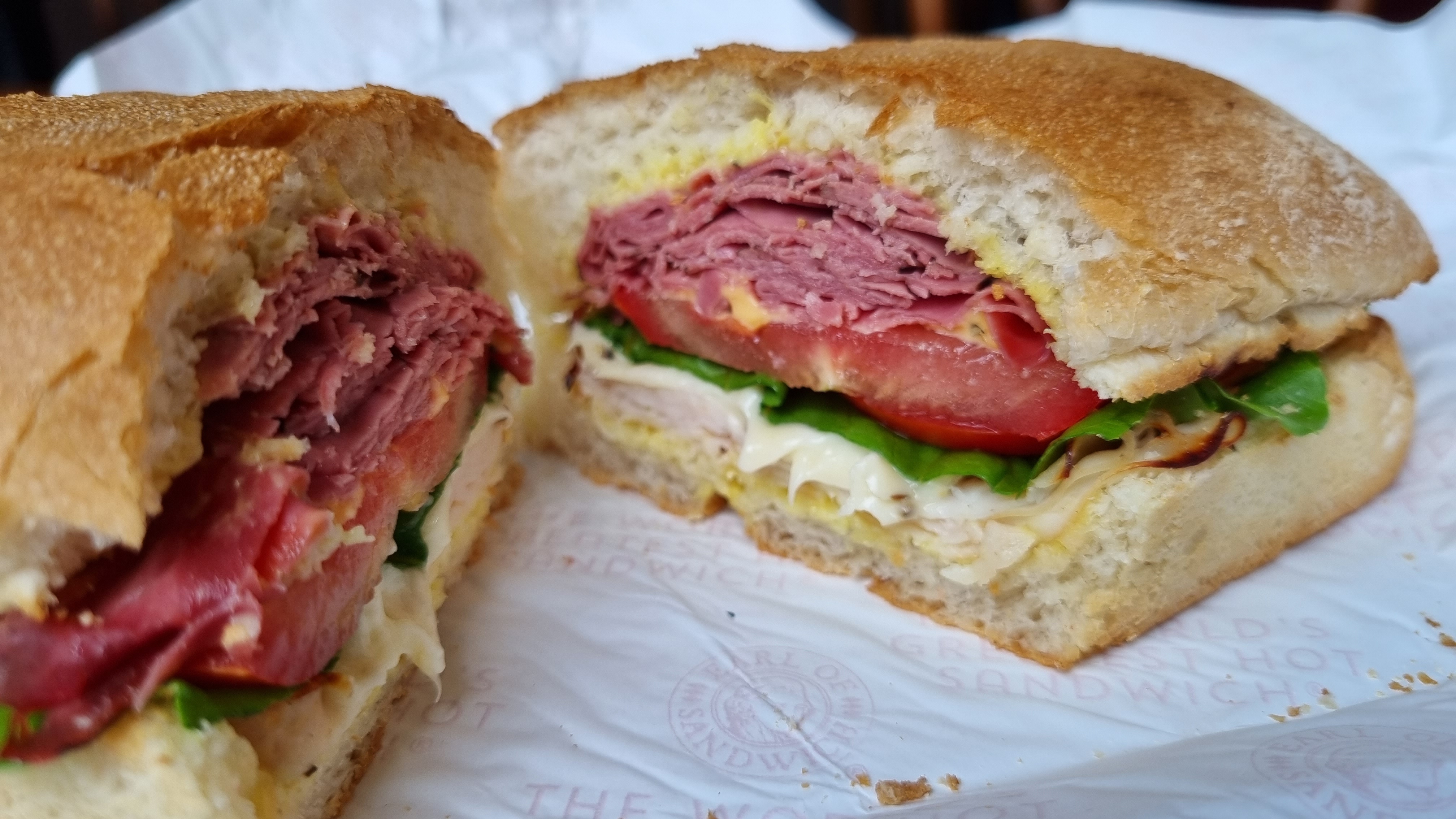 로스트 비프, 치킨, 스위스 체다, 상추, 토마토, 머스타드 소스 조합임.