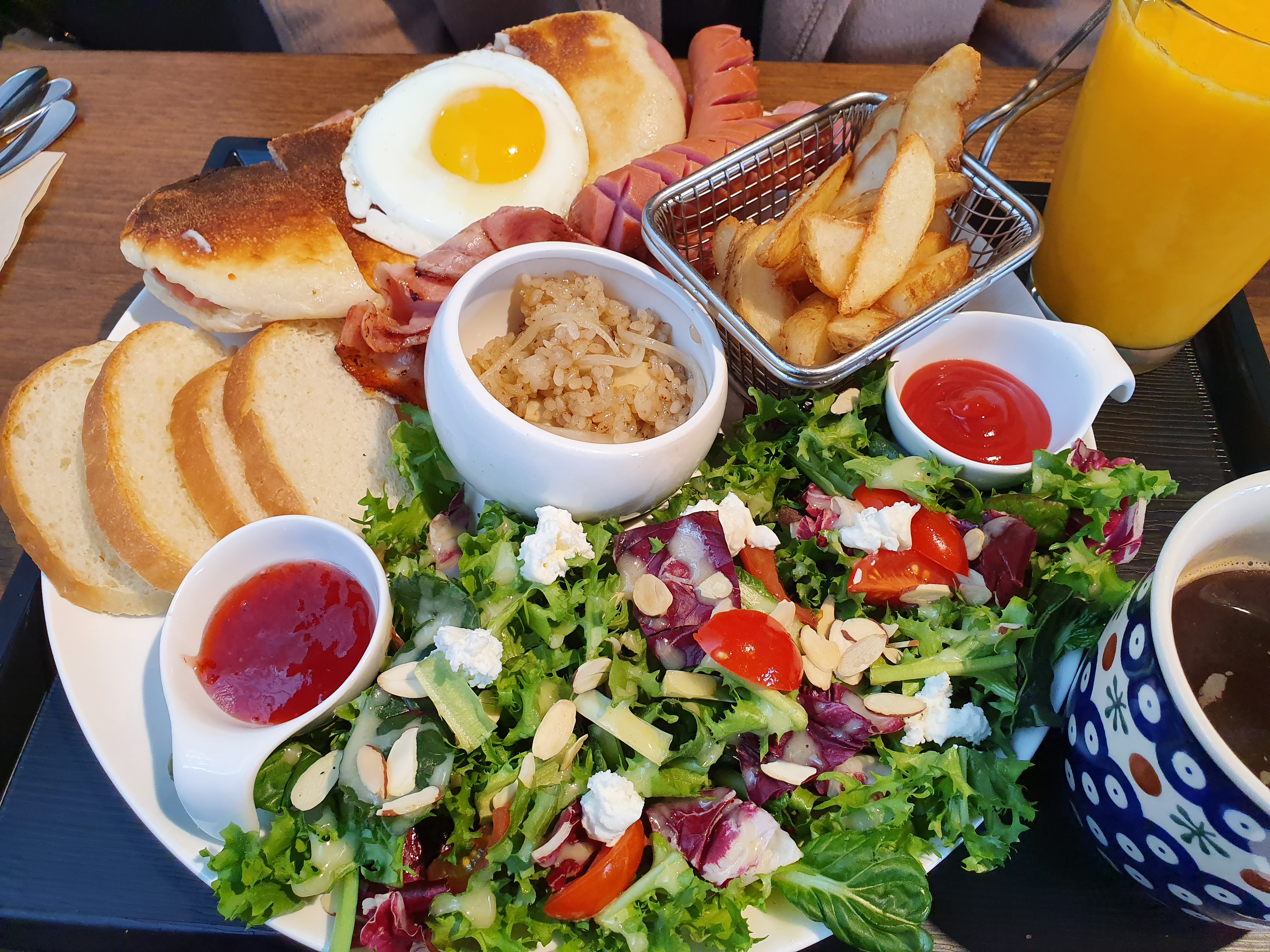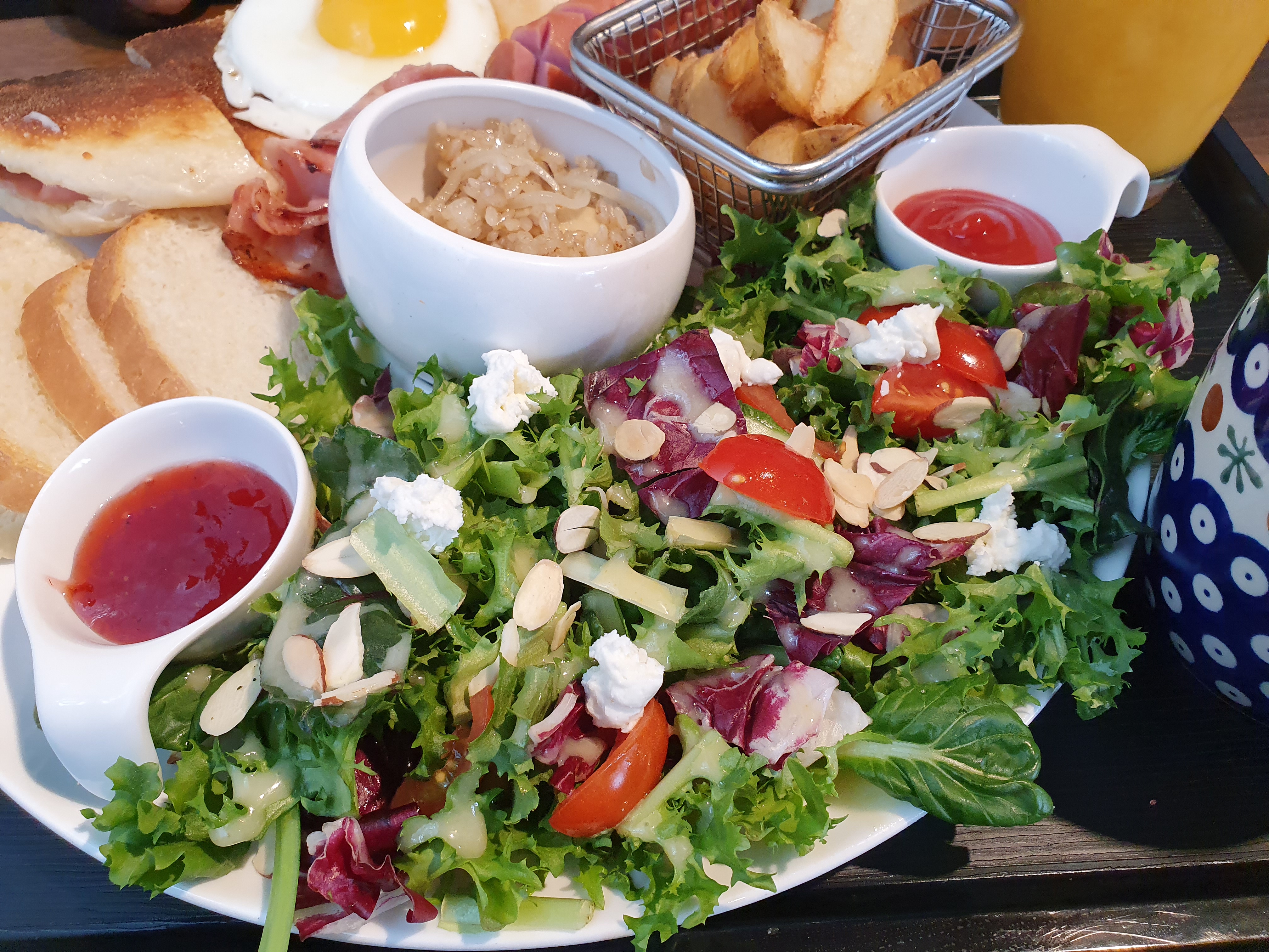 구성품은 빵, 볶음밥, 리코타 치즈 샐러드, 웨지감자, 소세지, 베이컨, 파니니, 계란 후라이이다.