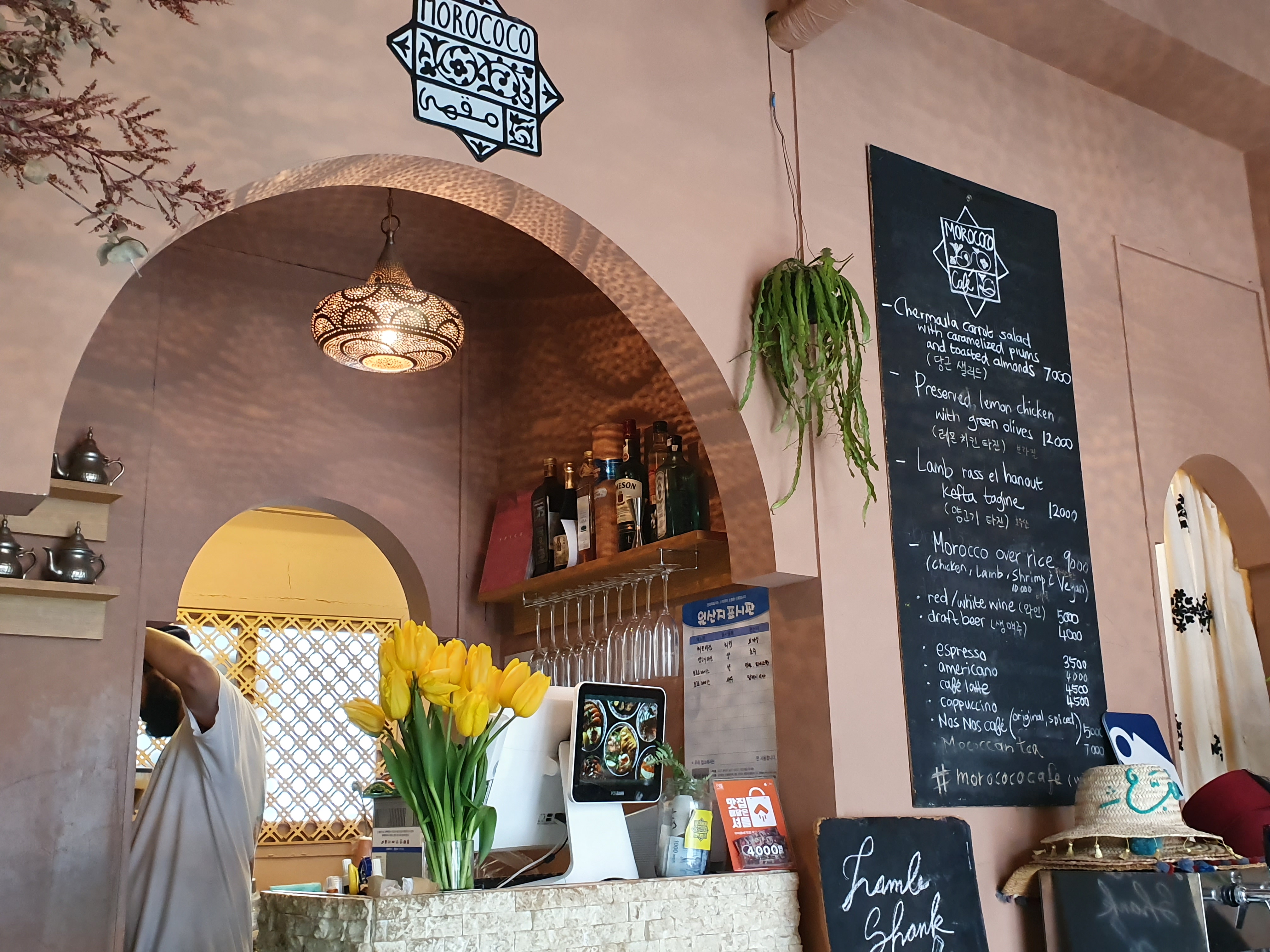 카운터쪽의 아치형으로 벽, 노란 튤립, 벽의 색상, 그리고 분필로 작성한 메뉴판까지.