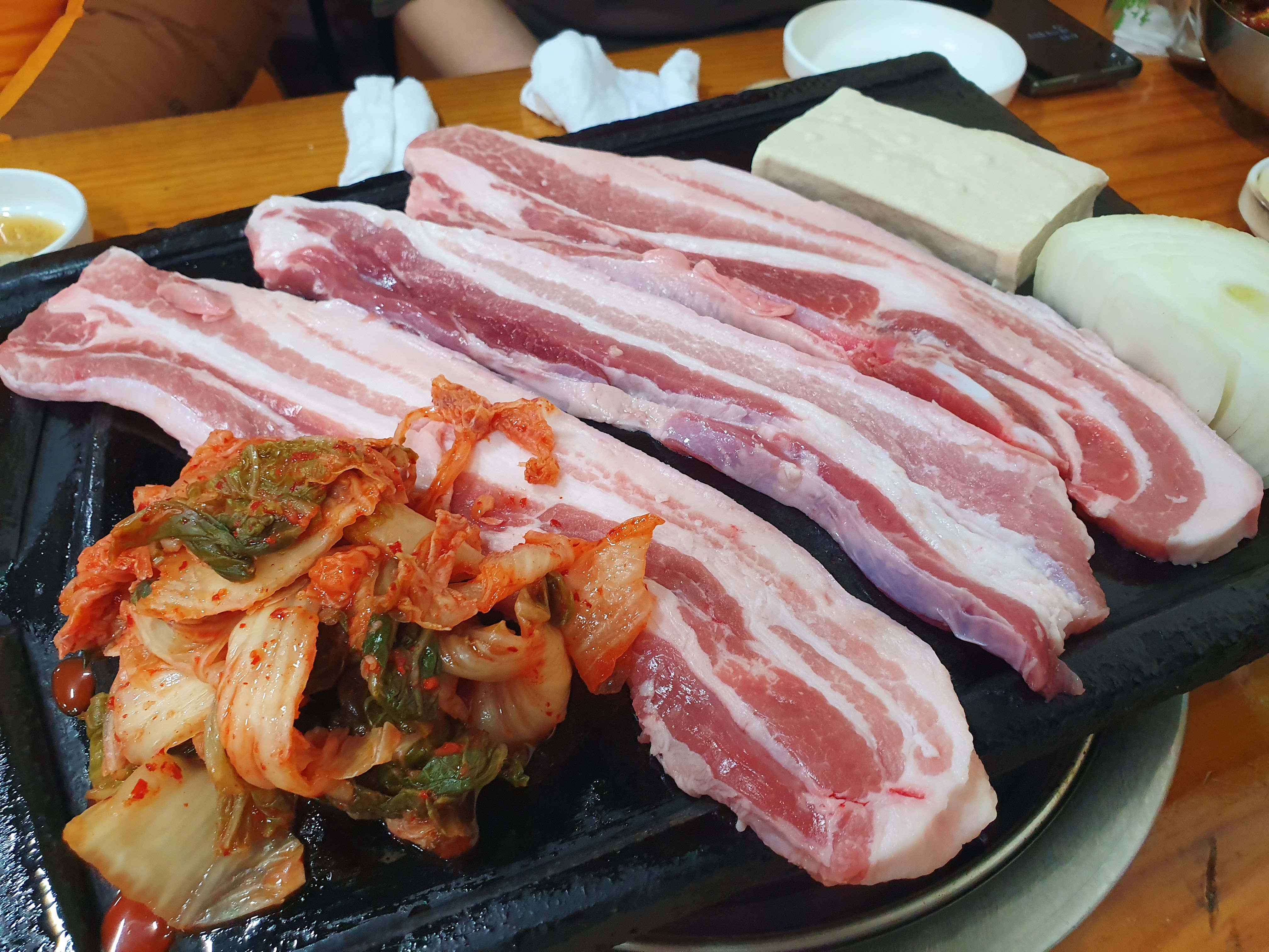 초벌이 되어 나오는데, 삼겹살의 기름진 맛이 이미 입 안에 충분히 배어서인지...