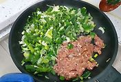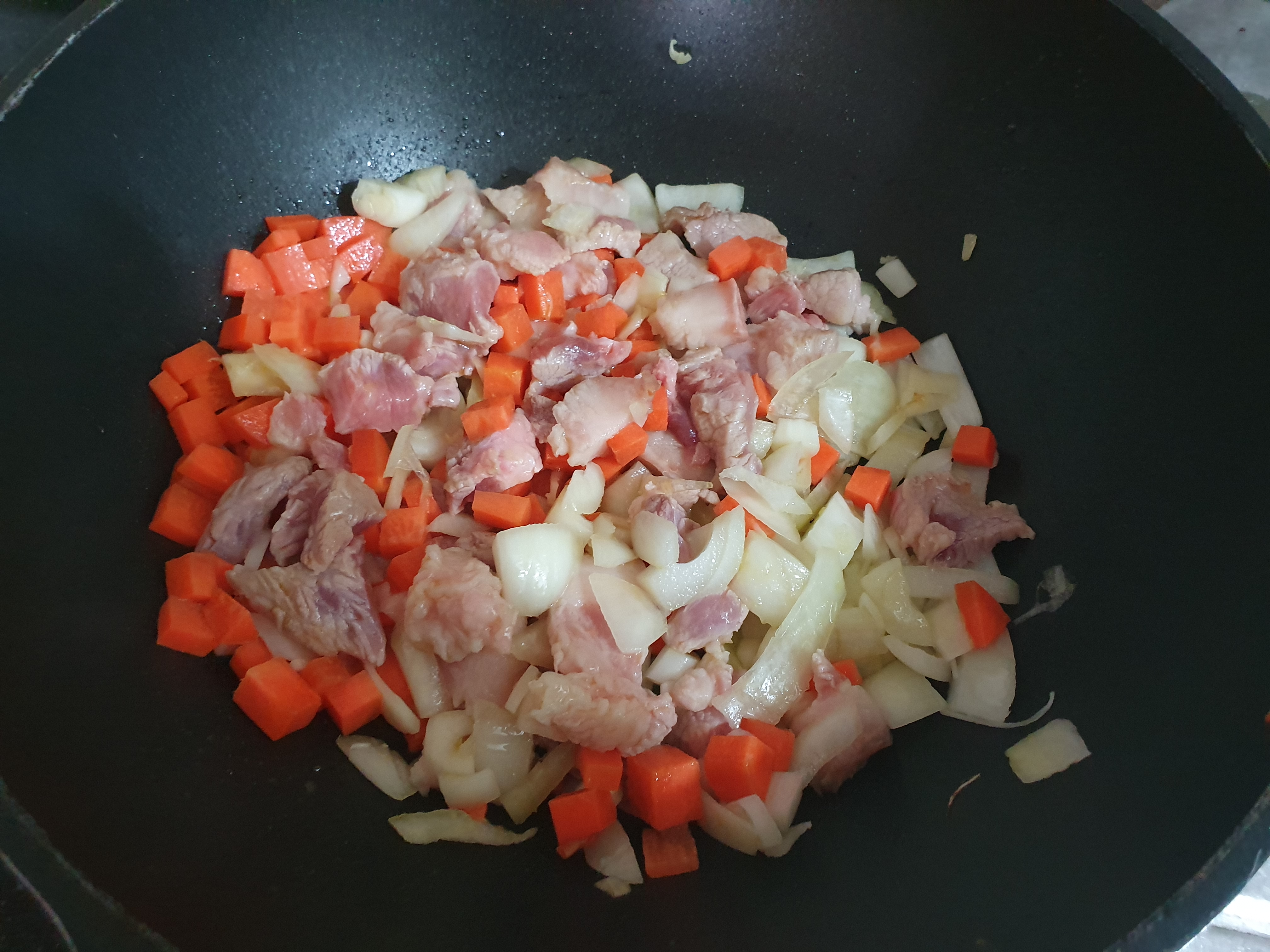 고기의 익는 속도를 생각하면 고기부터 조금 볶고 시작하는 것이 더 좋을 수도 있다.