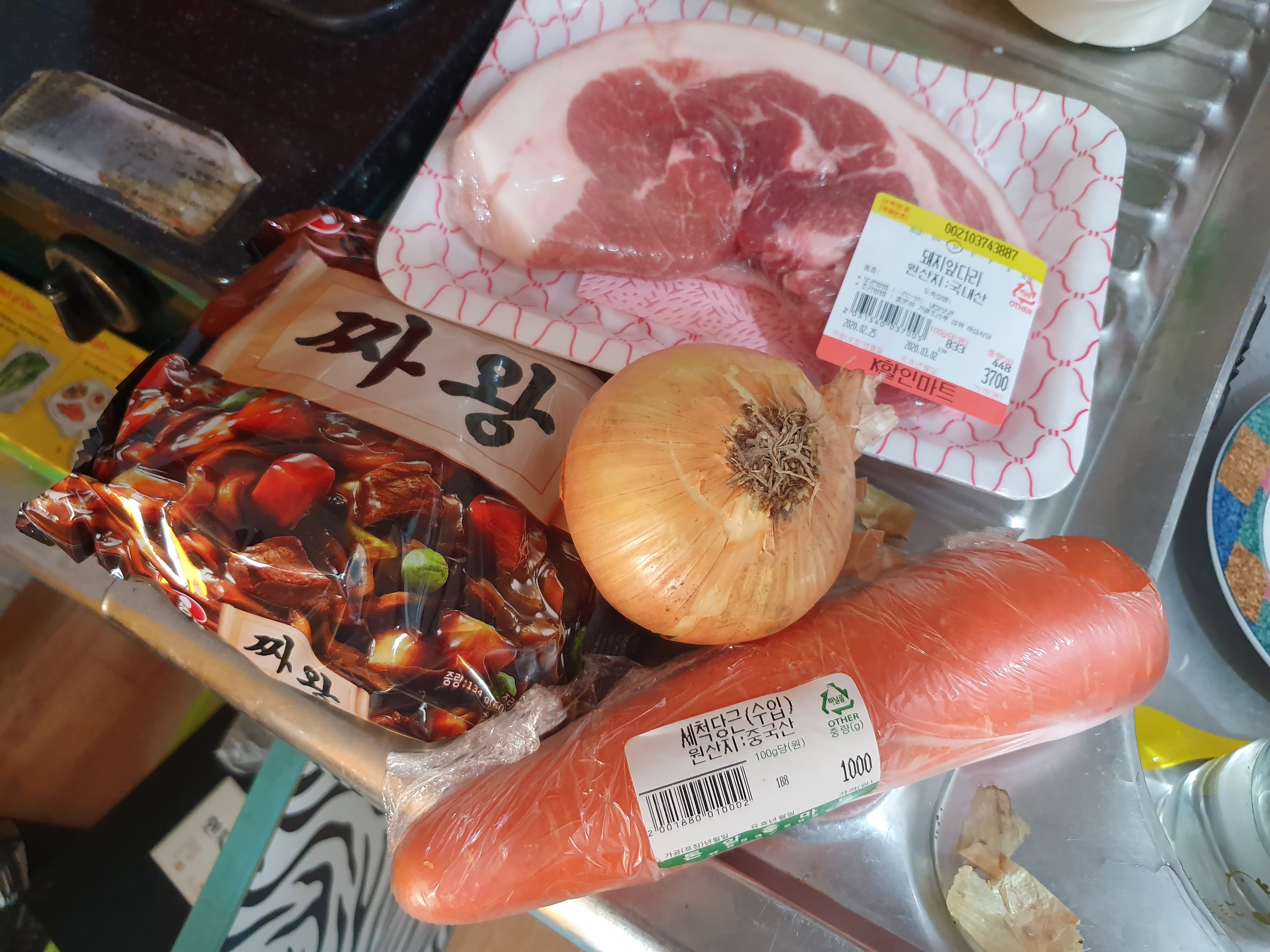 돼지고기, 당근, 양파, 짜왕, 올리브유.