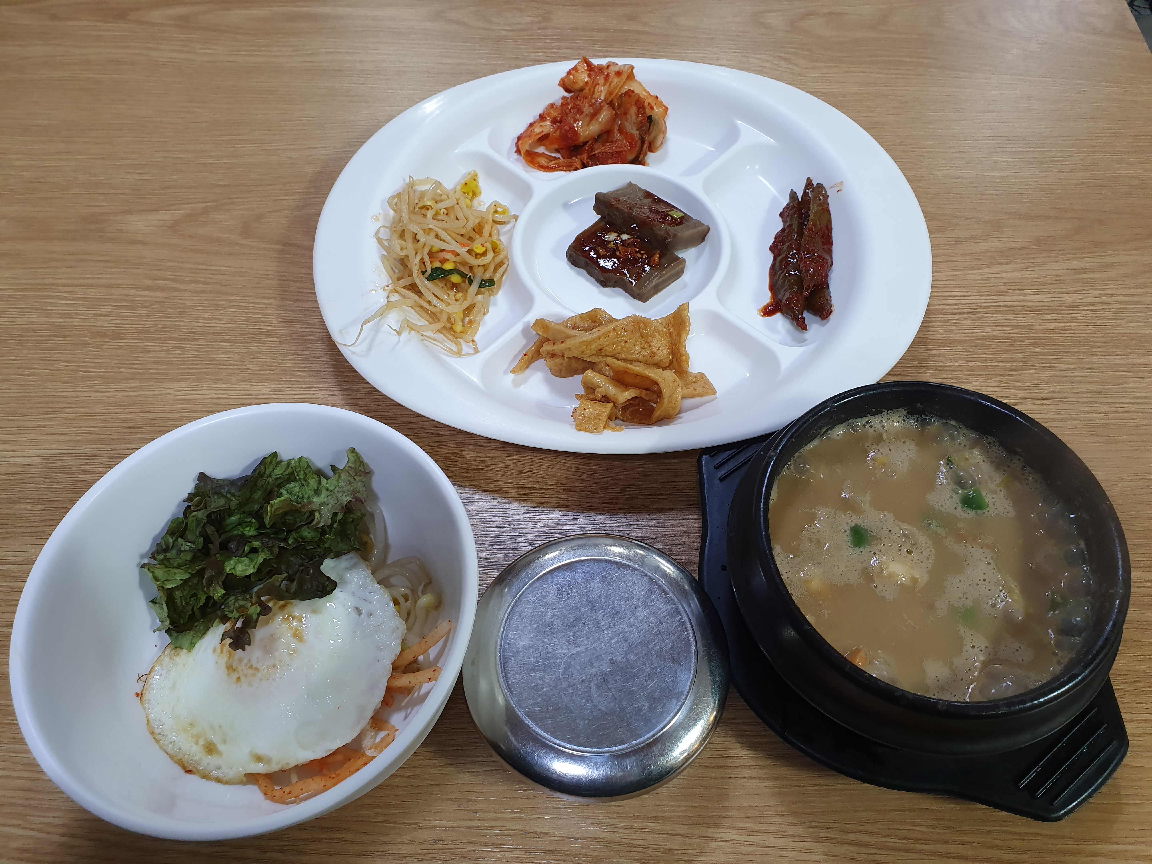비벼먹을 수 있게 콩나물, 무생채, 상추, 계란 후라이가 들어간 비빔 그릇도 함께 주신다.