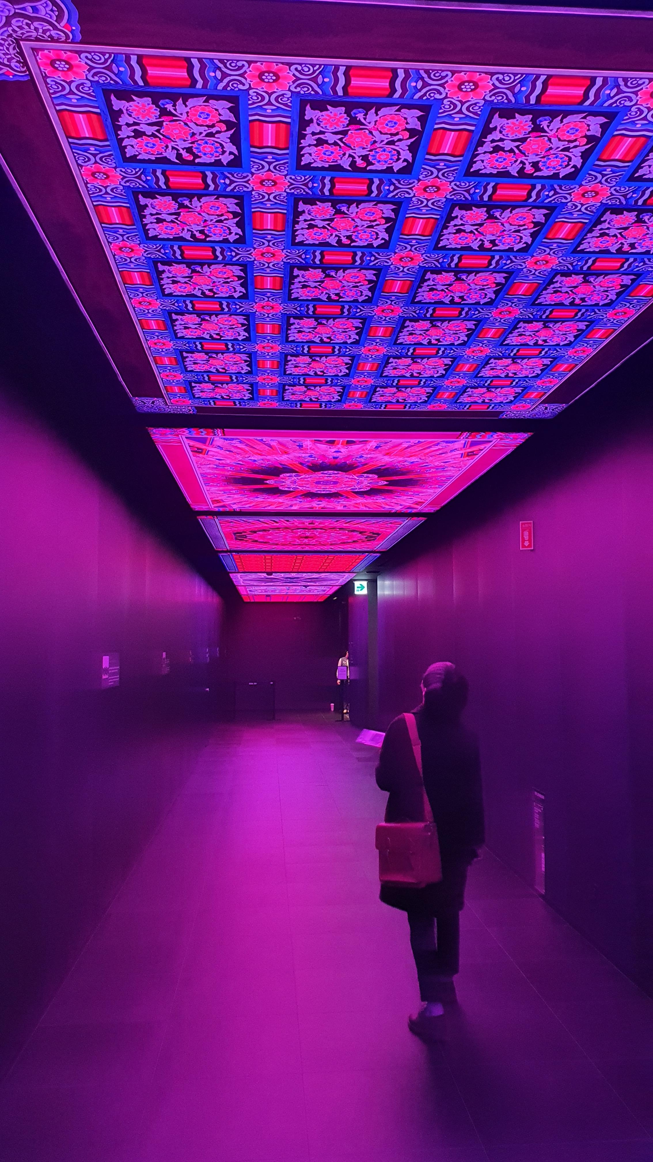 엘레베이터 타기 직전 한국의 전통 천장 장식 무늬를 보여준다.