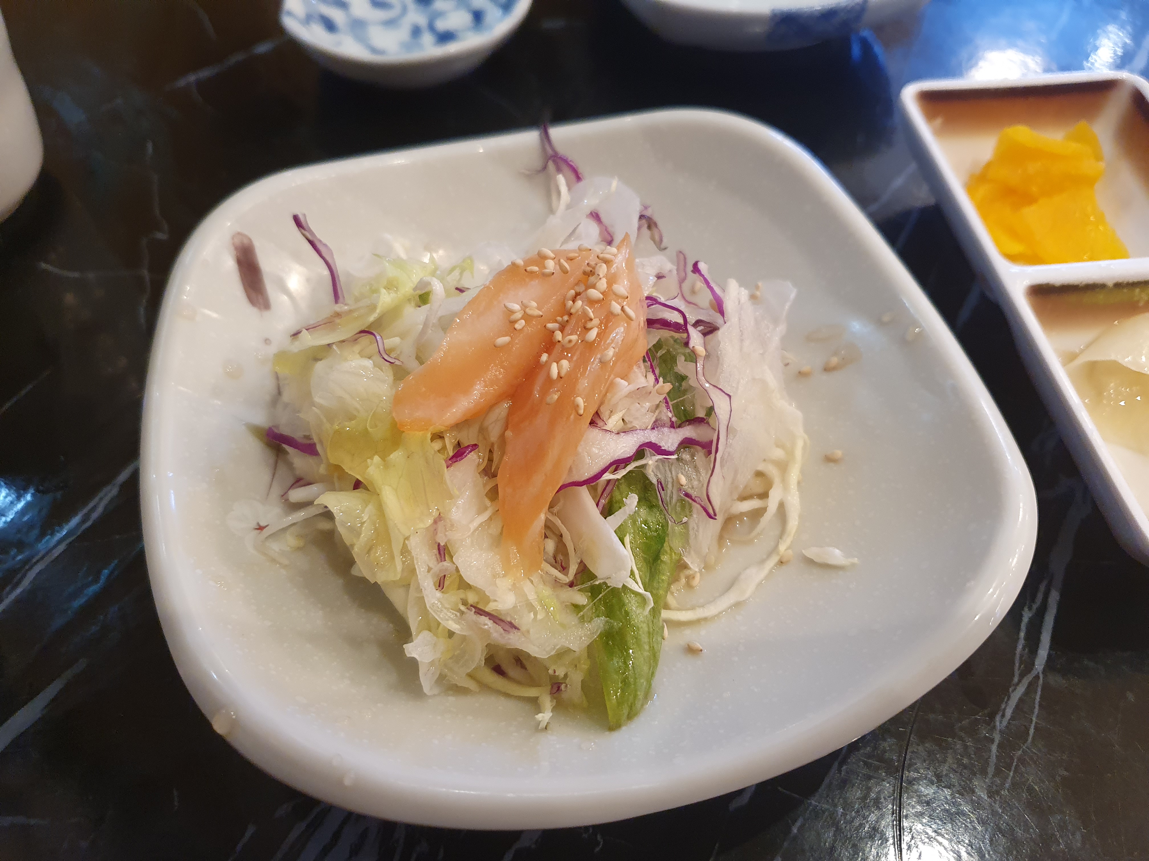 가장 먼저 나온 것은 연어 두점이 귀엽게 올라간 샐러드.