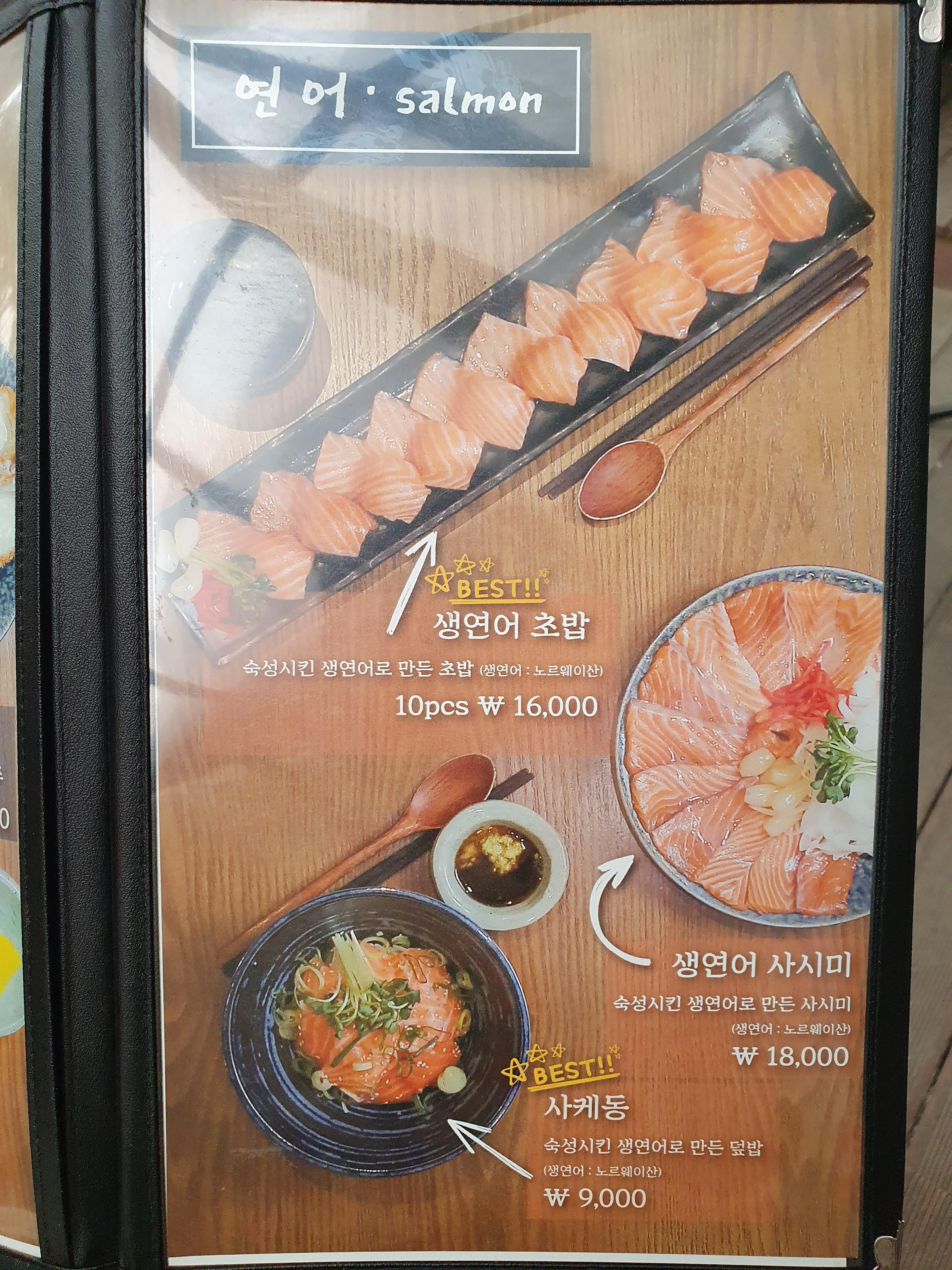 나는 사시미보다는 초밥을 좋아하므로 연어초밥을 주문하고,