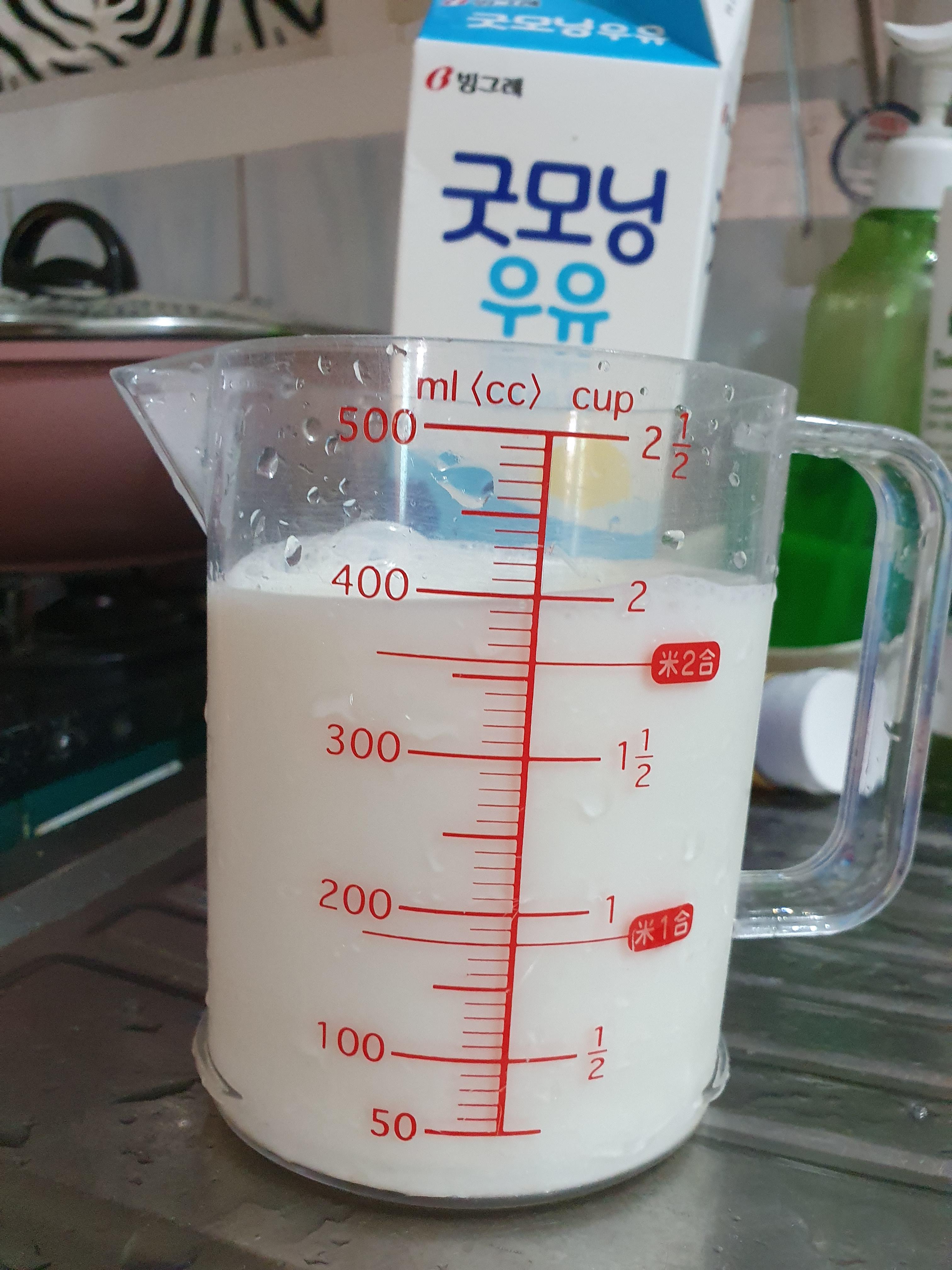 유튜브에 나온 레시피는 우유 400ml + 설탕 4 아빠스푼 + 감자 전분 2 아빠스푼.