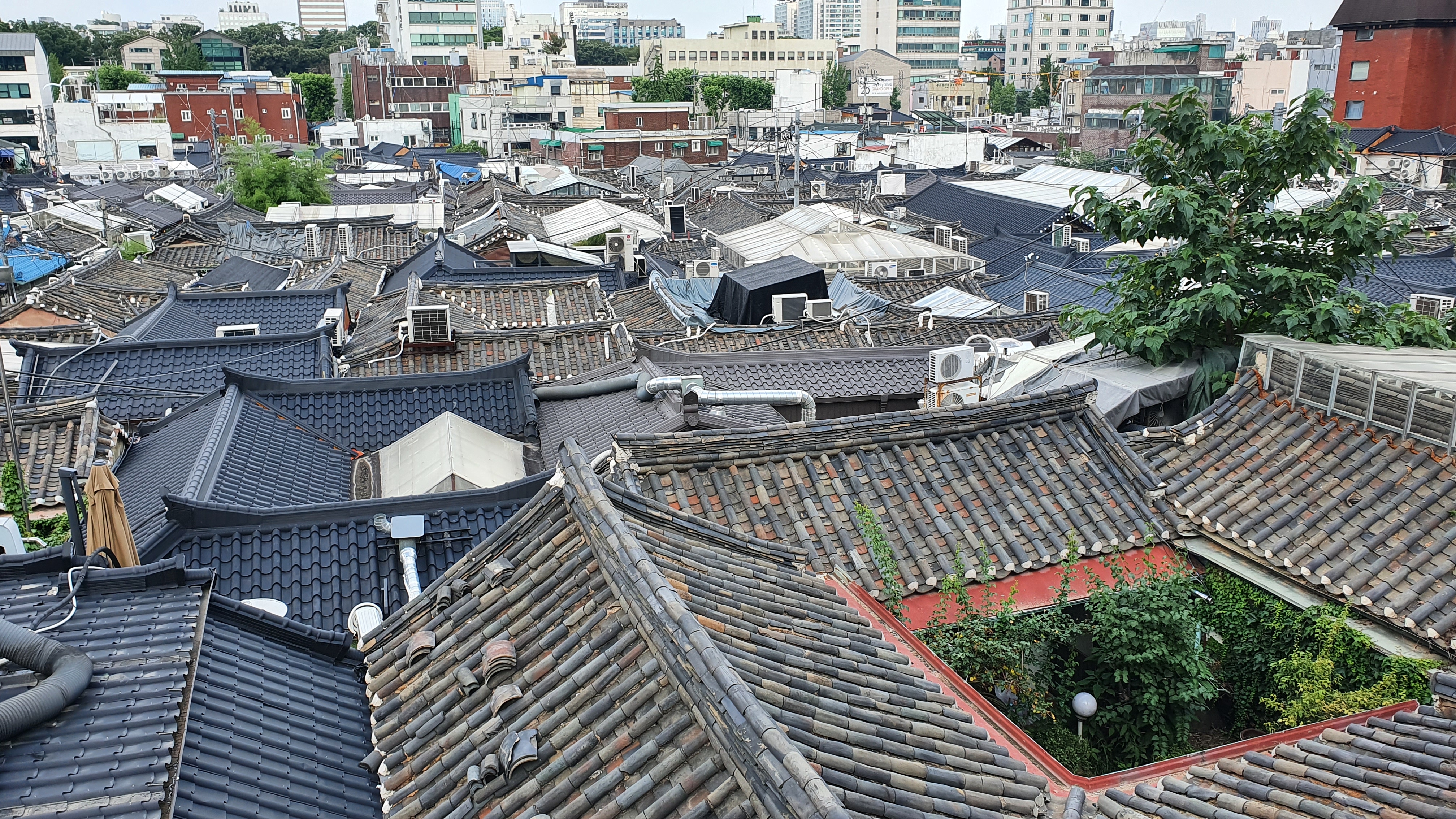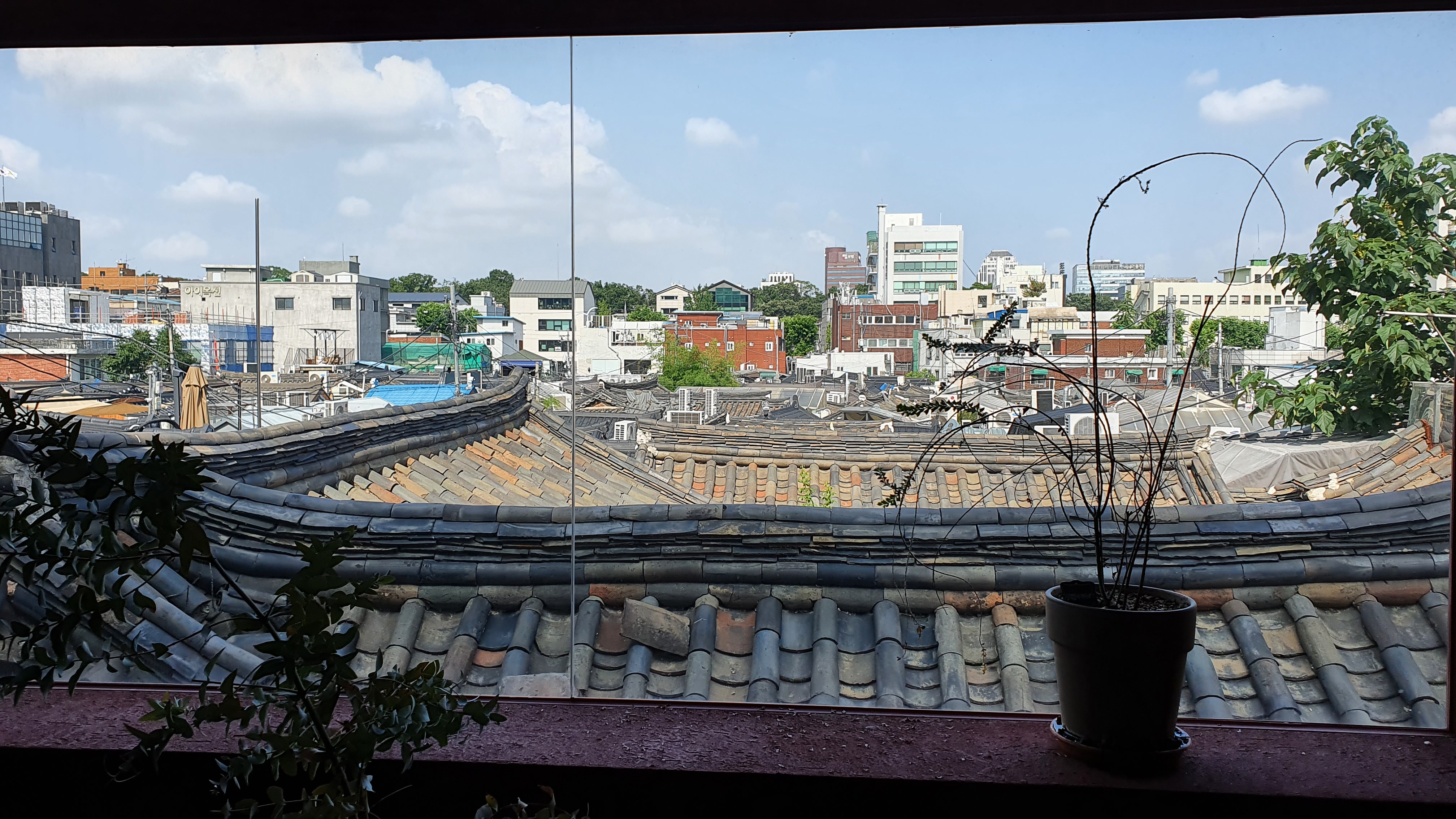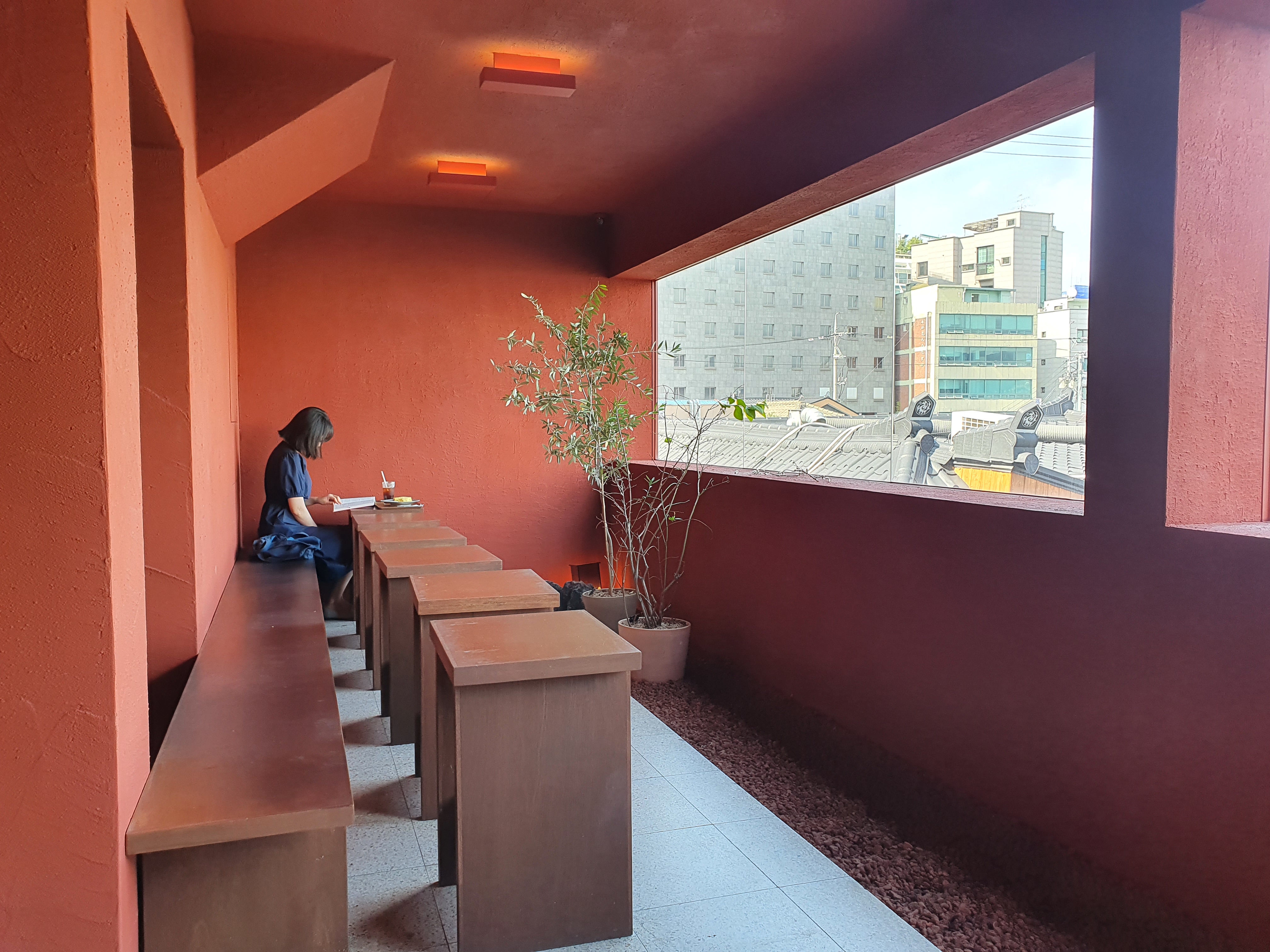 2층은 붉은 벽과, 기와 지붕 파노라마 뷰를 볼 수 있다.