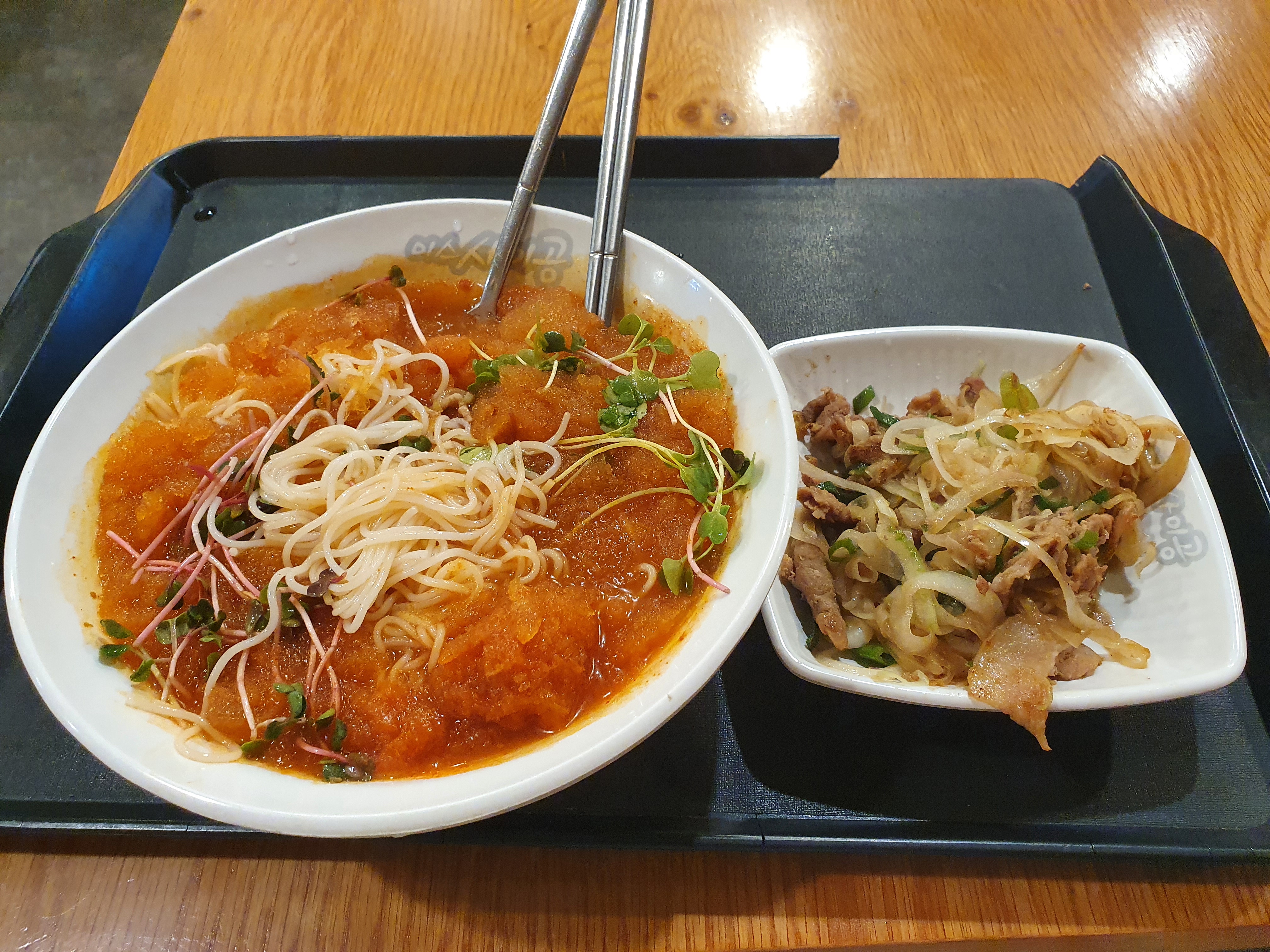 양파와 볶은 불고기식 고기, 살얼음 동동 매콤한 국수와 국물. 그리고 쌉쌀한 새싹의 조화로