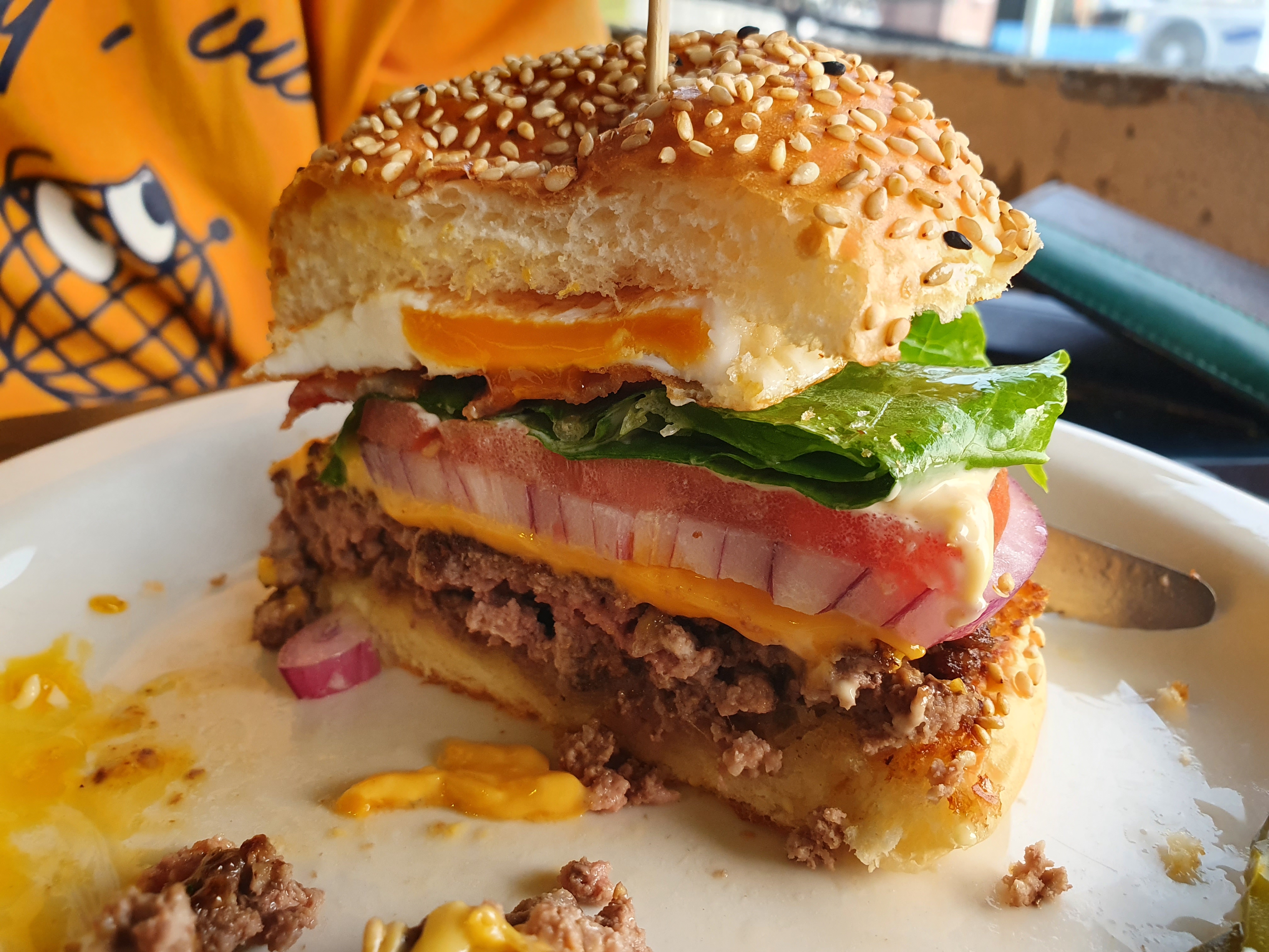 쇠고기 패티, 아메리칸 치즈, 적양파, 토마토, 로메인 상추, 베이컨, 계란 프라이, 홈메이드 소스.
