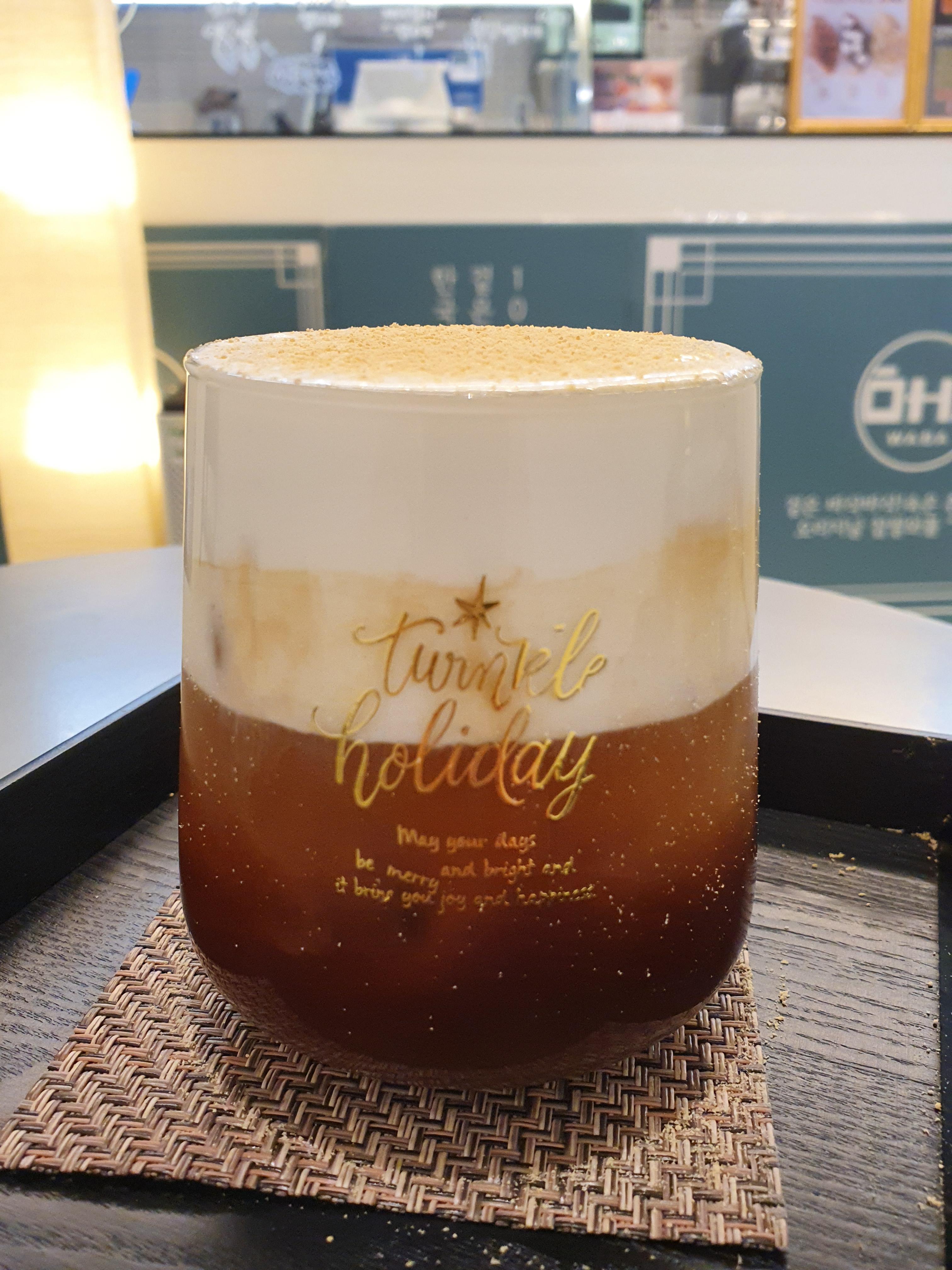 잔도 너무 이쁘고, 설탕 섞인 콩가루가 금가루처럼 뿌려져 있으며, 크림은 잔의 반..