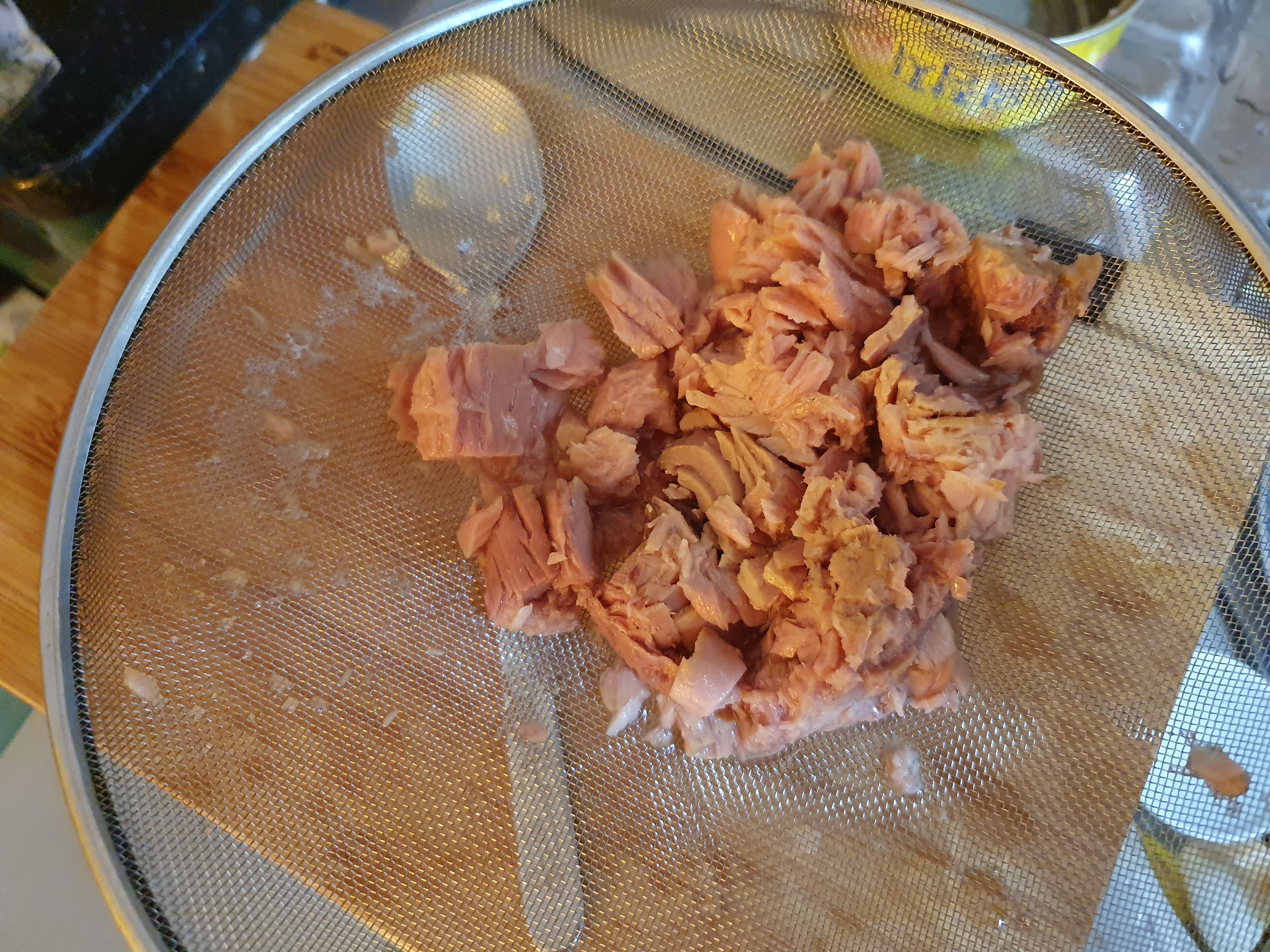채반에 참치캔을 투하하여 기름을 좀 빼준다.