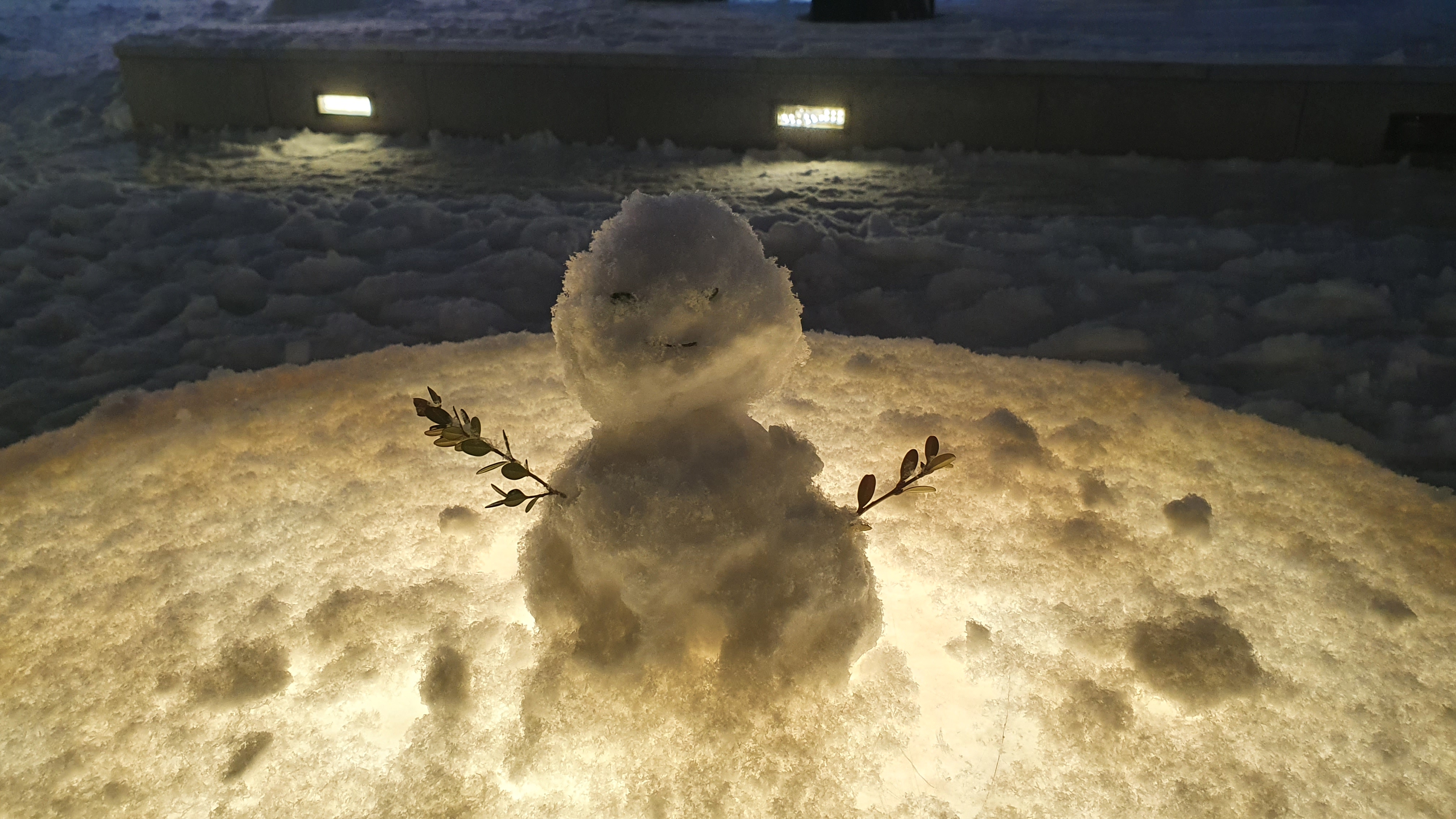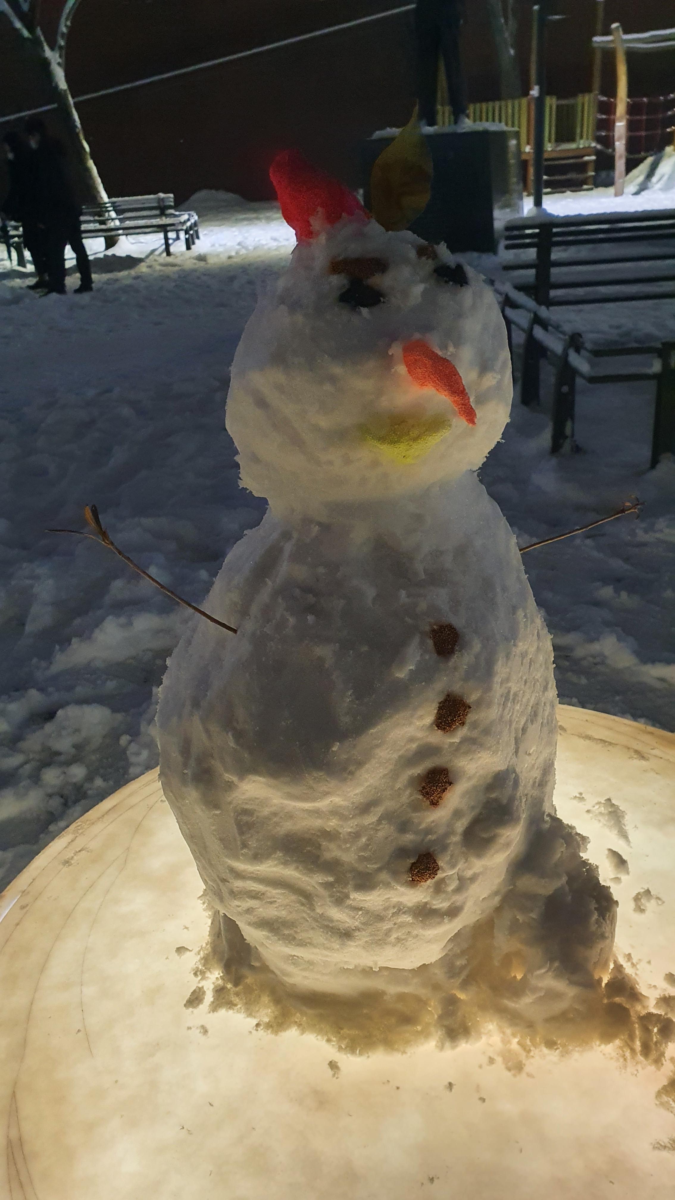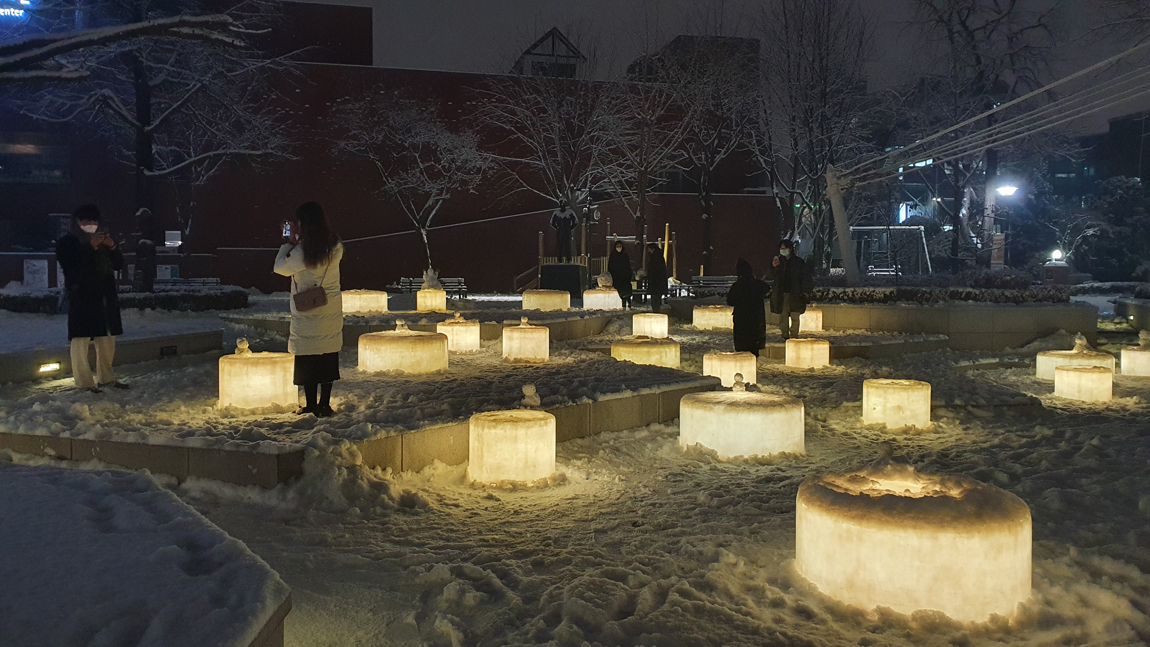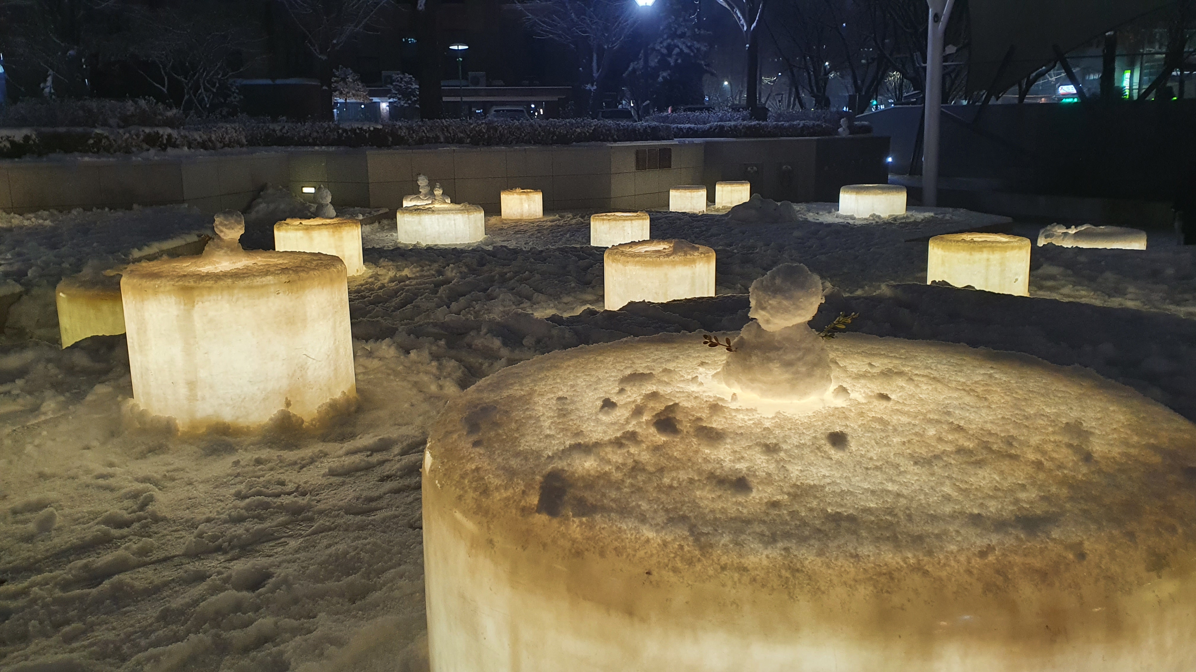 사람들은 불빛이 나오는 의자 위에 눈사람을 각자의 개성 따라 만들어 놓는다.