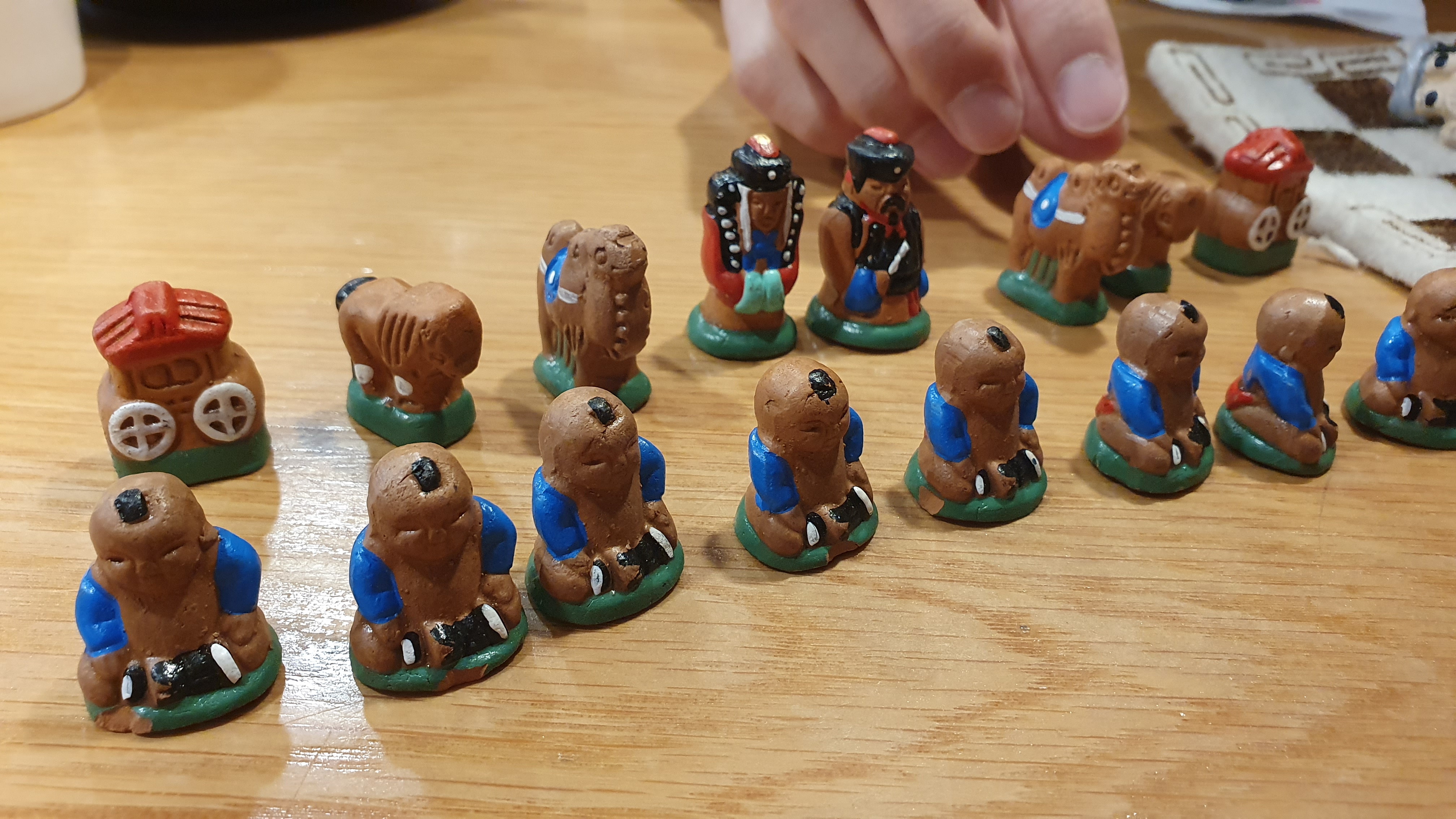 허르헉이 만들어지기 기다리면서, 몽골의 유명요소로 만든 체스 말들을 구경한다.