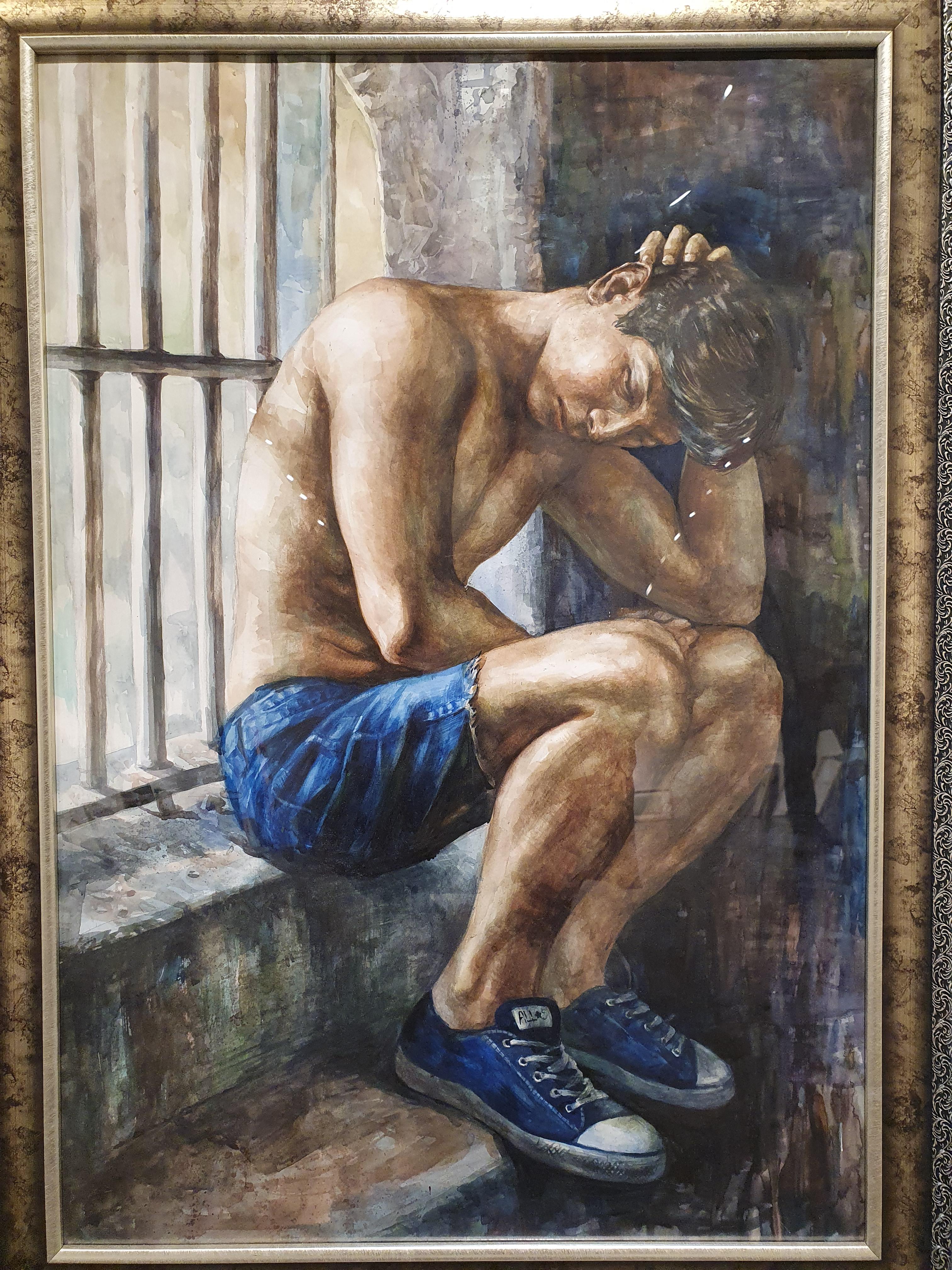 나는 어두운 색상, 철창의 배경, 청년, 노출, 사실적 뱃살, 그리고 청년의 표정 등에서 뭔가 오묘한 감정을 느껴 좋은 인상 깊었다.