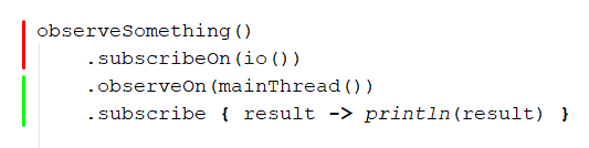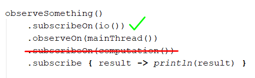 subscribeOn 은 처음 시작부분의 thread 를 결정하고, observeOn 을 만나는 순간부터 observeOn 에서 명시한 thread 로 변경된다.