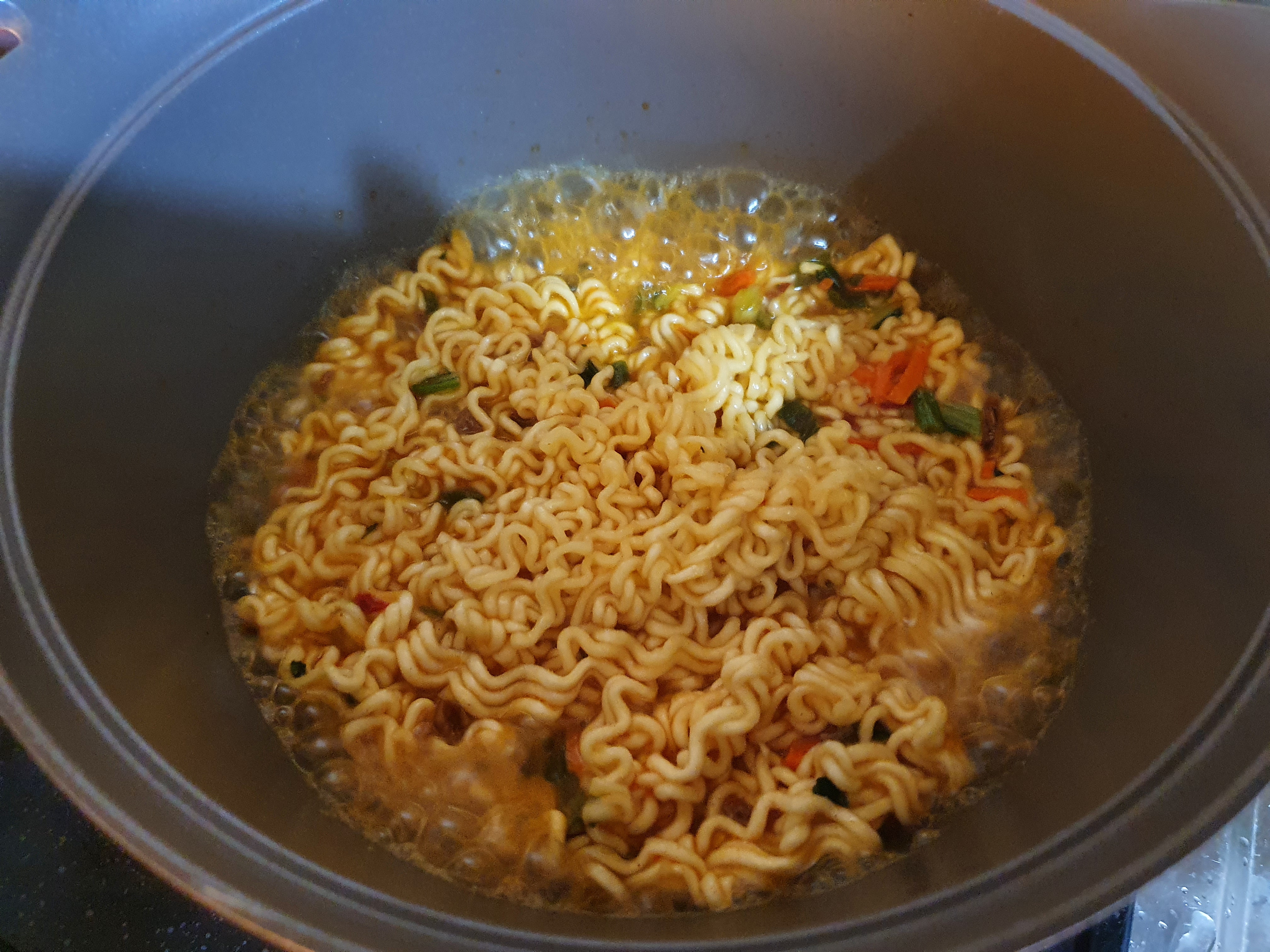 필자는 진라면 매운맛으로 끓였는데 다른 라면이더라도 꼬들한 면발 류 라면이면 OK.