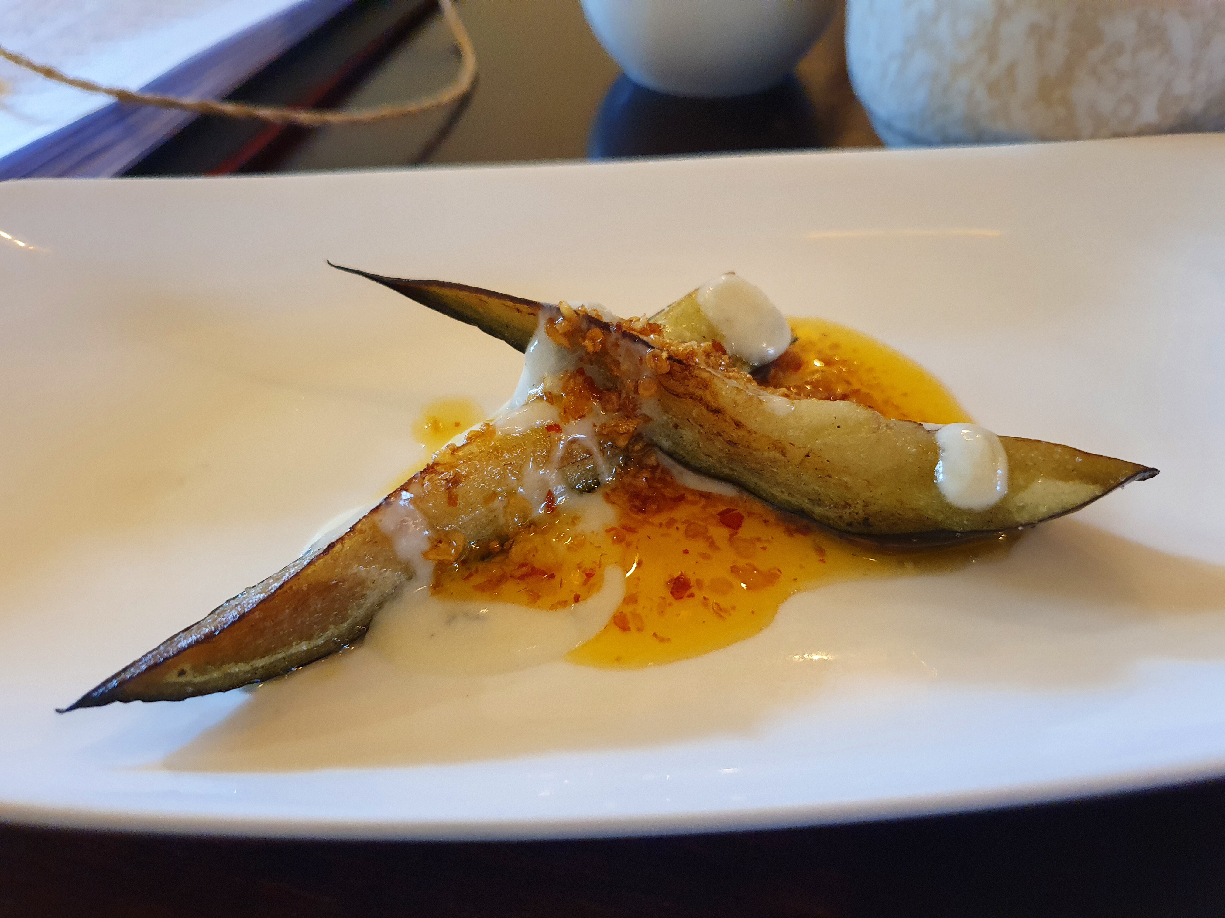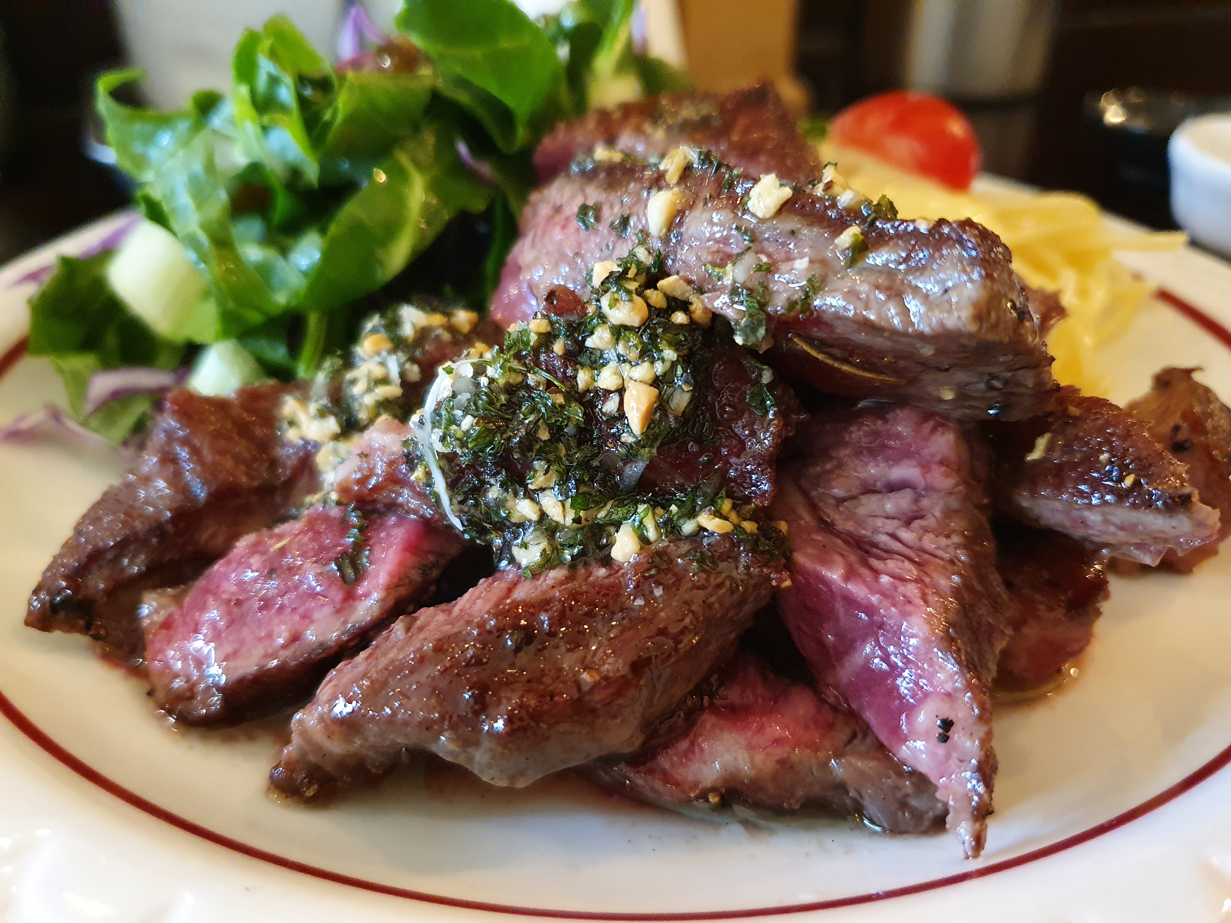 서비스로 치즈가 뿌려진 살짝 매콤한 오일로 볶은 가지가 나왔는데, 따뜻하며 살짝 매콤한 맛이 소고기와 어울어져 맛남.