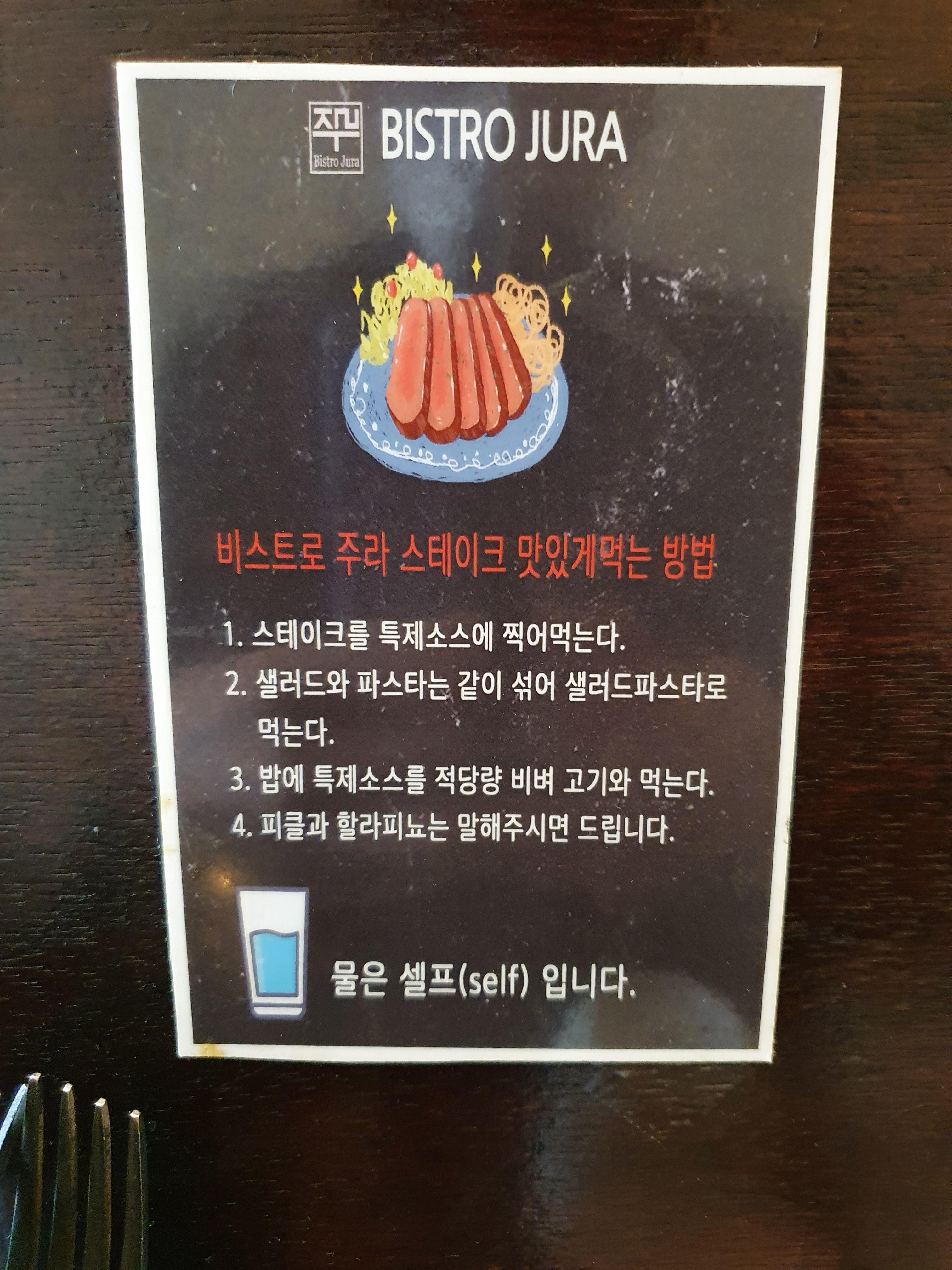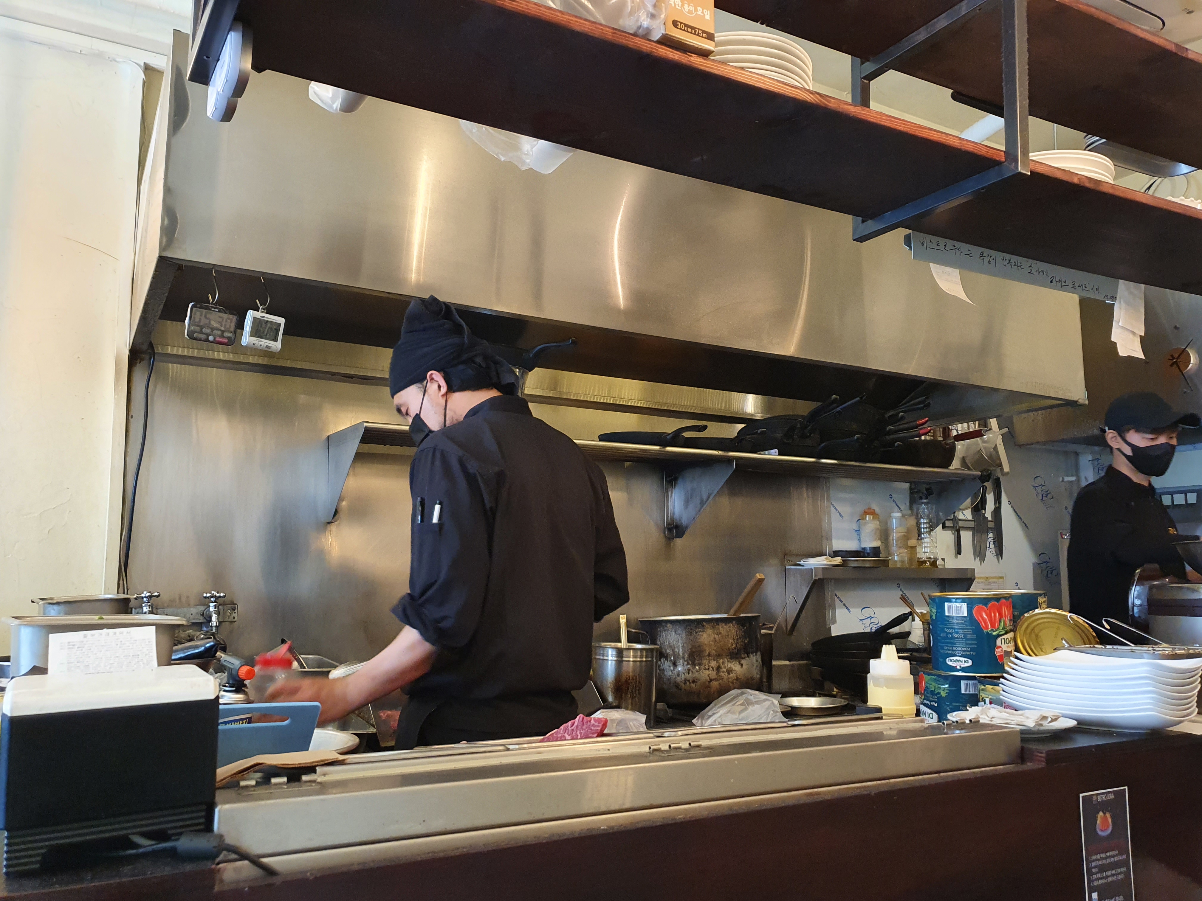 혼밥하기에는 자리가 협소하여 바쁜 시간대에는 눈치 보일 것 같고.. 사람이 없는데도 배달의 민족 주문을 비롯해 상당히 복작복작한 것이 맘 편하게 밥 먹을 곳은 아닌 느낌. 주방이 바로 연결되어 고기 굽는 냄새도 좀 풍겨나오고, 딱 bistro 란 말이 어울리는 분위기.