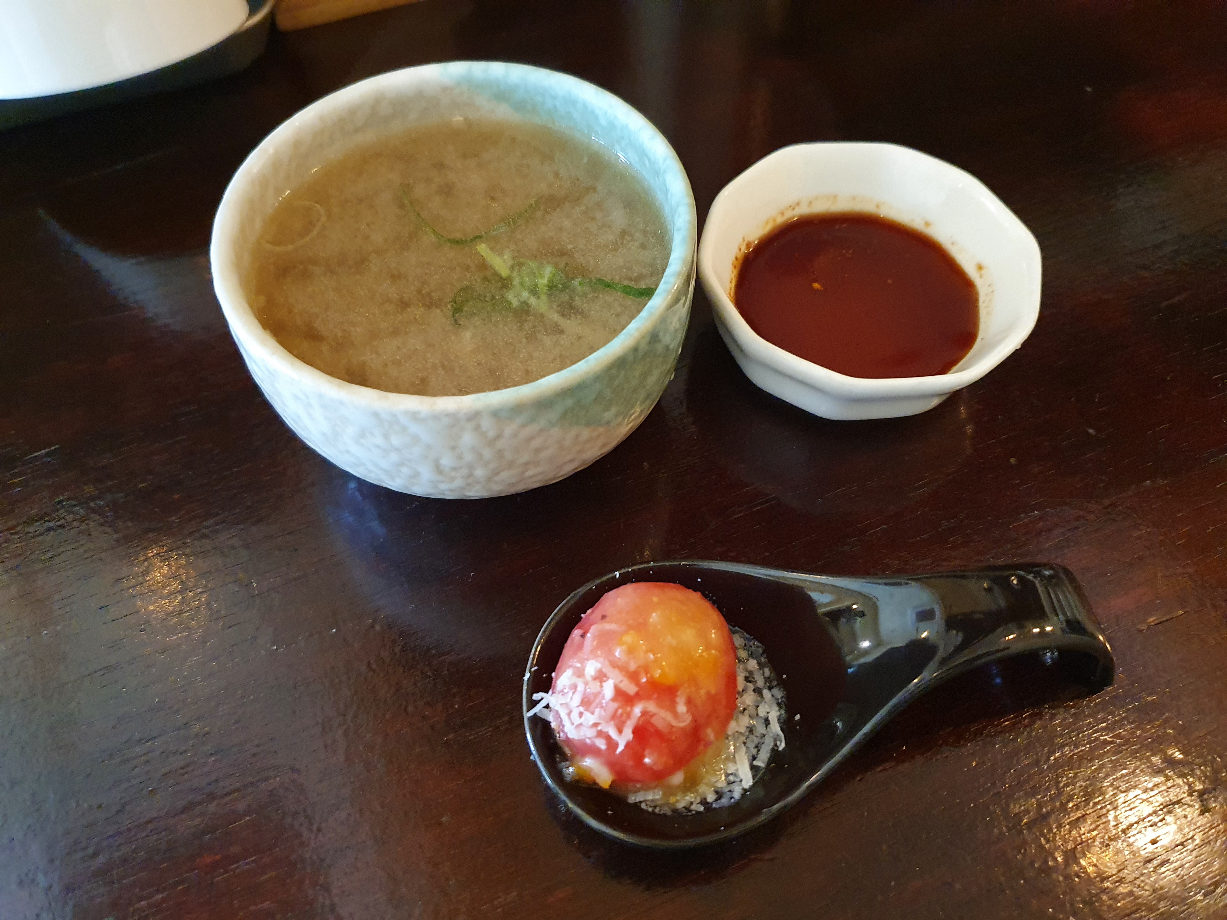 식전 에피타이저로 주는 치즈가 뿌려진 유자 토마토 절임. 에피타이저로 아주 훌룡함. 입맛을 돋움.