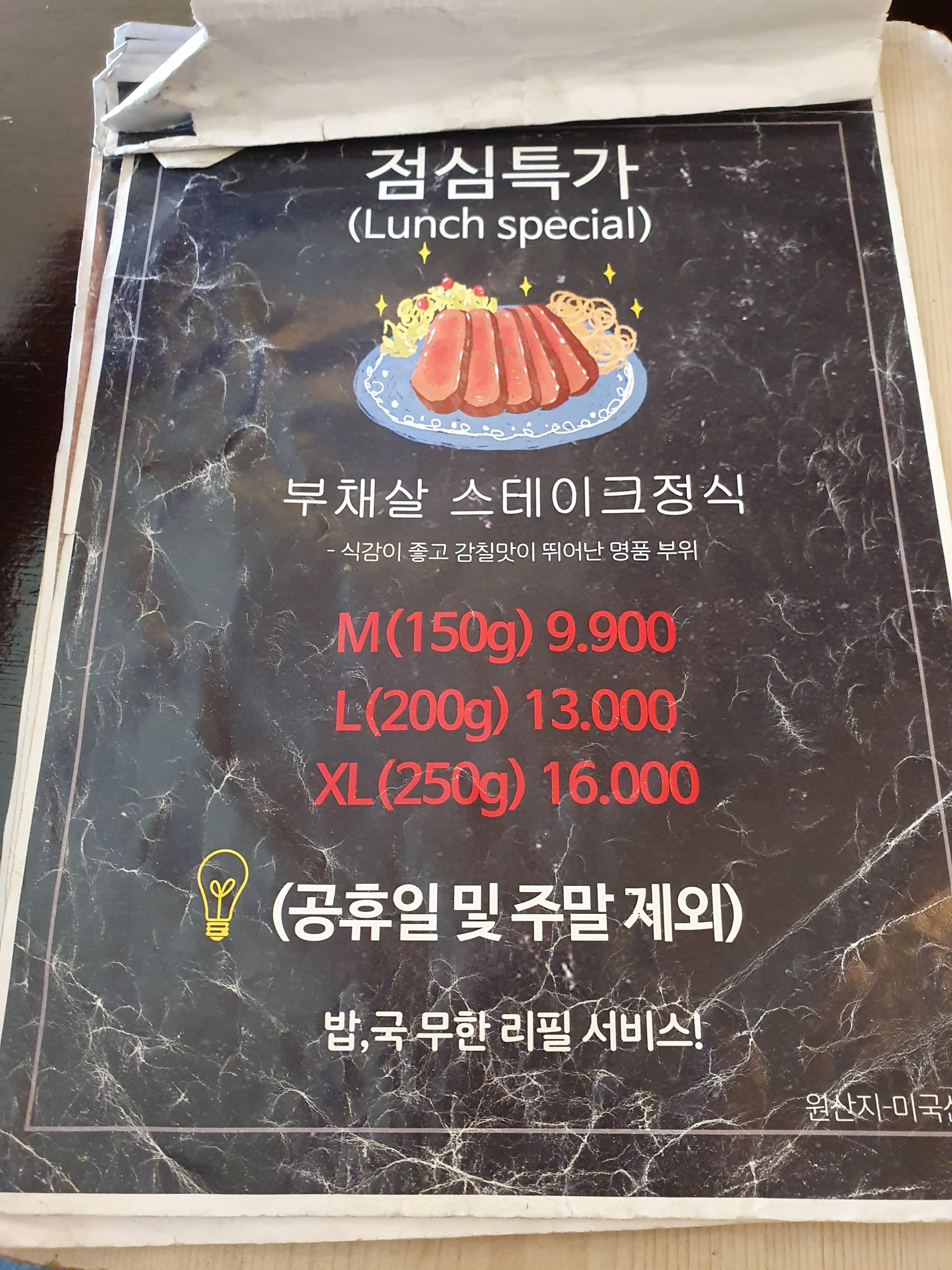 점심특가(Lunch Special) 부채살 스테이크 정식. L(200g) 13000원.