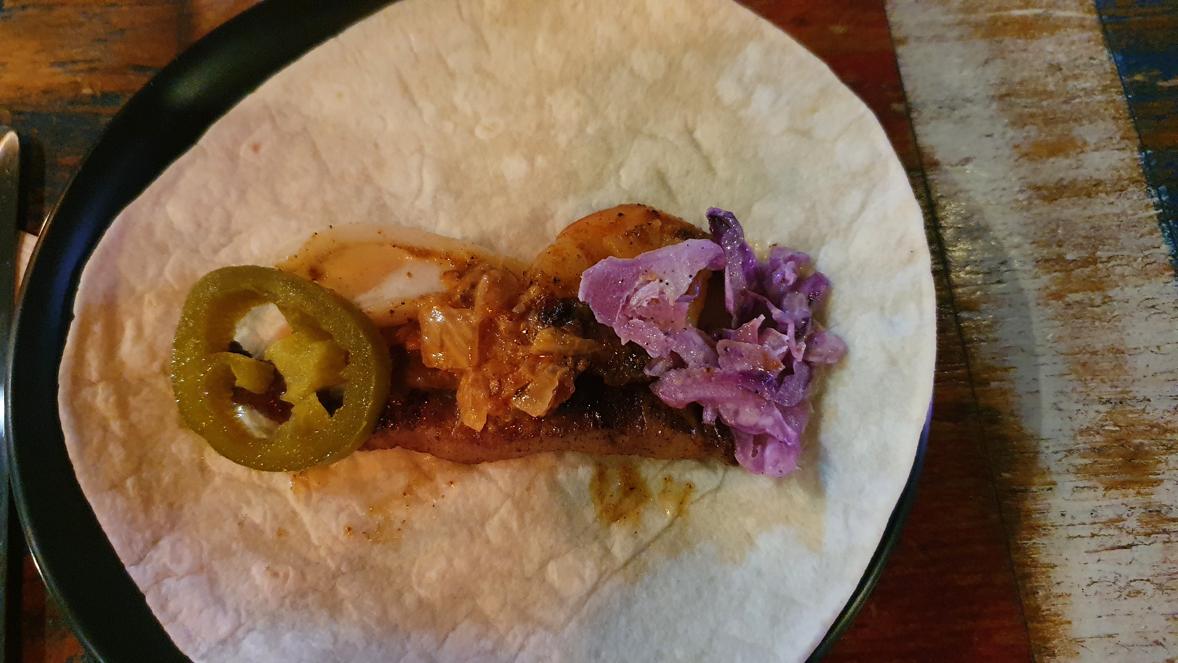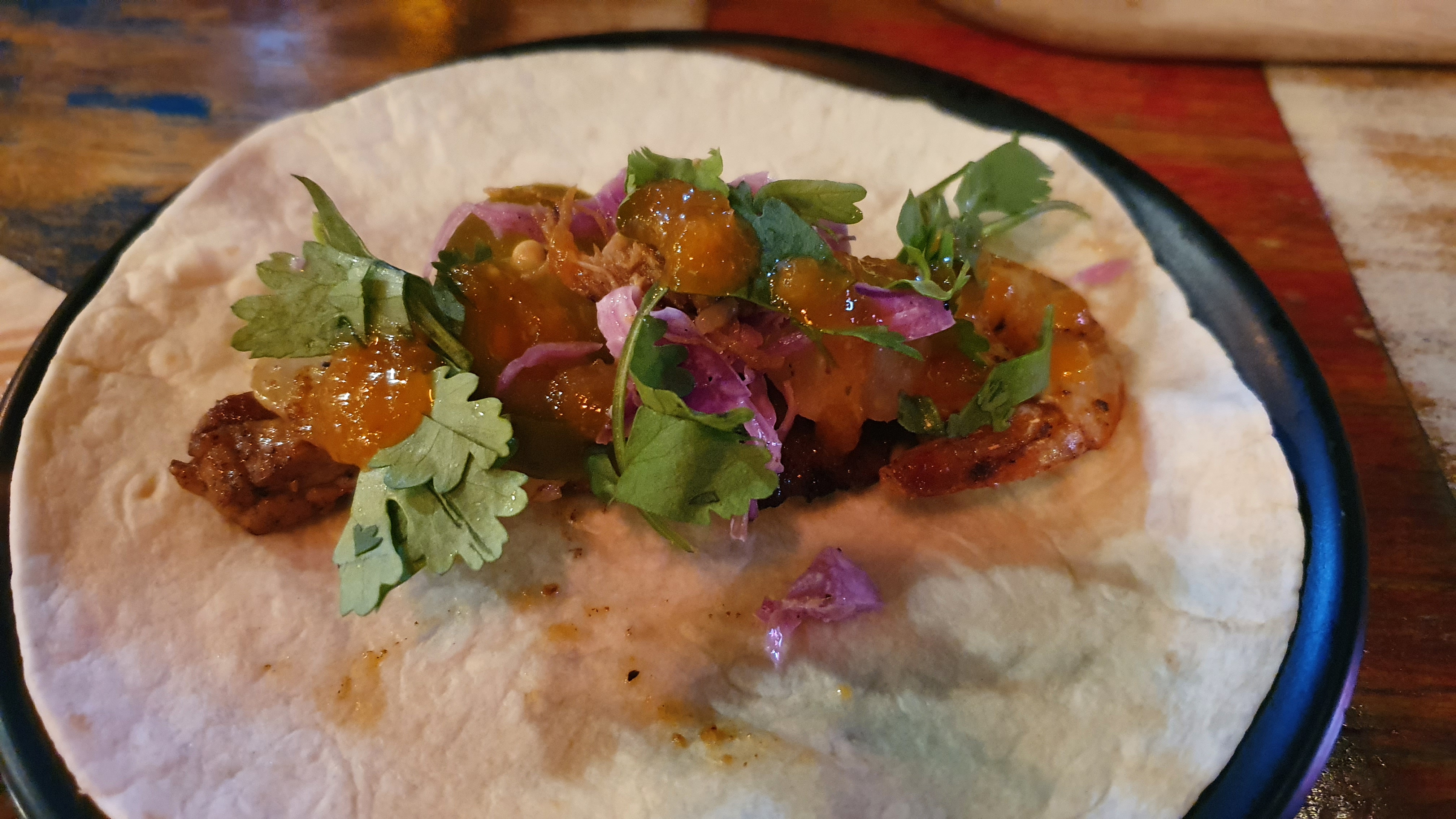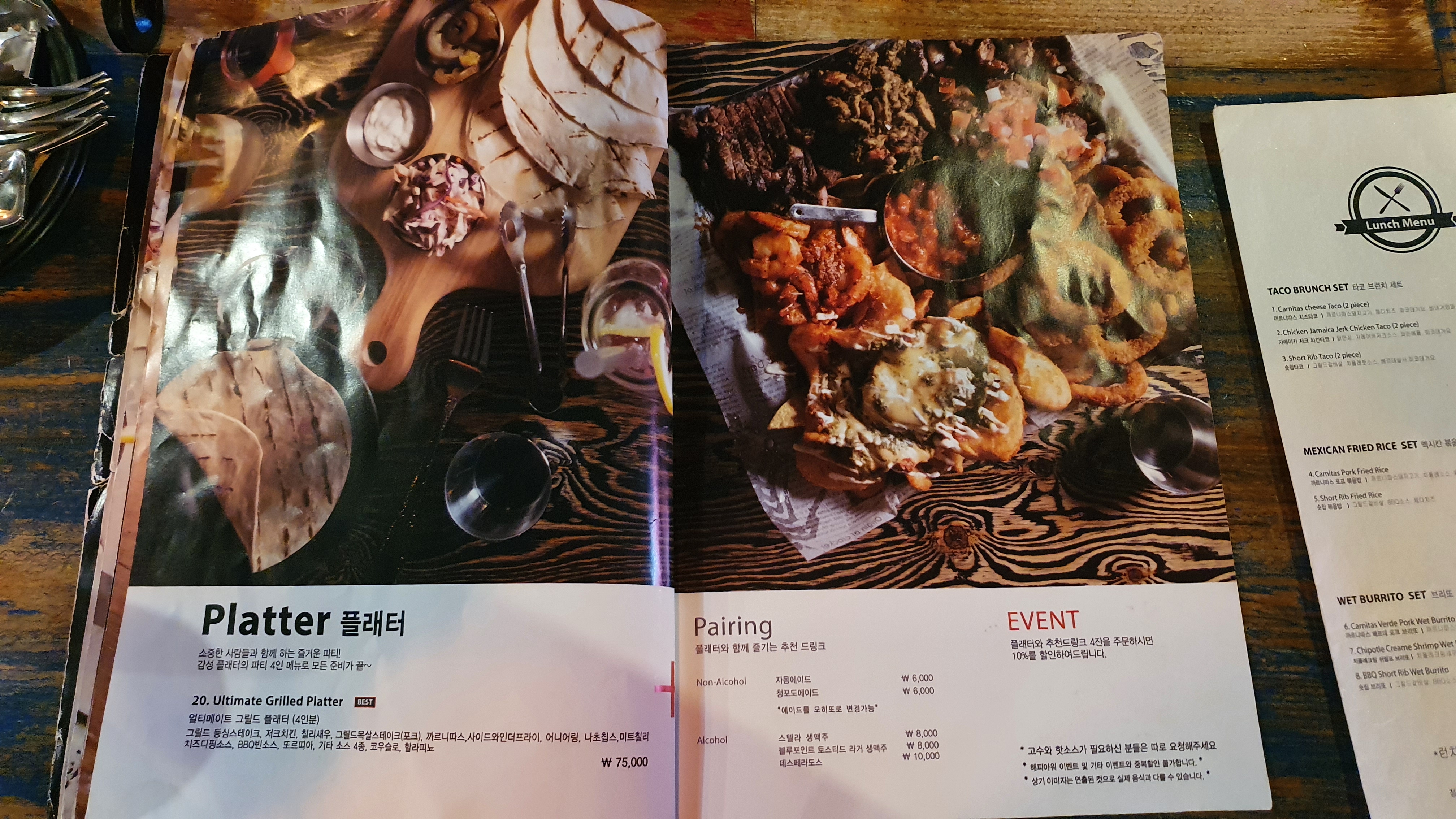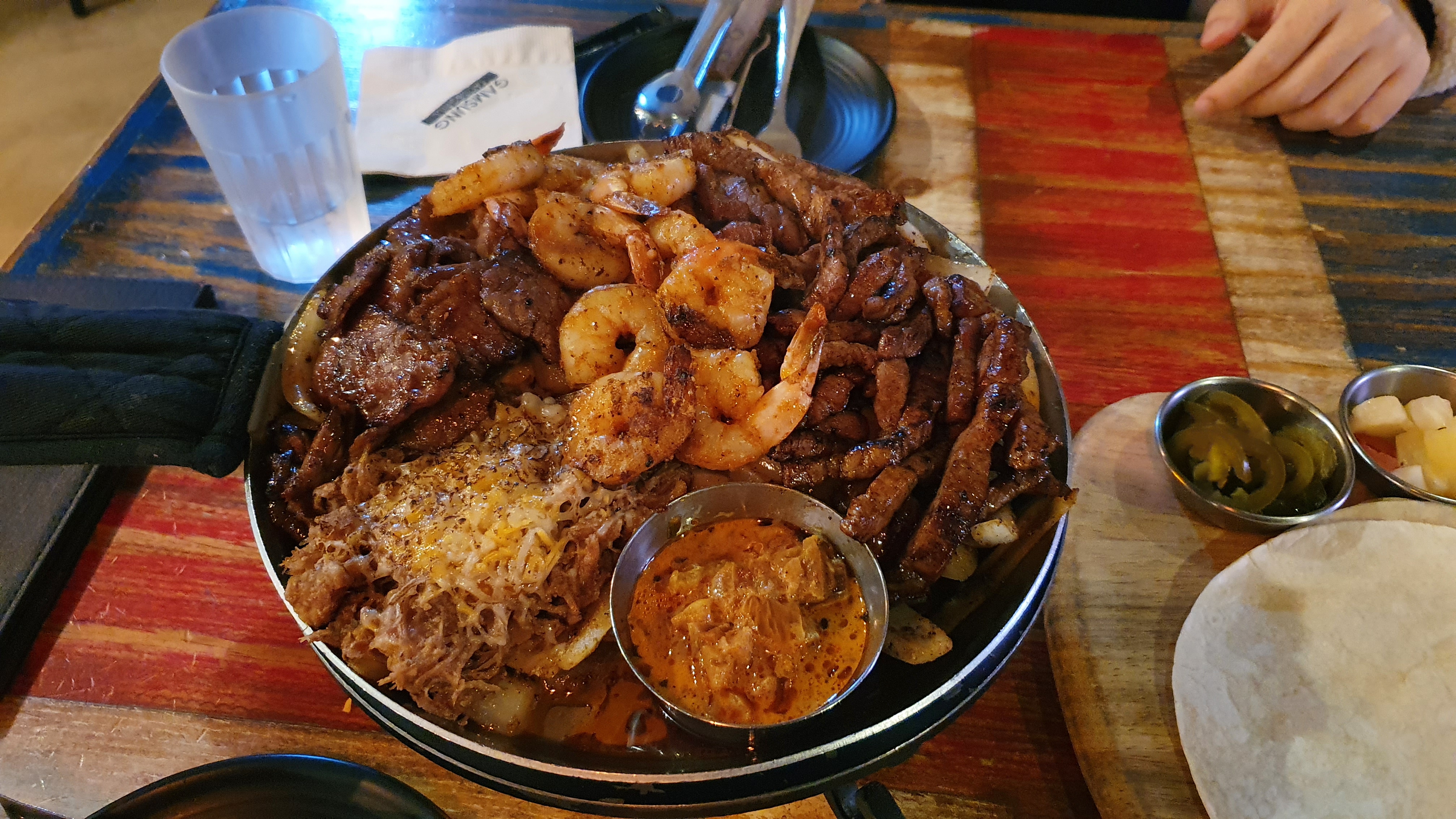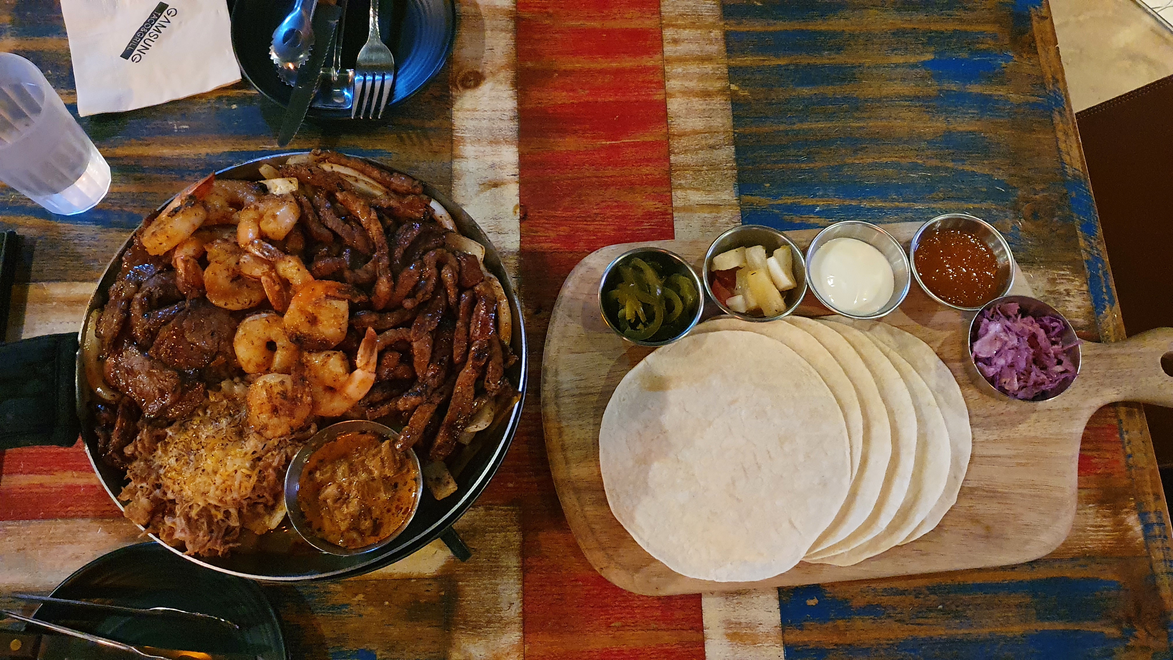 그릴드 스테이크, 칠리새우, 스파이시 포크, 까르니따스(작은 고기, pulled pork 느낌인듯), 또르띠아, 4가지 소스, 코울슬로, 할라피뇨. 구성