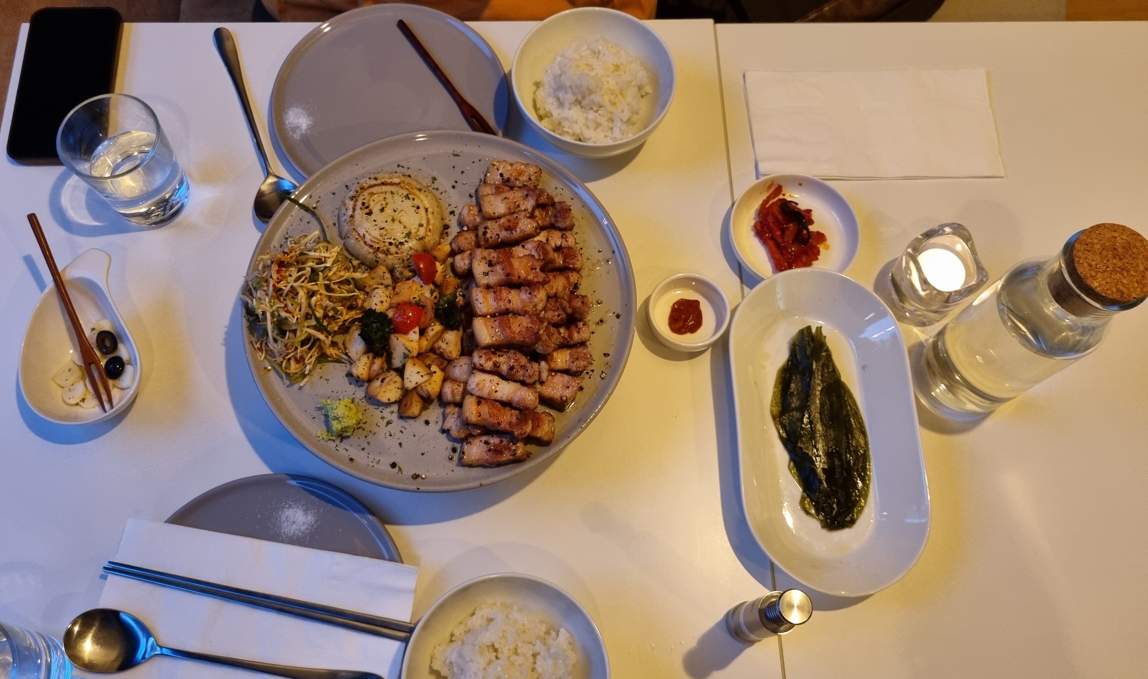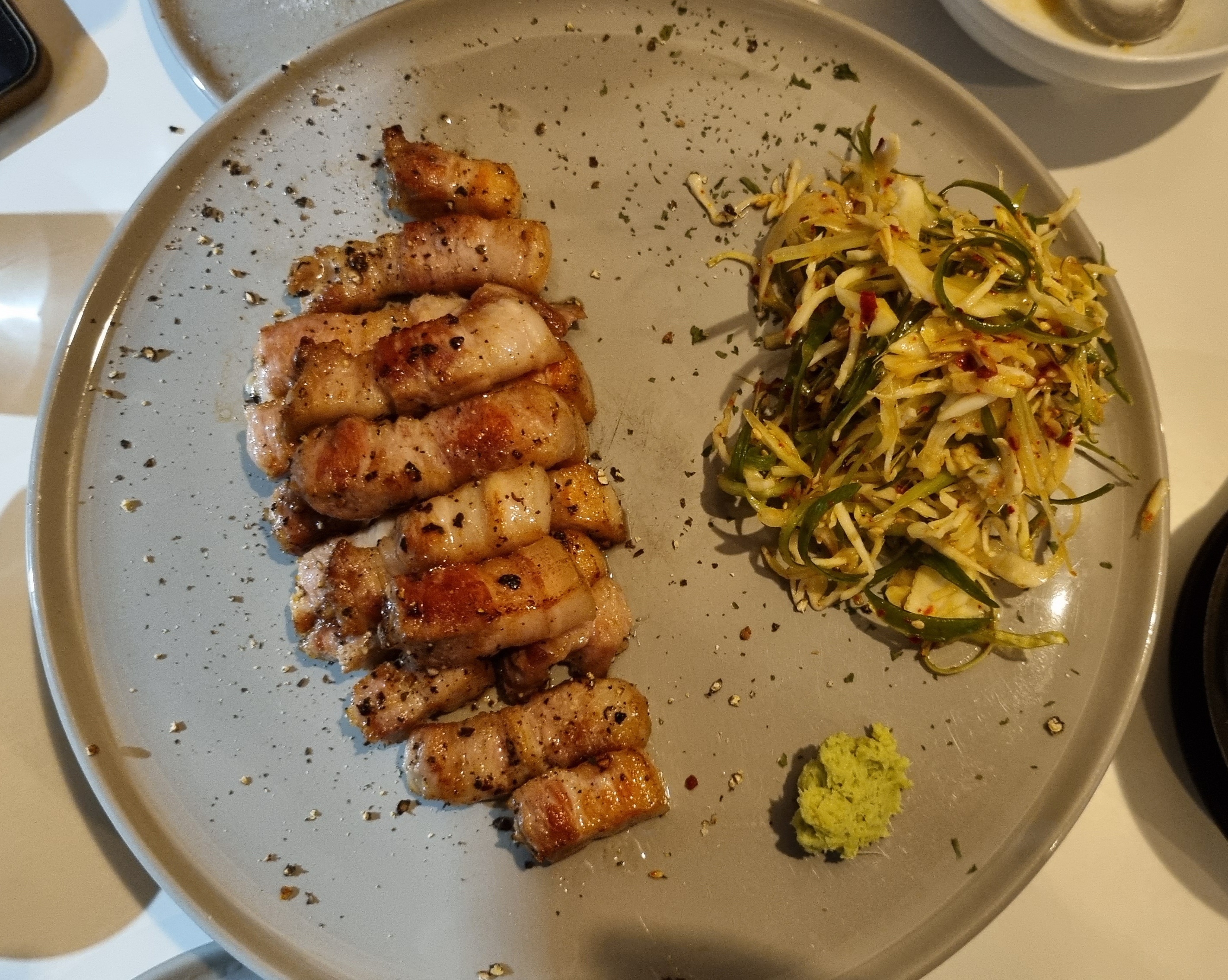처음엔 고기 본연의 맛을 느끼기 위해 소금을 찍고, 두번째는 와사비랑 먹어보고, 세번째는 명이나물에 싸서 먹어보라는 친절한 설명을 들음.