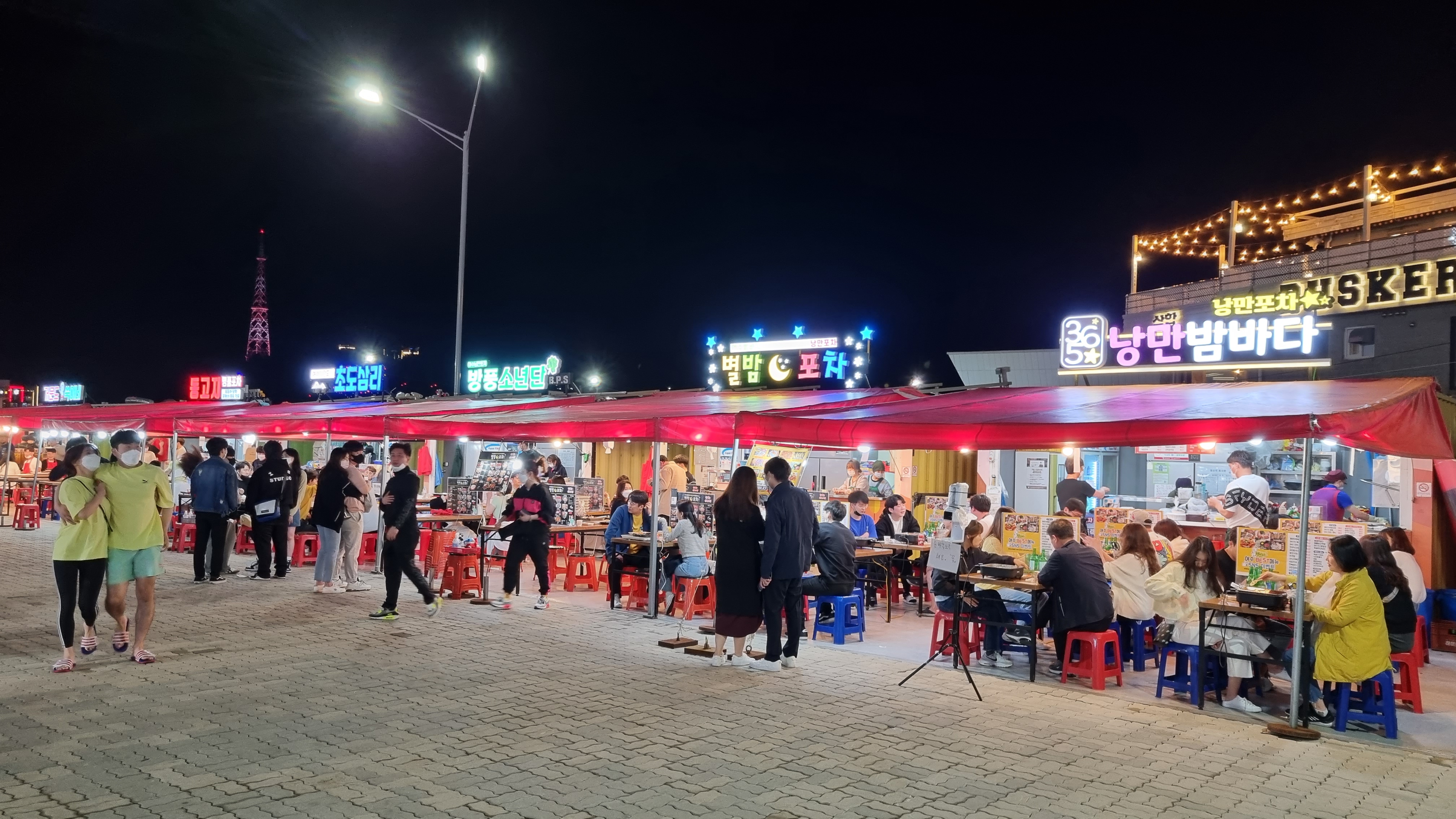 오른쪽 빨간 등대 있는 쪽이 포차거리이다.