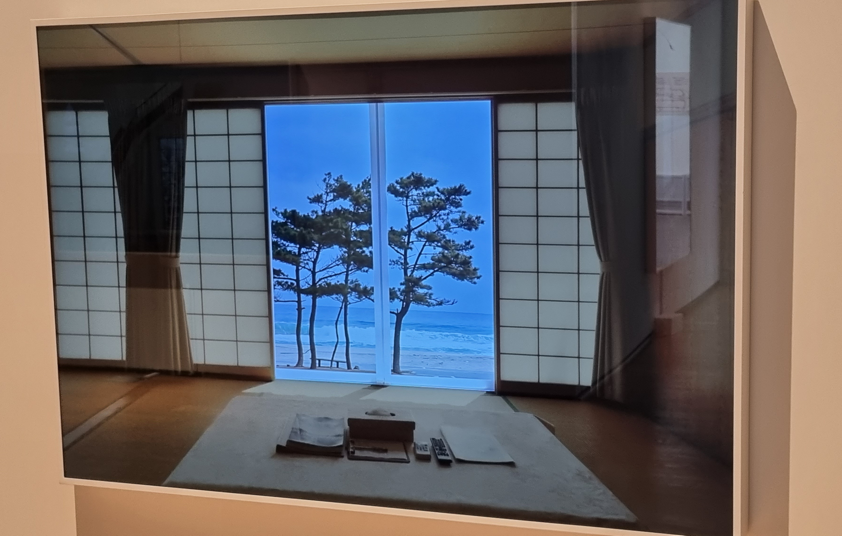 일본 느낌의 방안과, 움직이는 바깥 바다 풍경.
