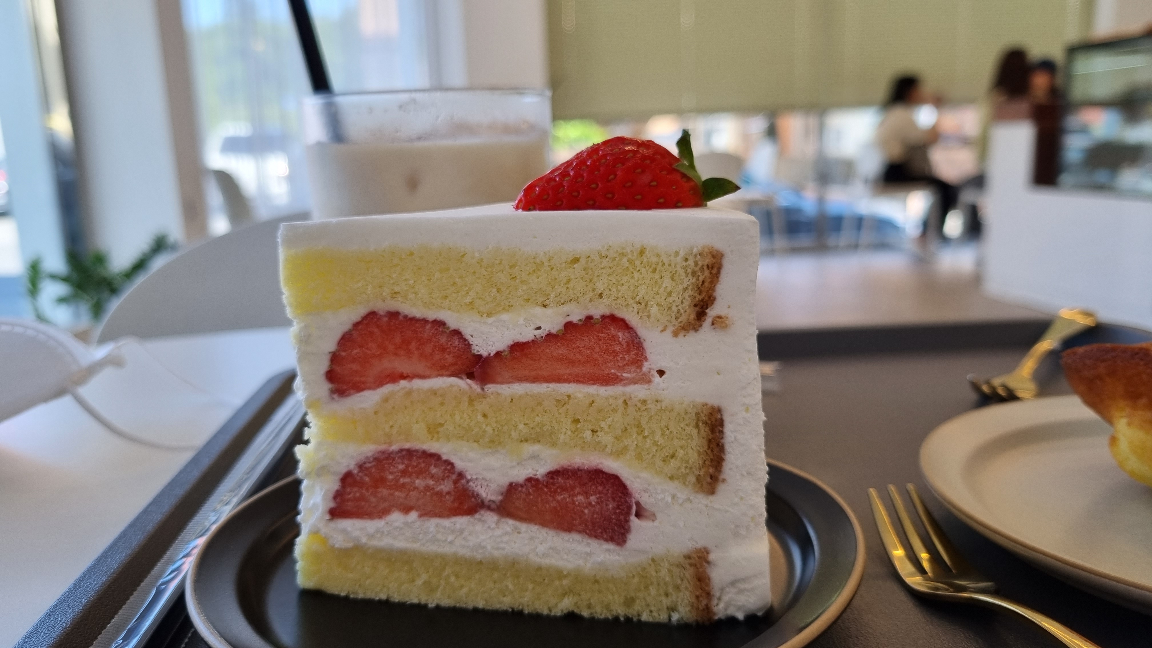 진짱은 딸기 생크림 홀 케이크를 포장해서 집에 갈 생각을 하고, 일단 조각케익을 시켜봄.