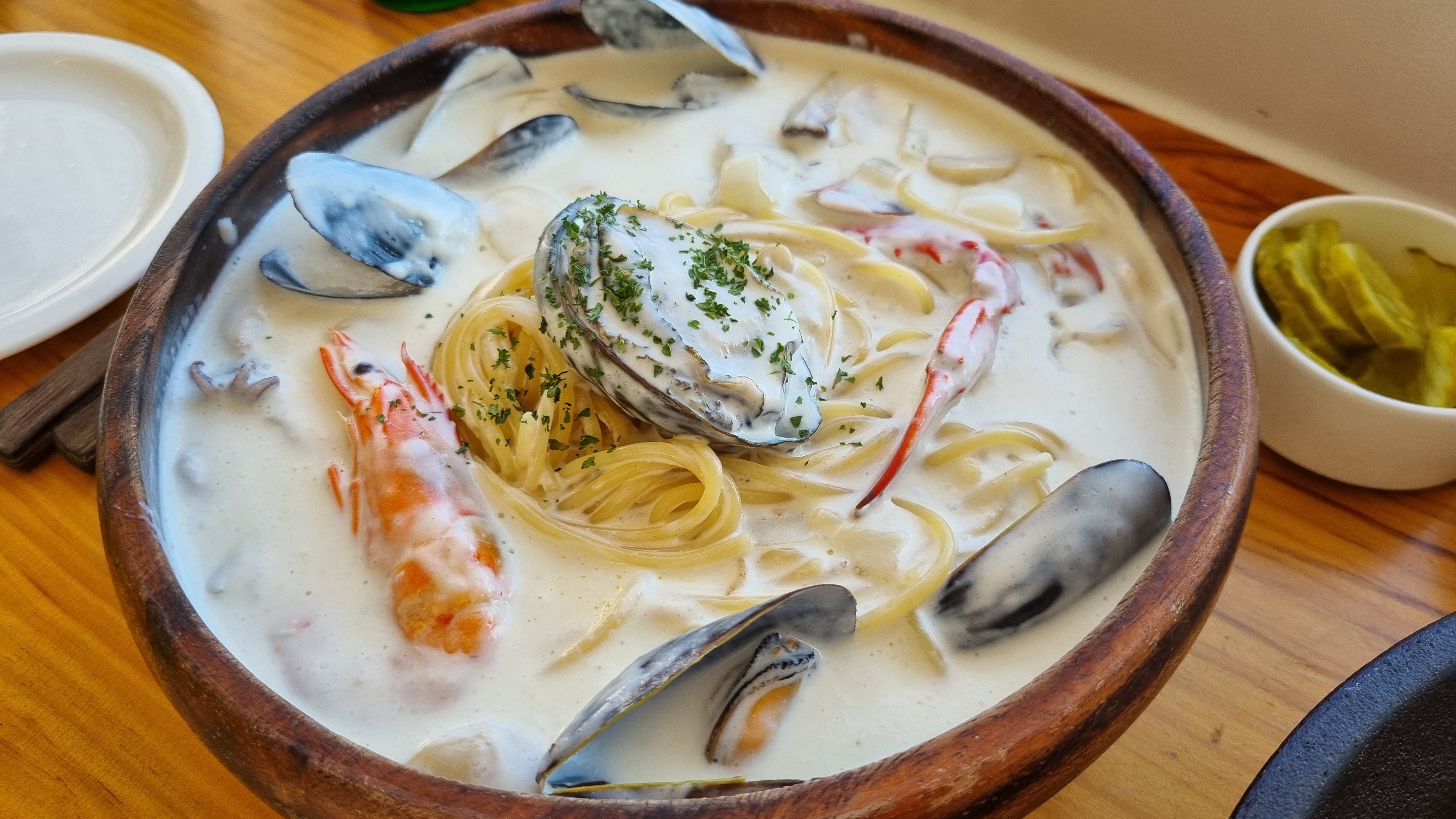 바다 파스타는 가격이 좀 있었는데 새우. 게. 그리고 전복도 하나 있어서 가격적인 측면은 그냥 고개 한번 끄덕일 정도로 이해가 가긴 했음.
