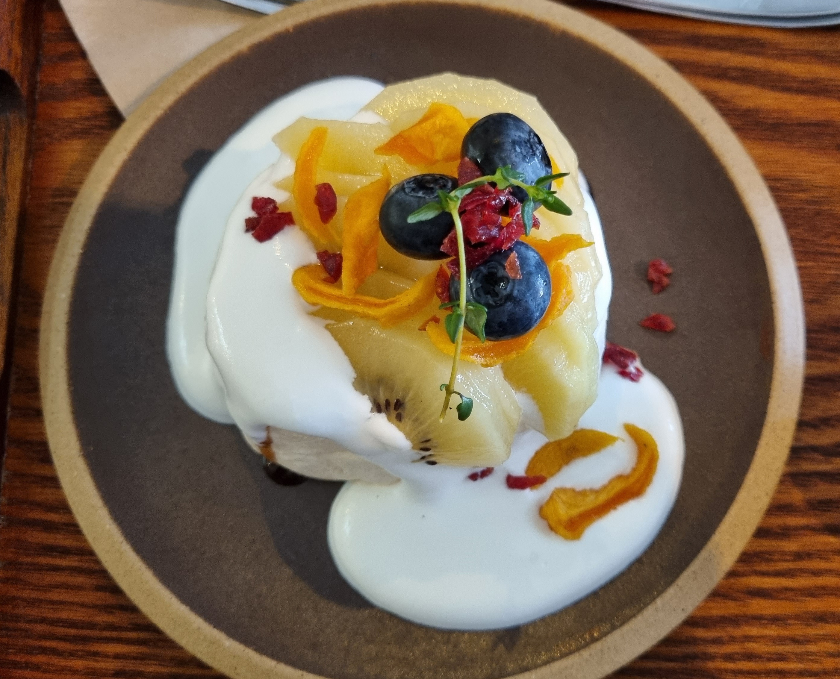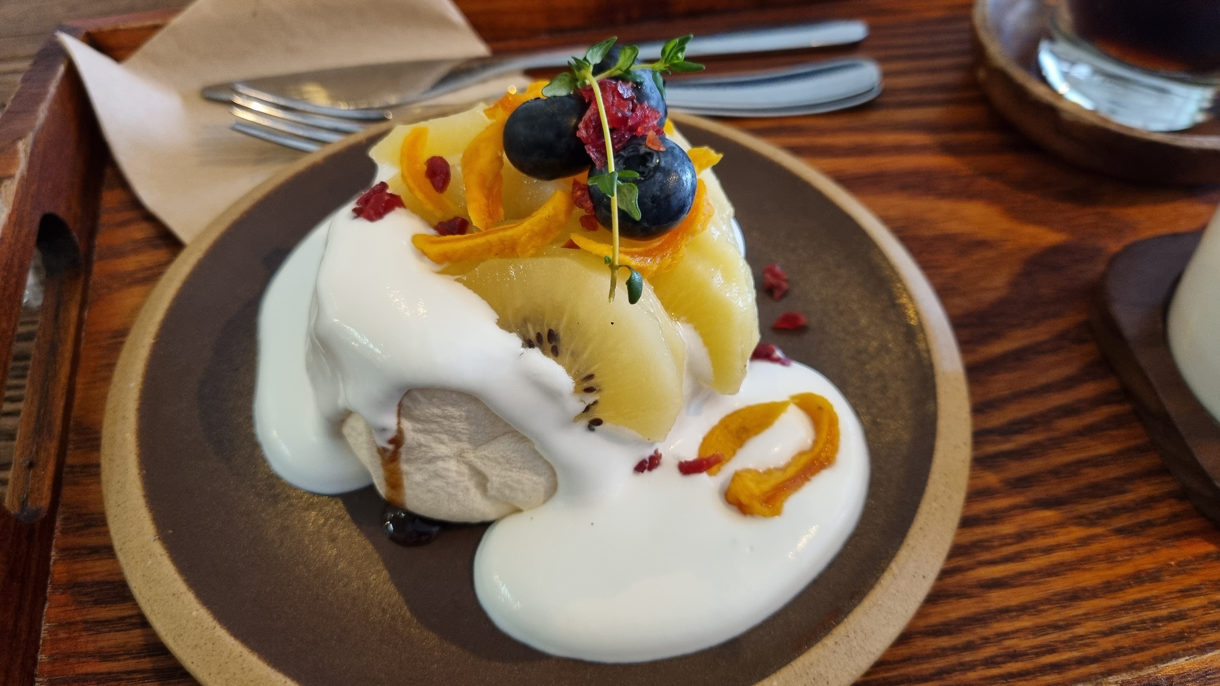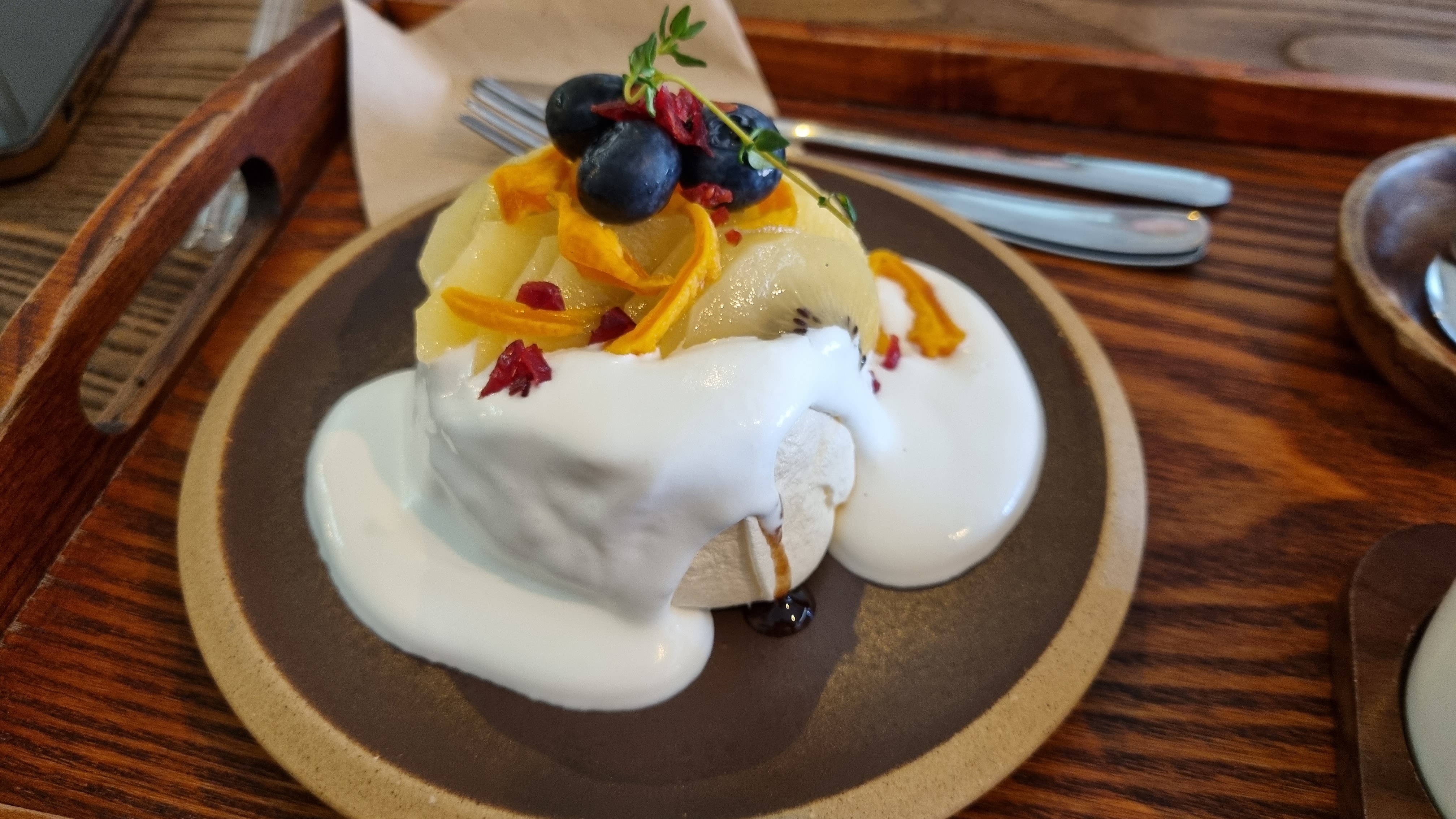 머랭케이크(?) 위에 생크림과 계절과일을 얹은 녀석.