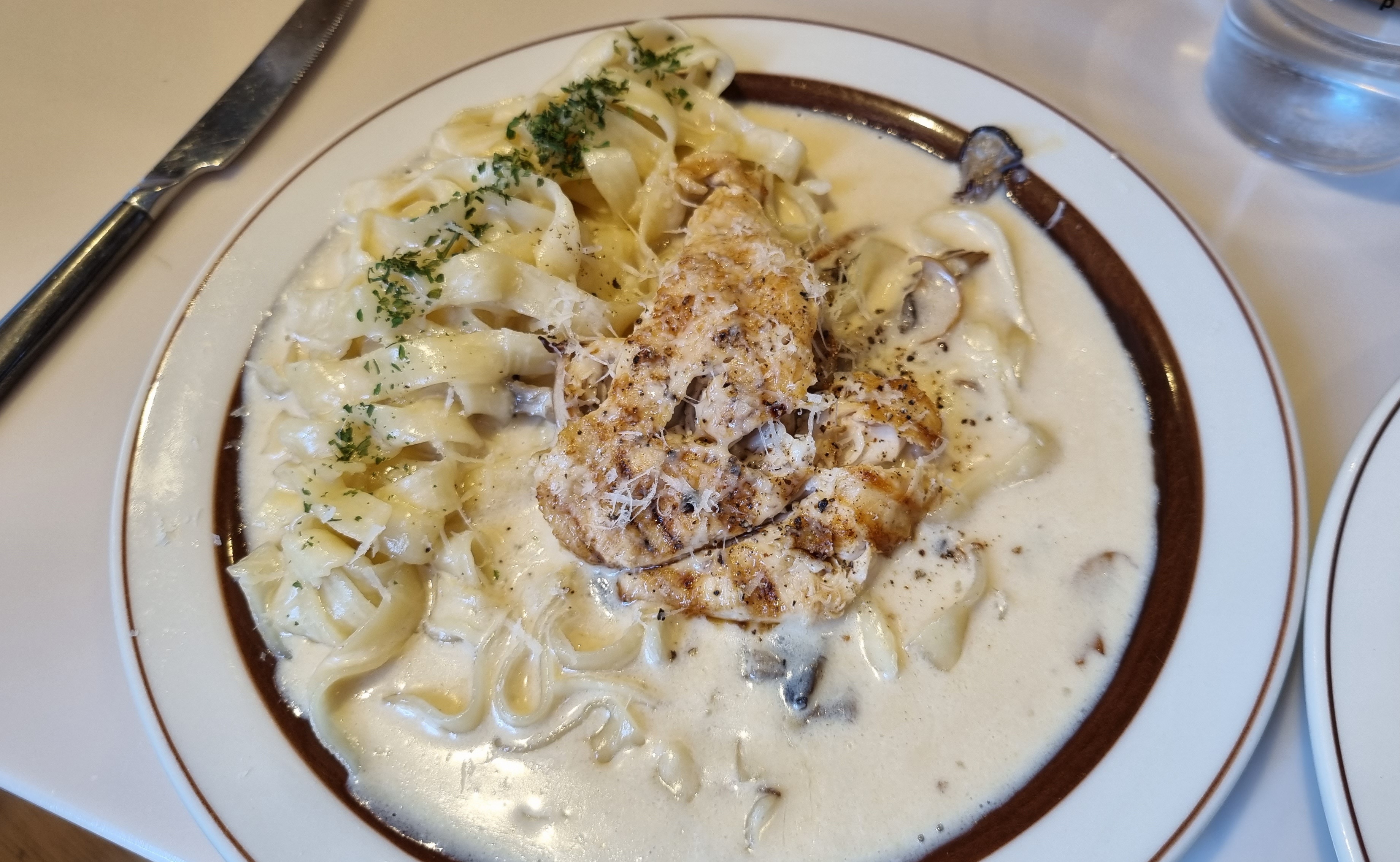 치킨크림파스타는 적당한 수준의 크림. 찔깃하며 후추맛 나는 닭가슴살 스테이크. 5점 만점 4.2점정도?