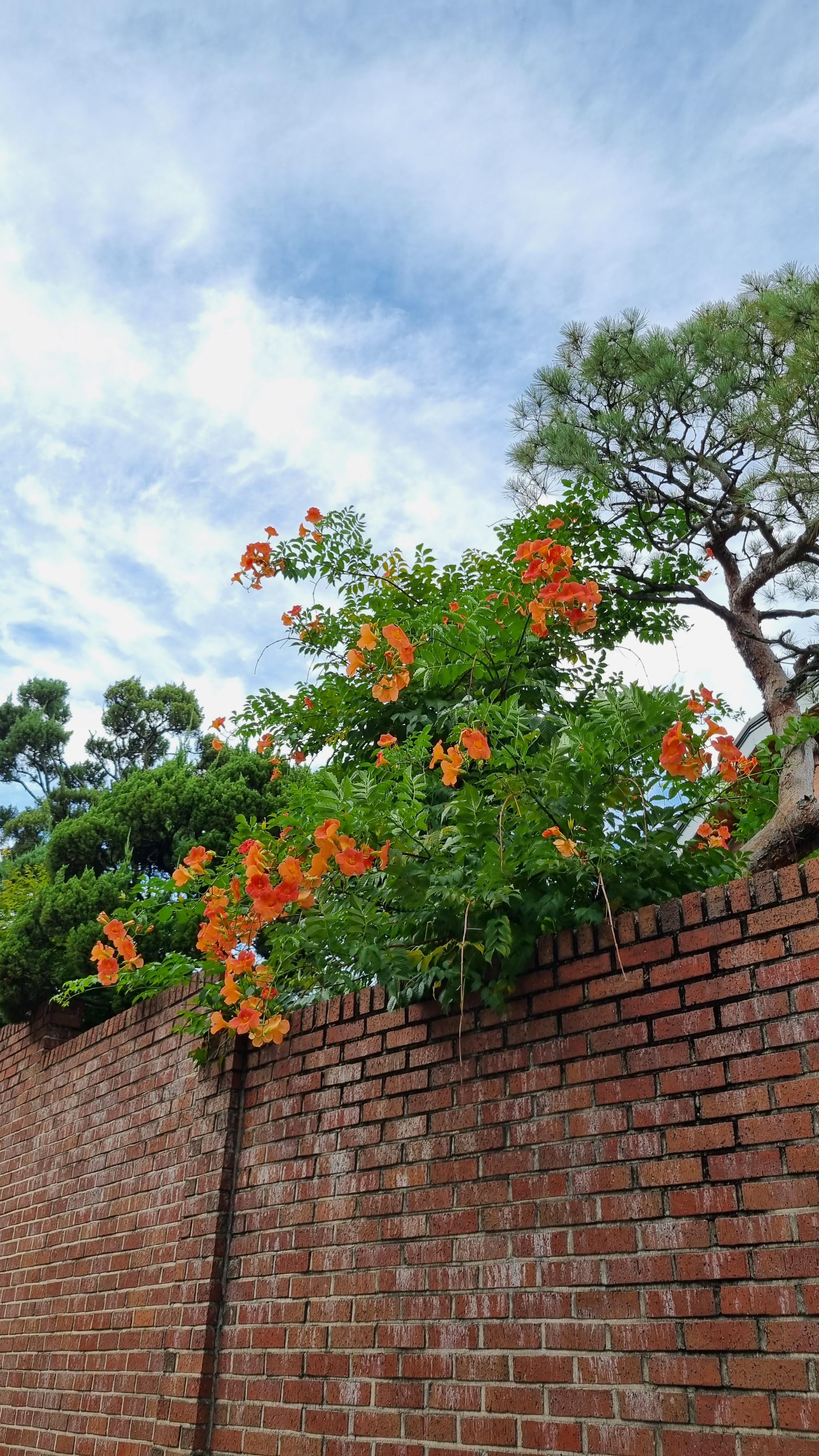 파란 하늘과 빨간 벽돌과 너무나 잘 어울리는 꽃.