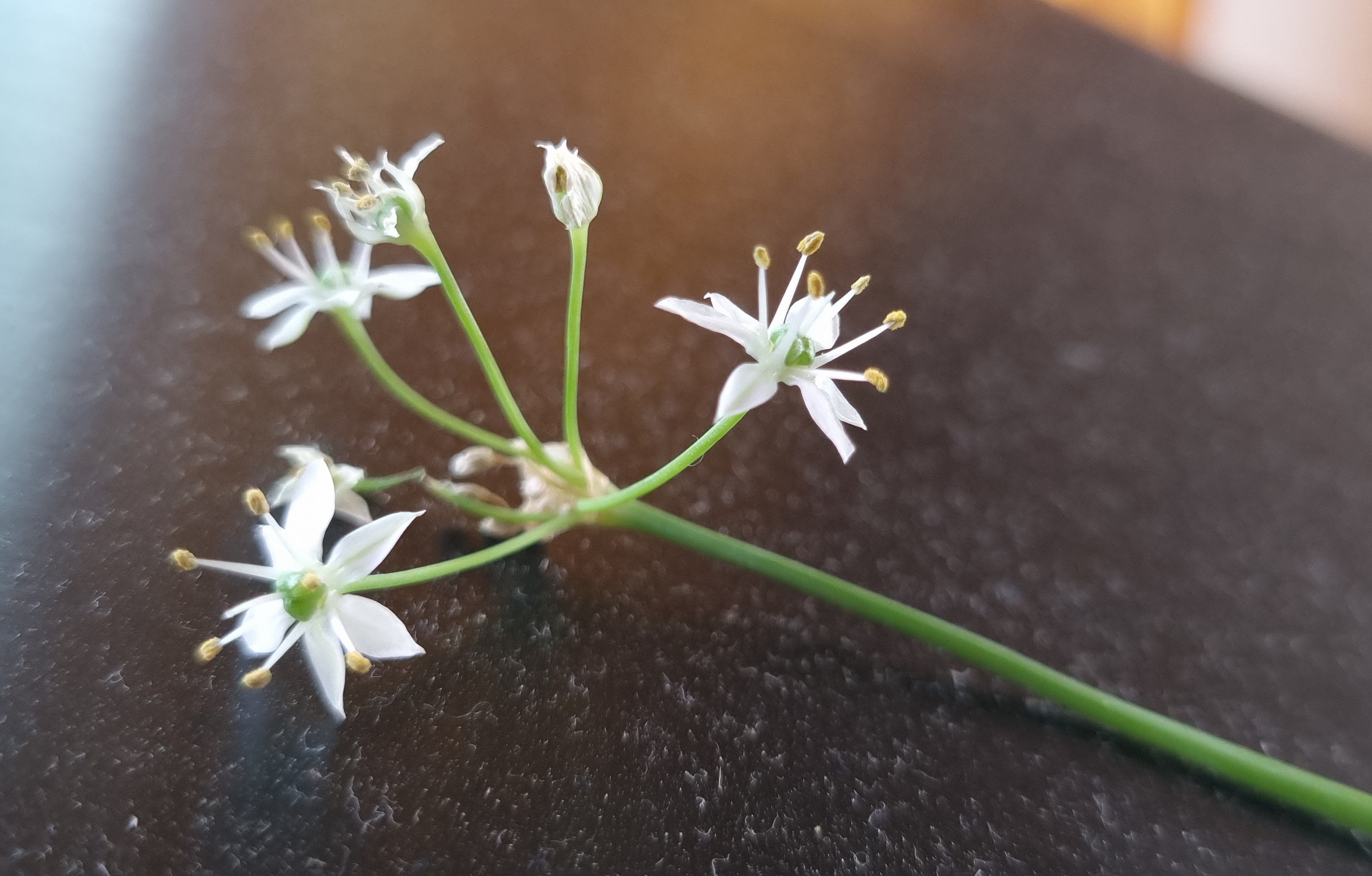 집에서 나가기 전에 부추에서 자라난 꽃을 보았다.