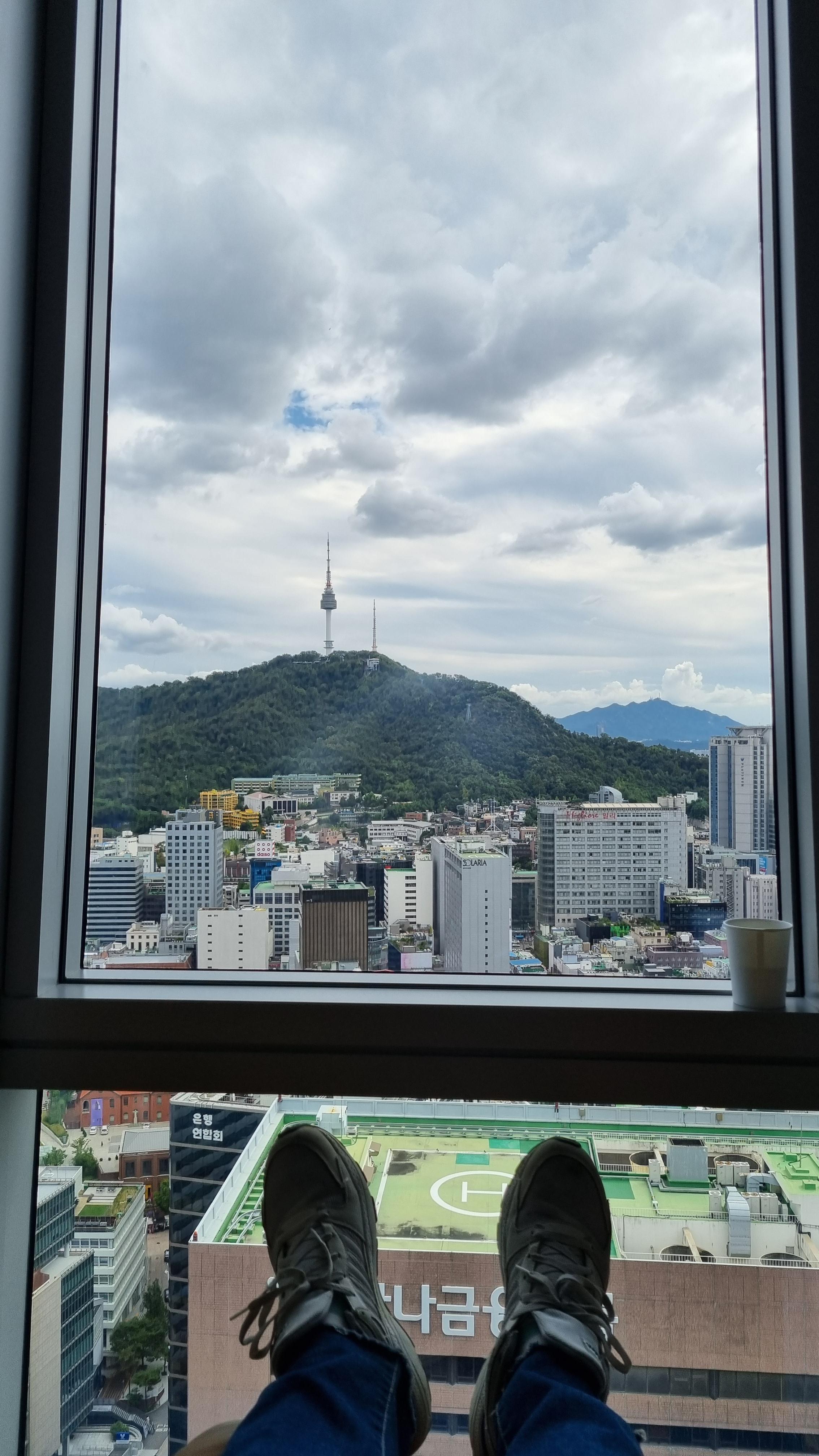 리클라인 체어에 몸을 기대고 발 받침에 다리를 올린 후, 남산 타워를 보며 커피 한잔을 홀짝거린다.