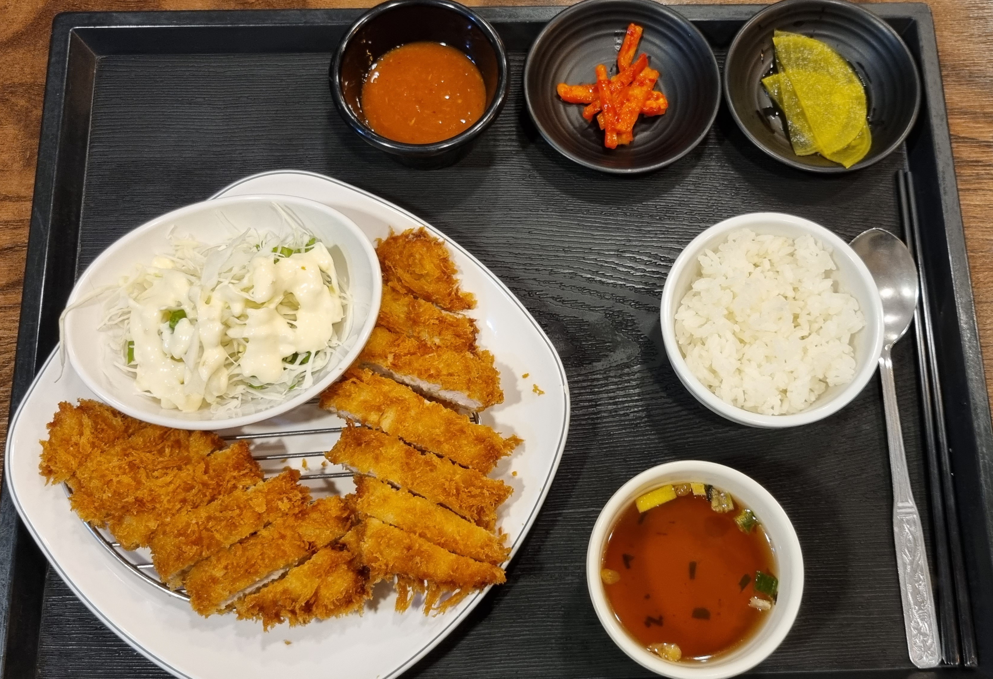 레몬 드레싱 뿌린 양배추 샐러드 맛이 좋고, 곡물과 과일 갈아 만들었다는 소스도 괜춘. 무말랭이도 돈까스와 은근 잘 어울림.