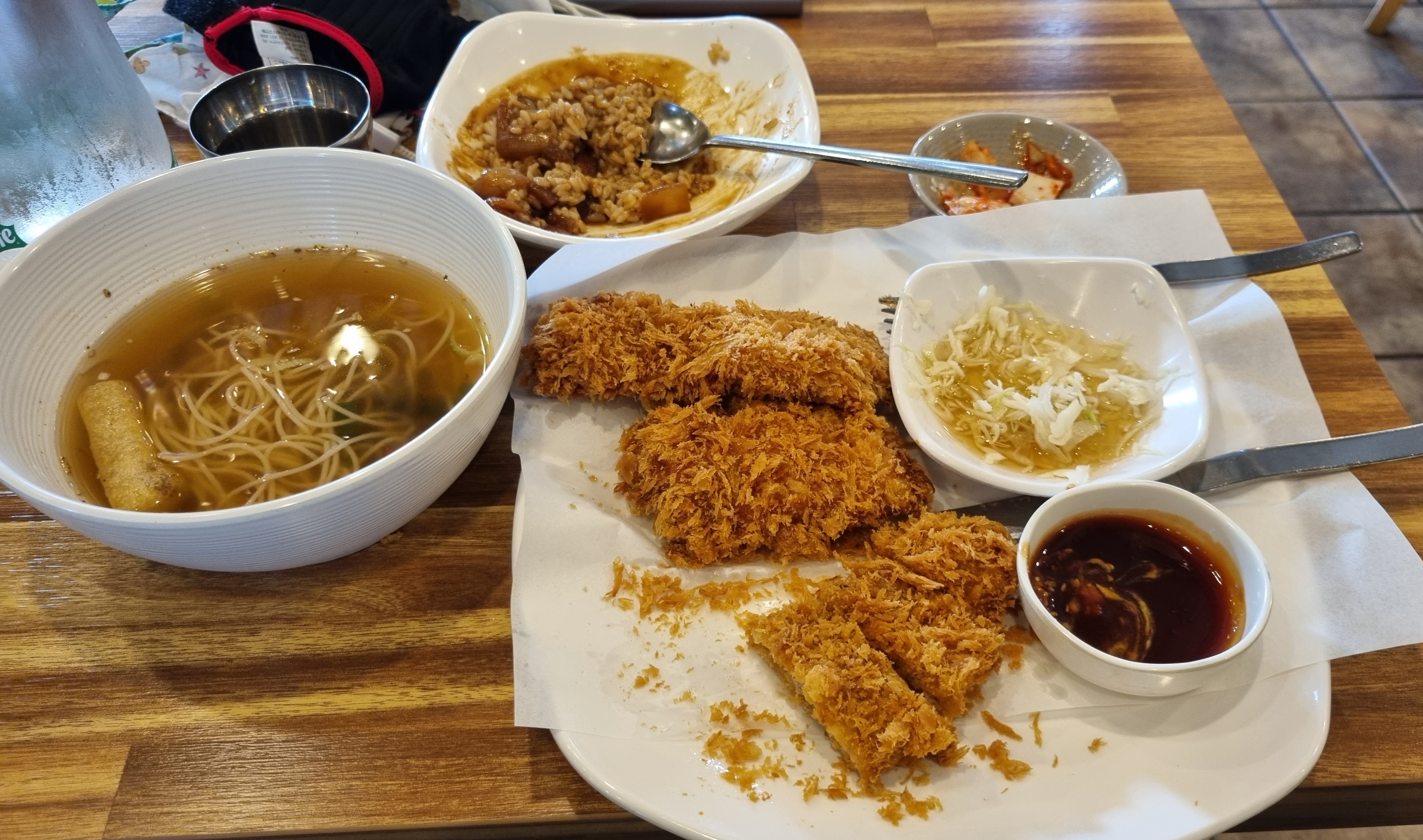 9000원에 '잔치국수 + (개짱맛) 안심 돈까스 3조각 + 하이라이스' 를 푸짐하게 제공하므로 혜자스럽다고 할 수 있다.