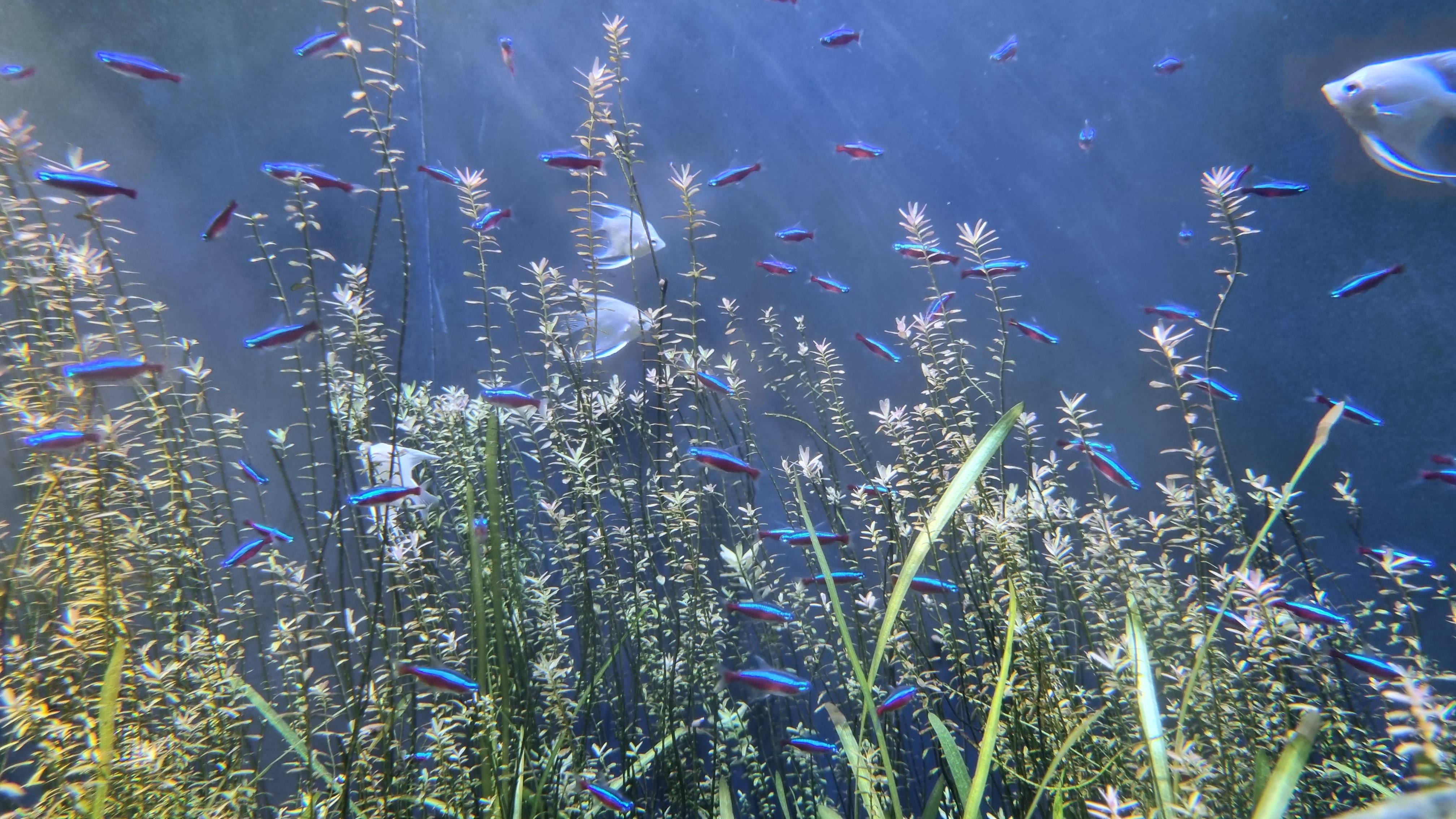 네온테트라 라는 이름을 가진 푸른 빛을 내는 물고기.