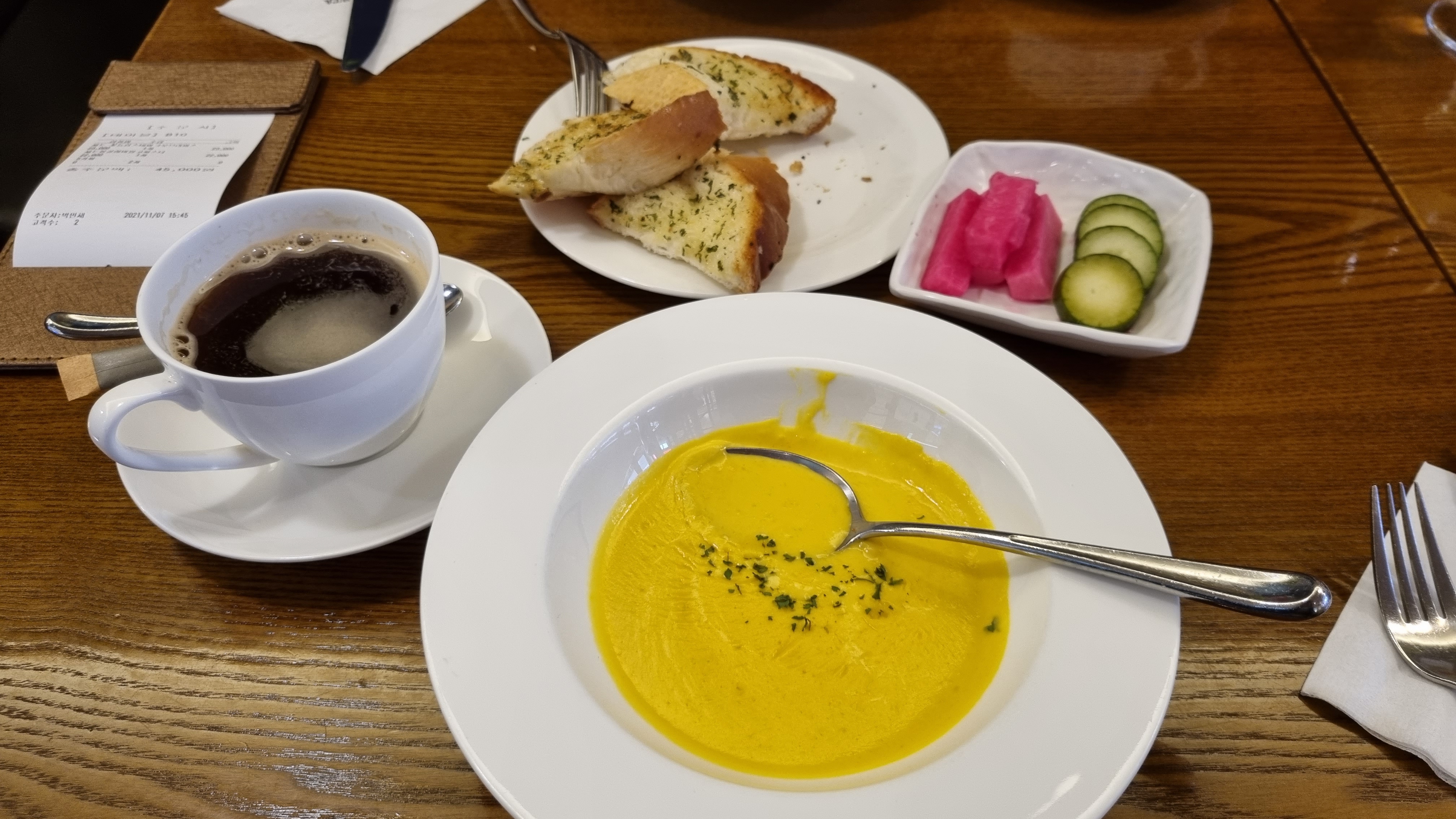 이 날은 단호박 스프, 핸드메이드 마늘빵이 나옴.