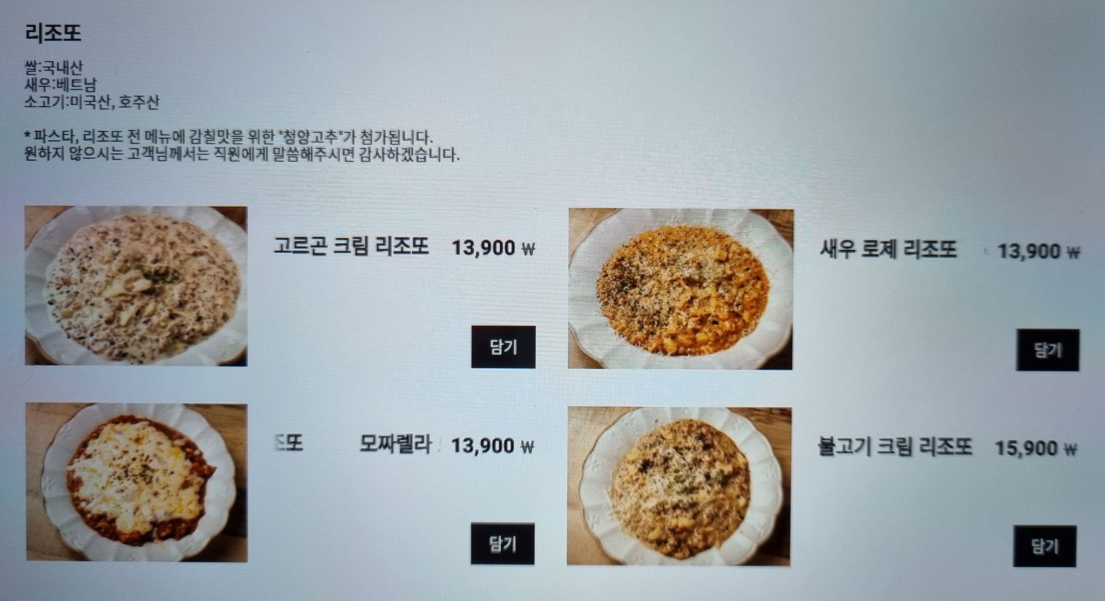 여기서는 '고르곤 크림 리조또' 주문