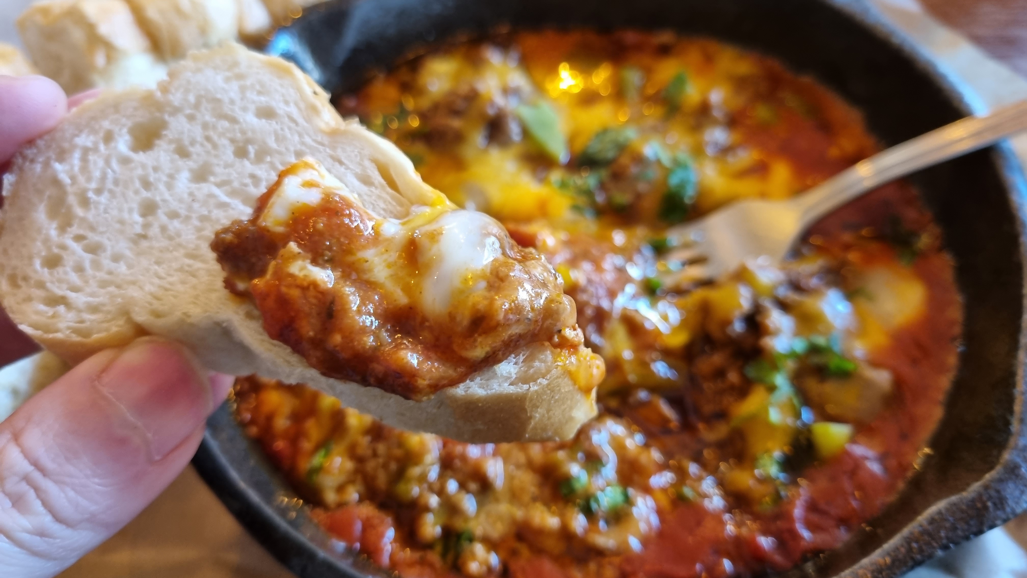 바삭한 바게뜨에 샥슈카를 얹어 먹으니 맛 좋음.