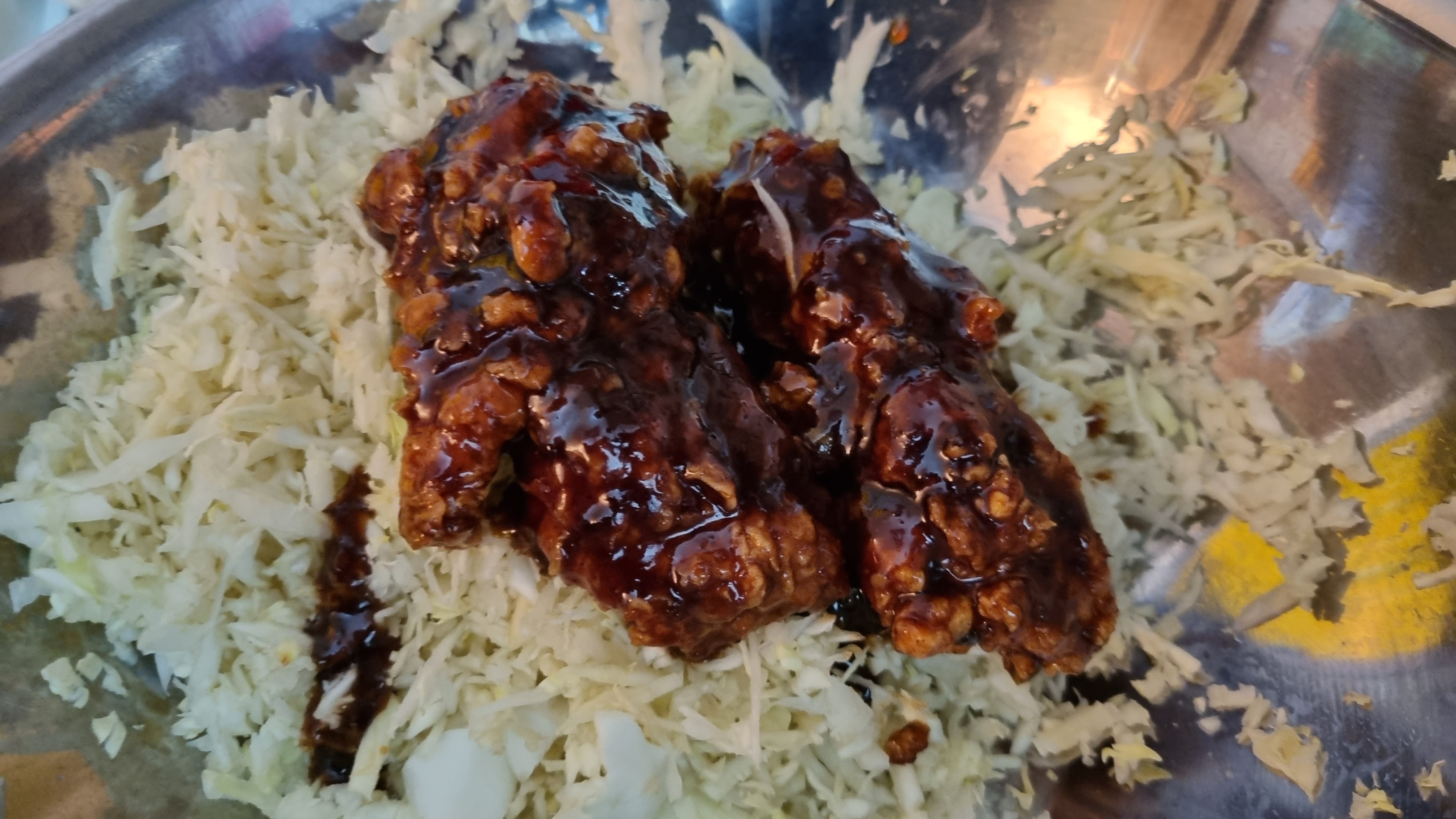 고추 콰사삭 블랙라벨(순살) 2조각에 양배추 듬뿍 갈거나 채썰어서 버무리면 됨.