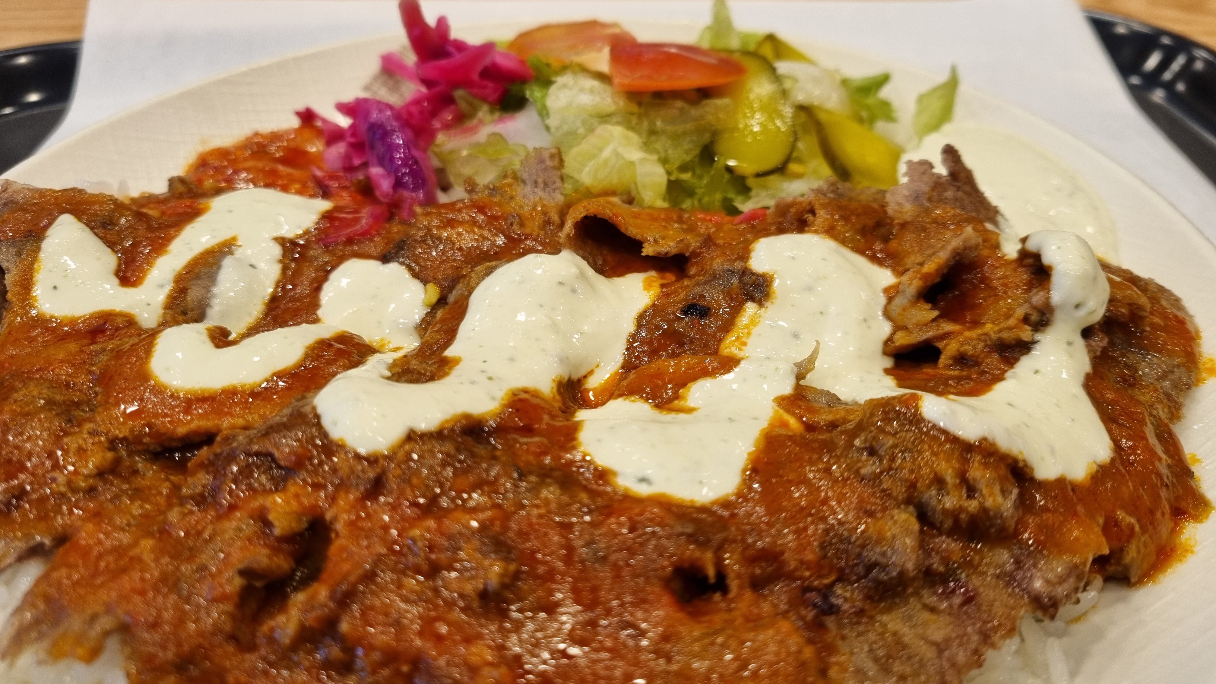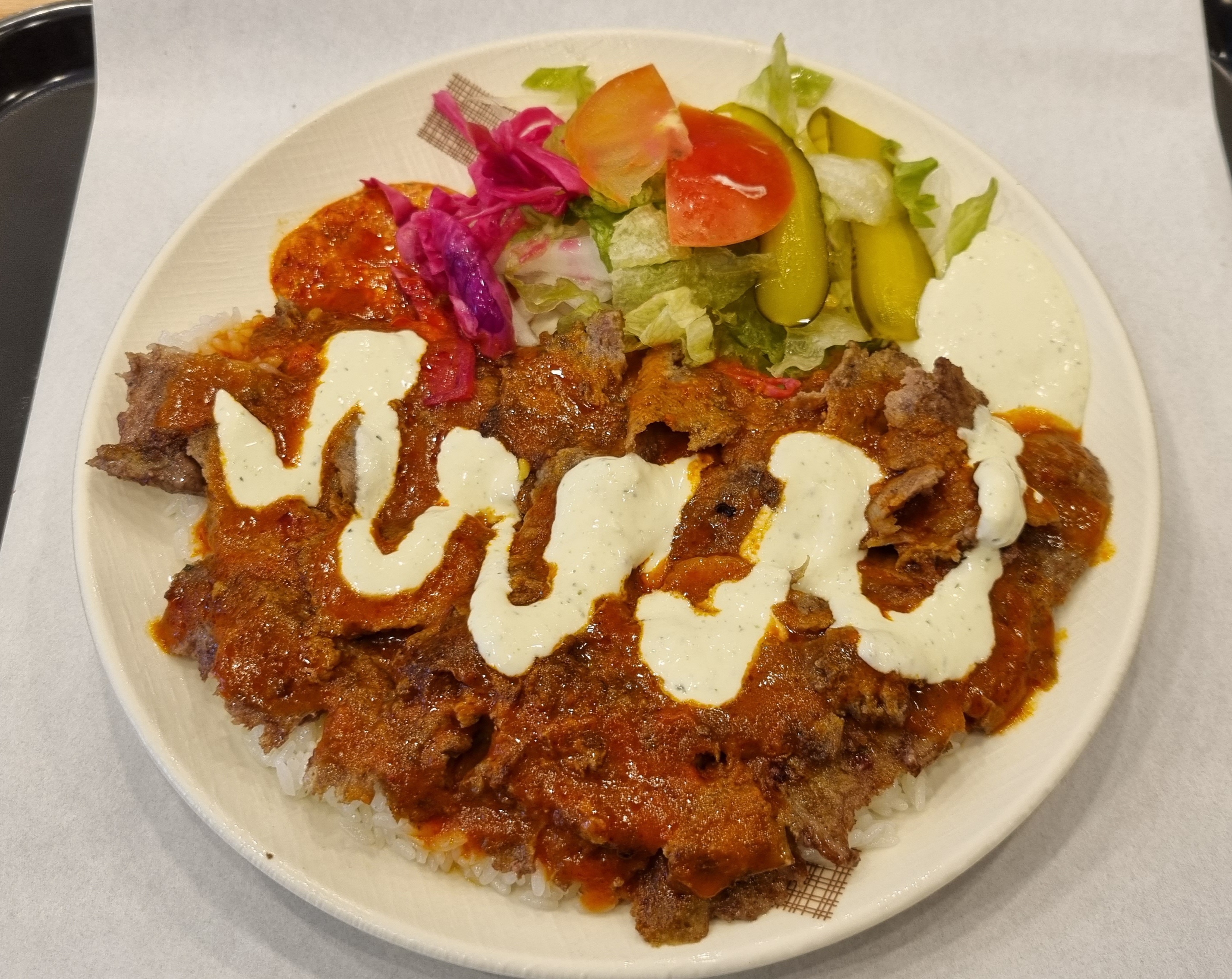 밥 위에 얇게 썬 양고기를 올리고, 그 위에 소스들을 뿌려주는 간단한(?) 요리.