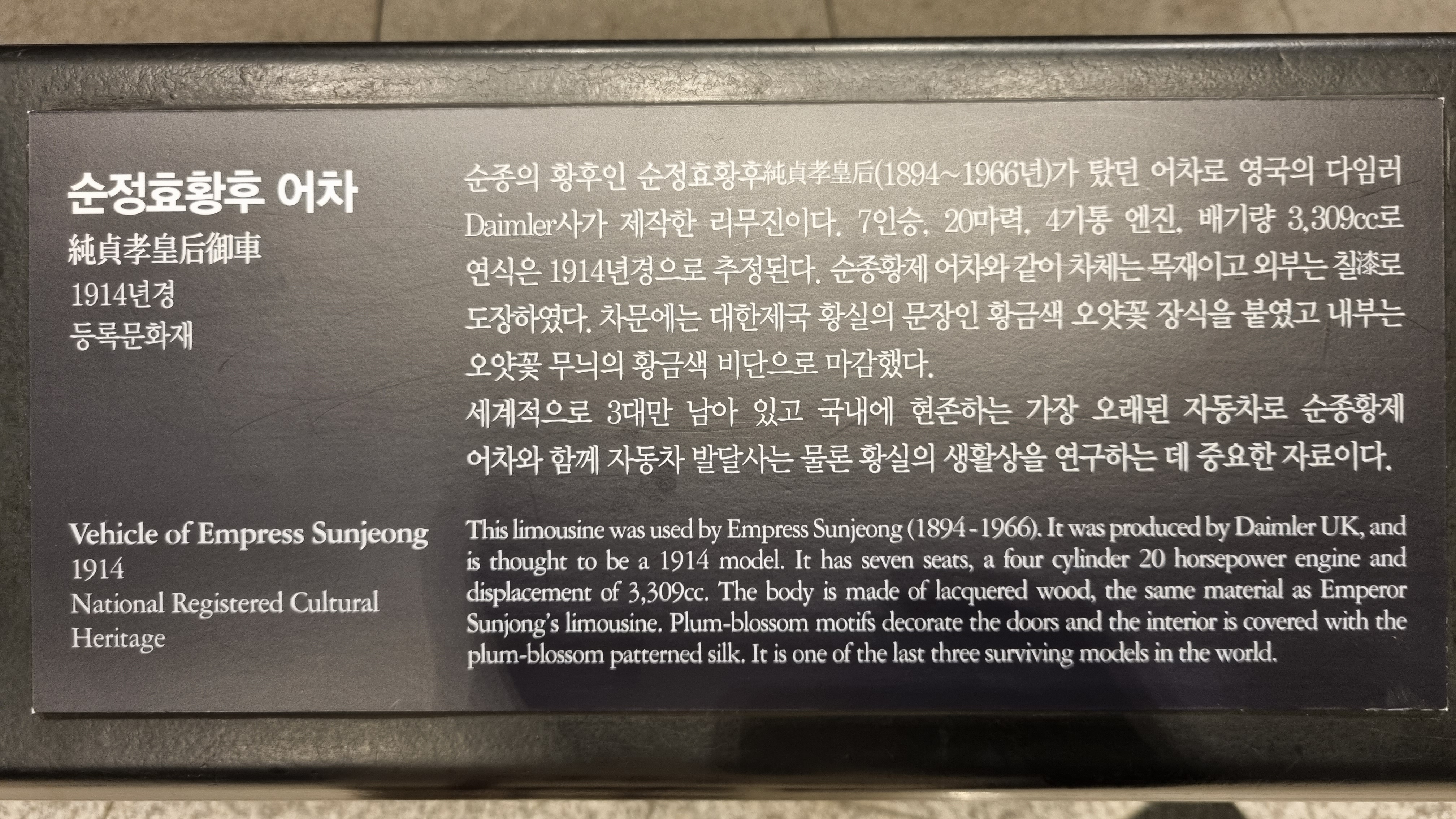 아래층으로 내려오니 순종과 그 비가 탔던 어차가 전시되어 있음.