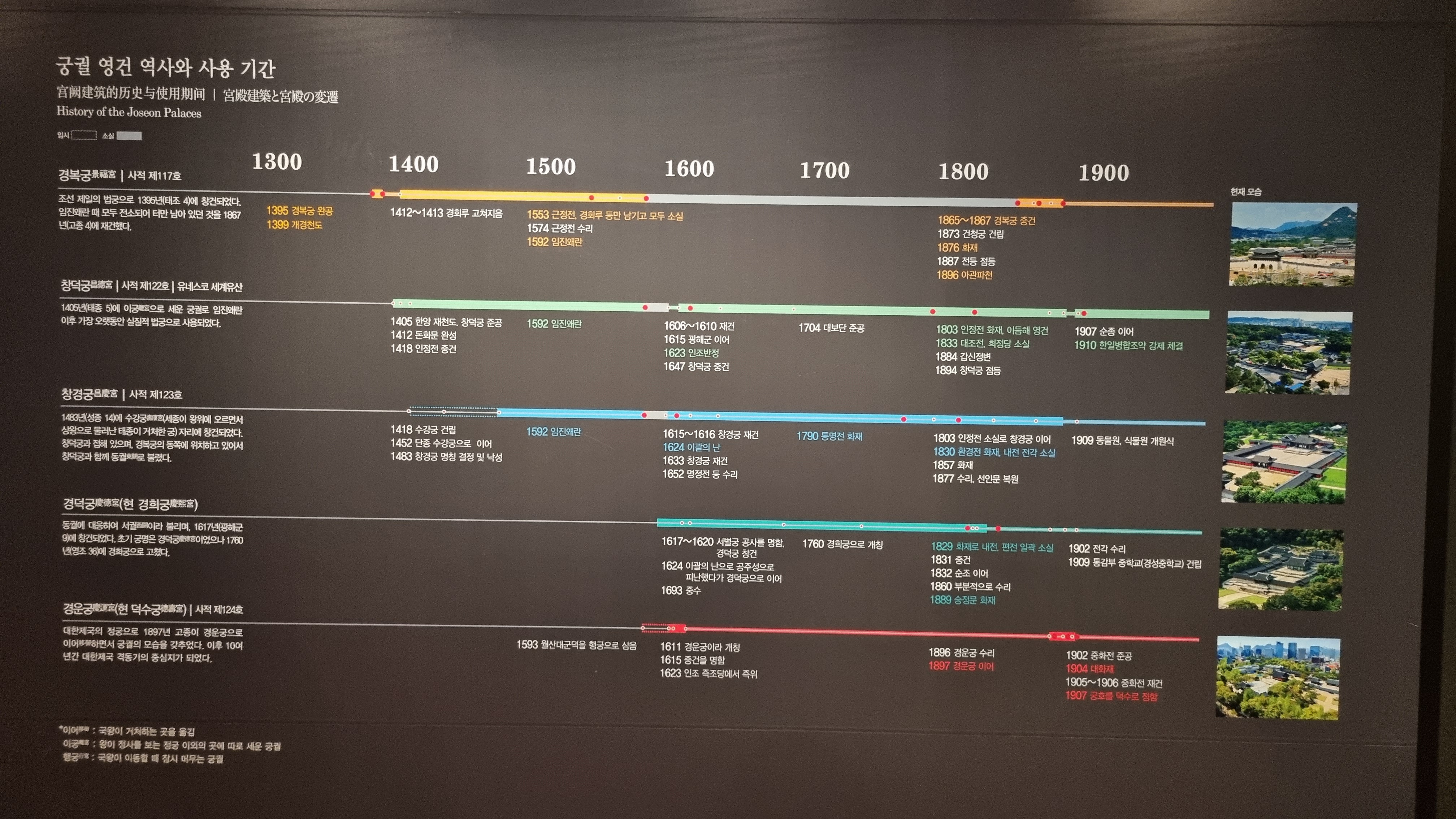 그 궁들이 어떤 시대에 주(主) 궁으로 사용되었는지, 어떤 사건이 있었는지를 보여주는 도표.