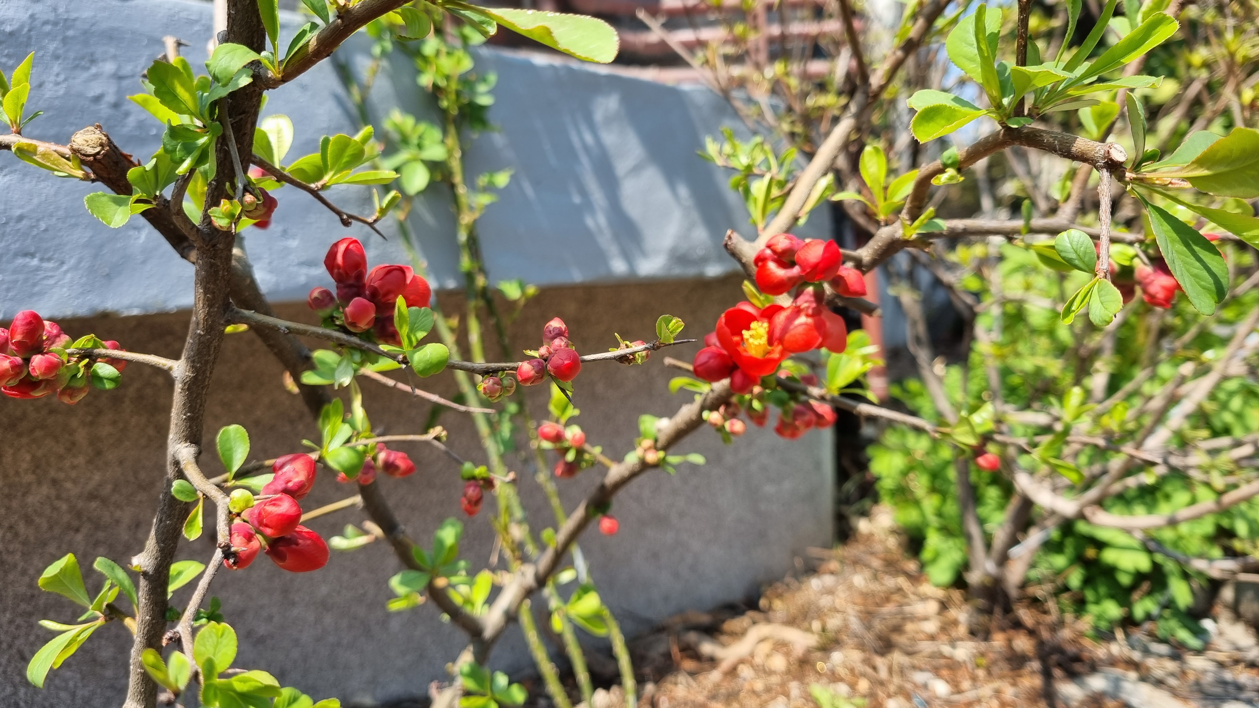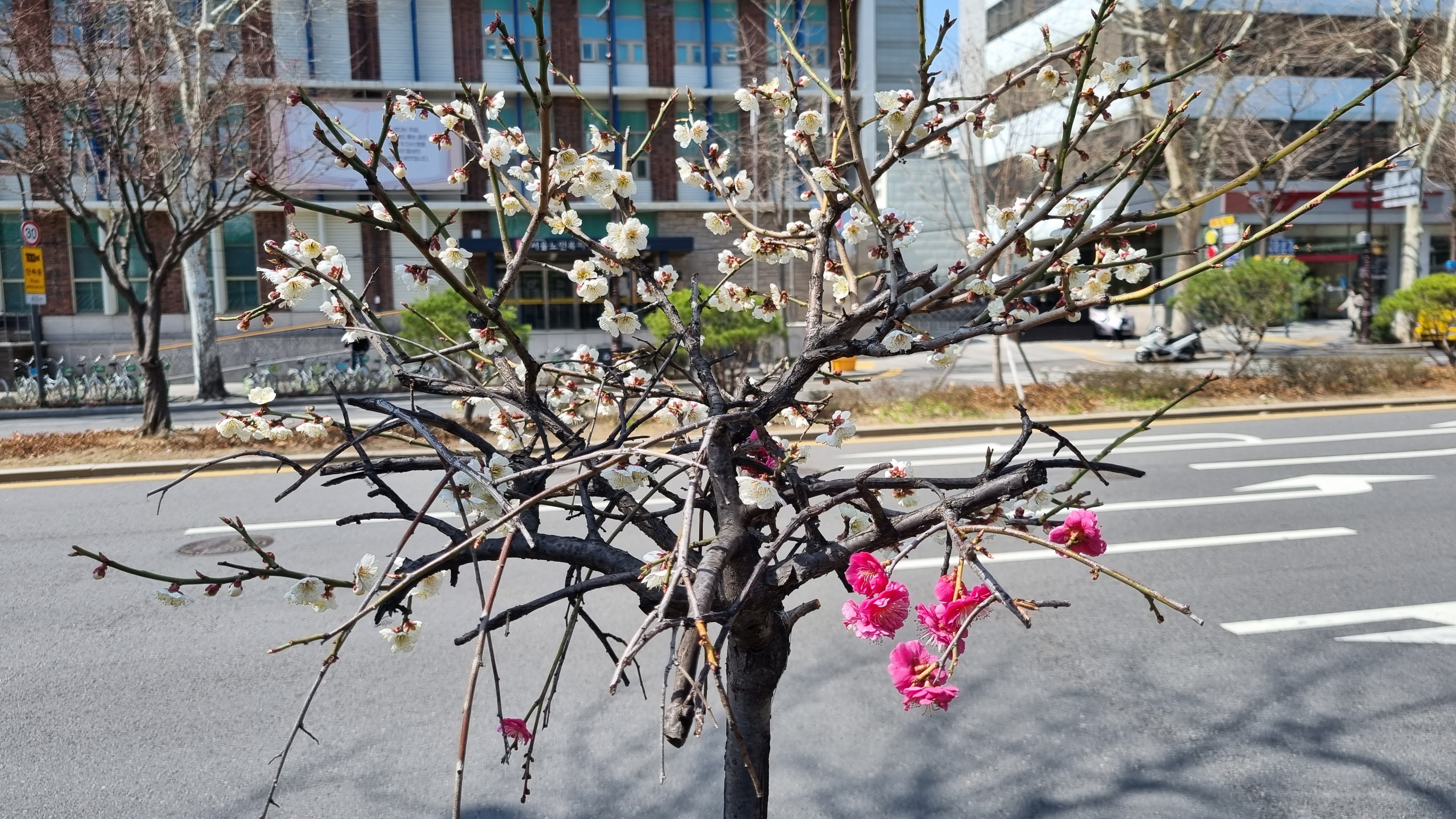 한 나무에서 백매화와 홍매화가 함께 피는 신비로운 모습.