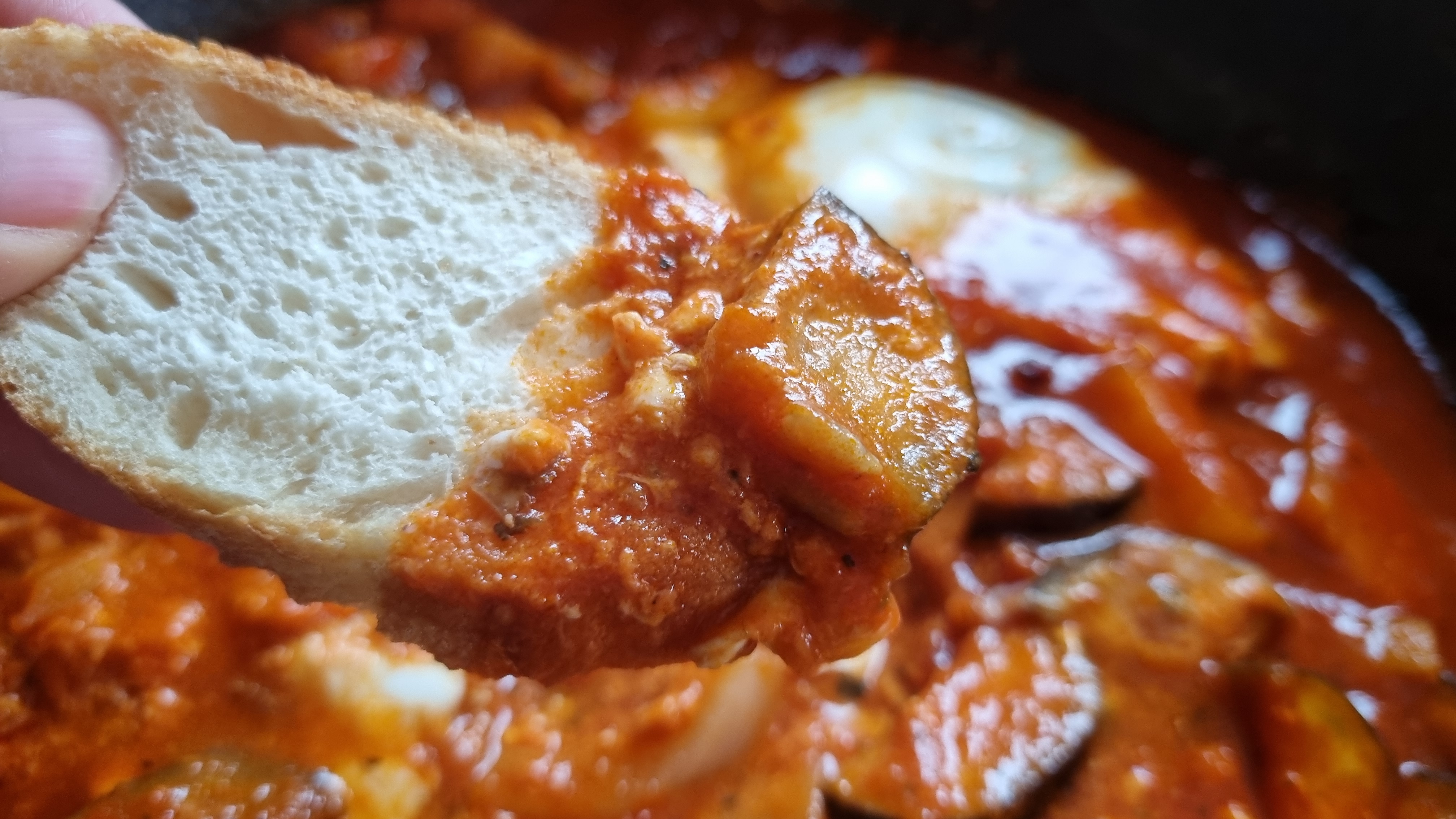 재료 : 올리브유, 편마늘, 양송이, 양파, 가지, 고추, 토마토 소스, 계란, 후추. 바게뜨.