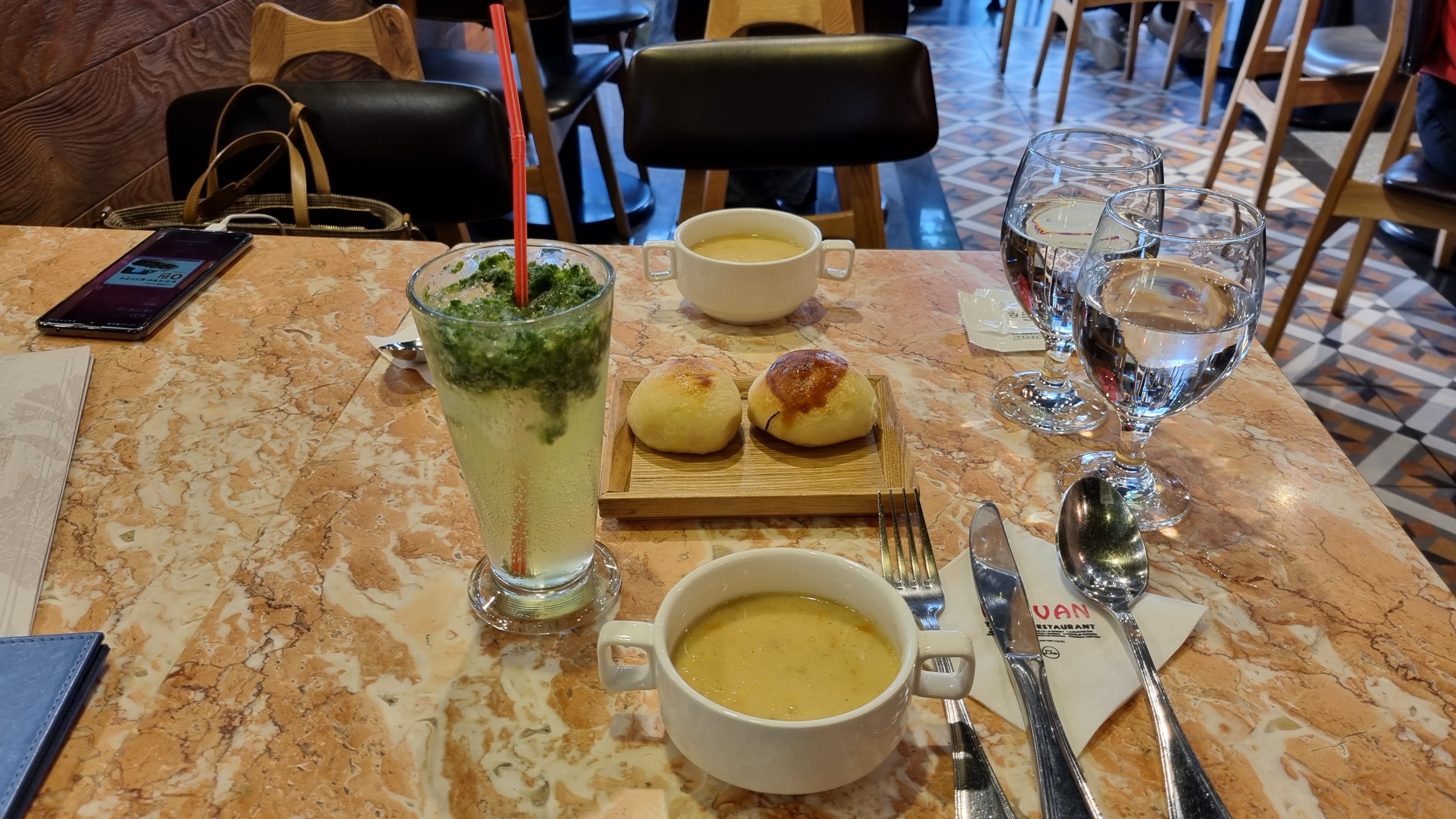 스프 안의 약간 이국적인 향이 있는 건더기들이 씹혀서 맛있었음.